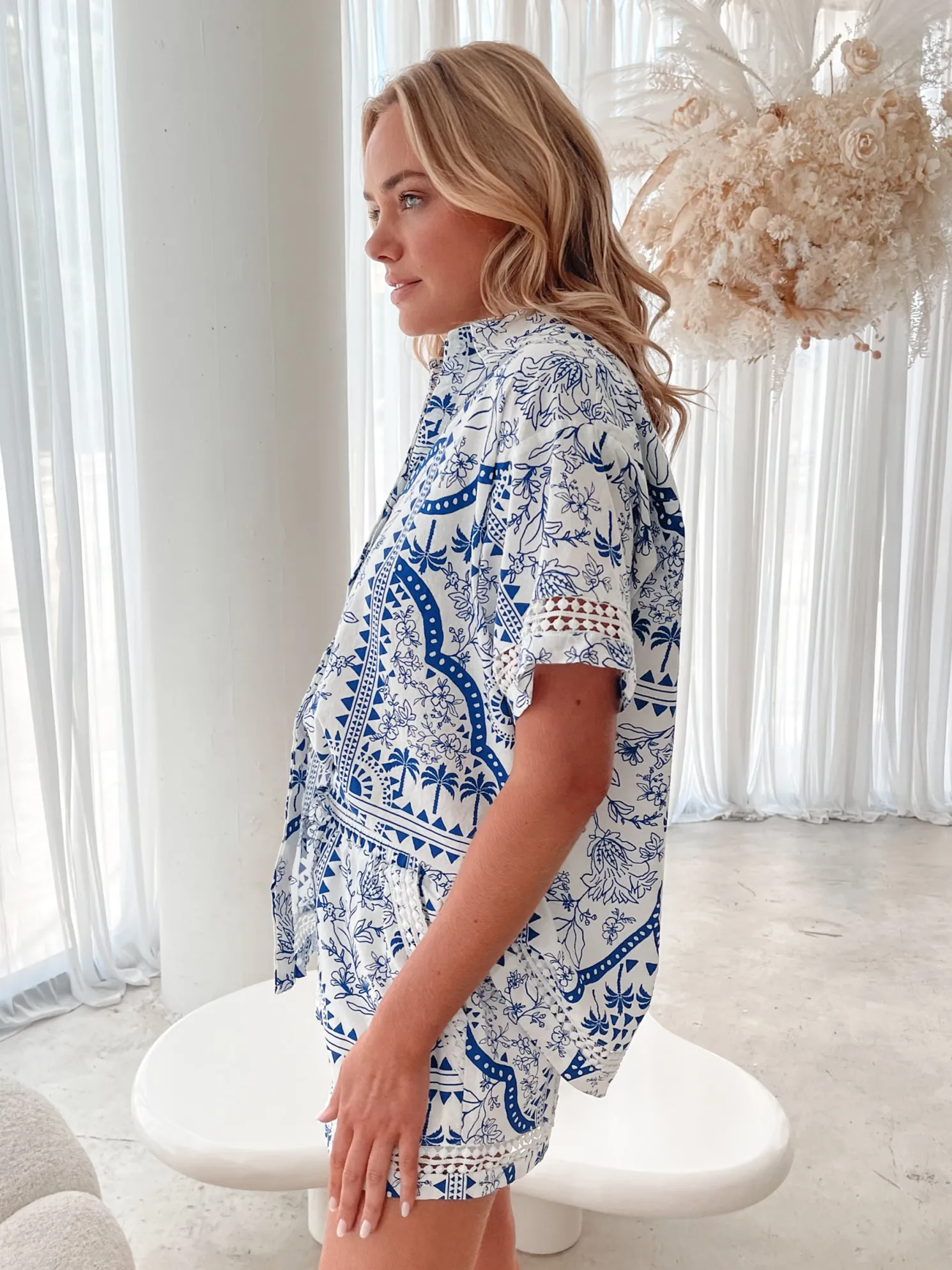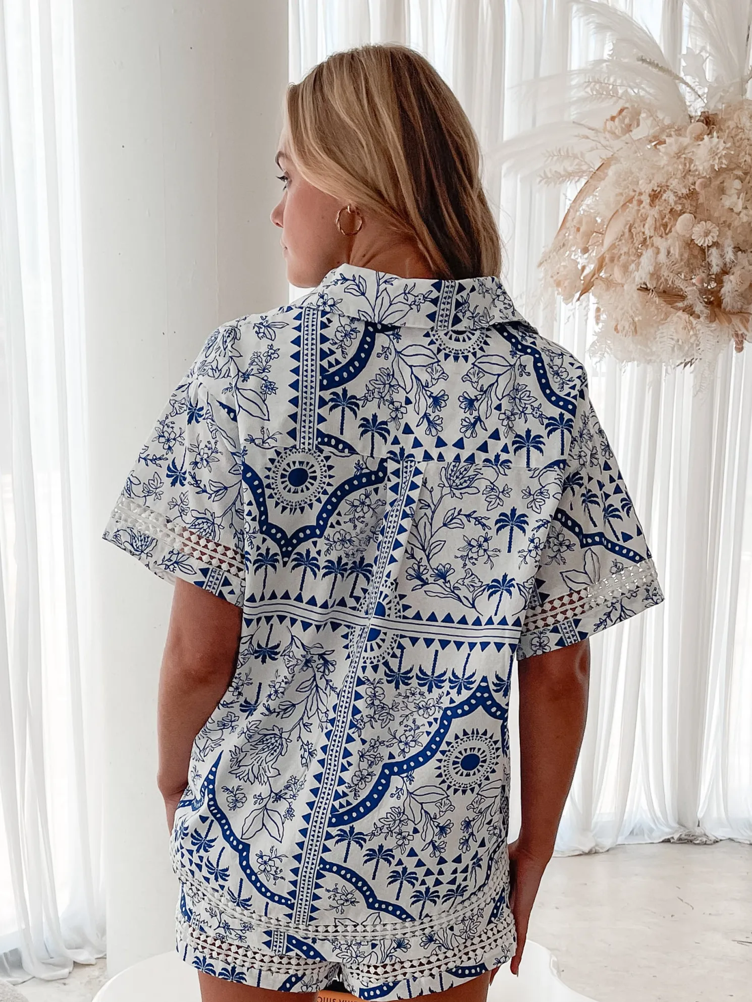 Our Aeris Shirt comes in a white base with blue toned prints. Speaking the language of art with its striking patterns, this top is designed with a classic collar, centre-front buttons, short sleeves and relaxed fit. Complete your look with the Aeris Shorts!