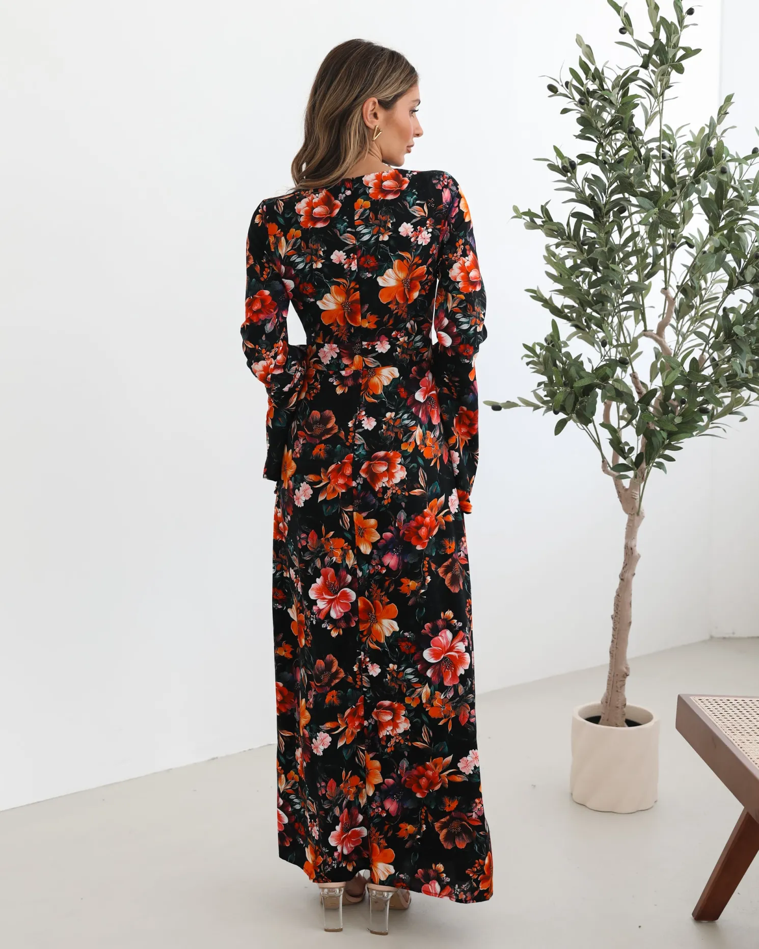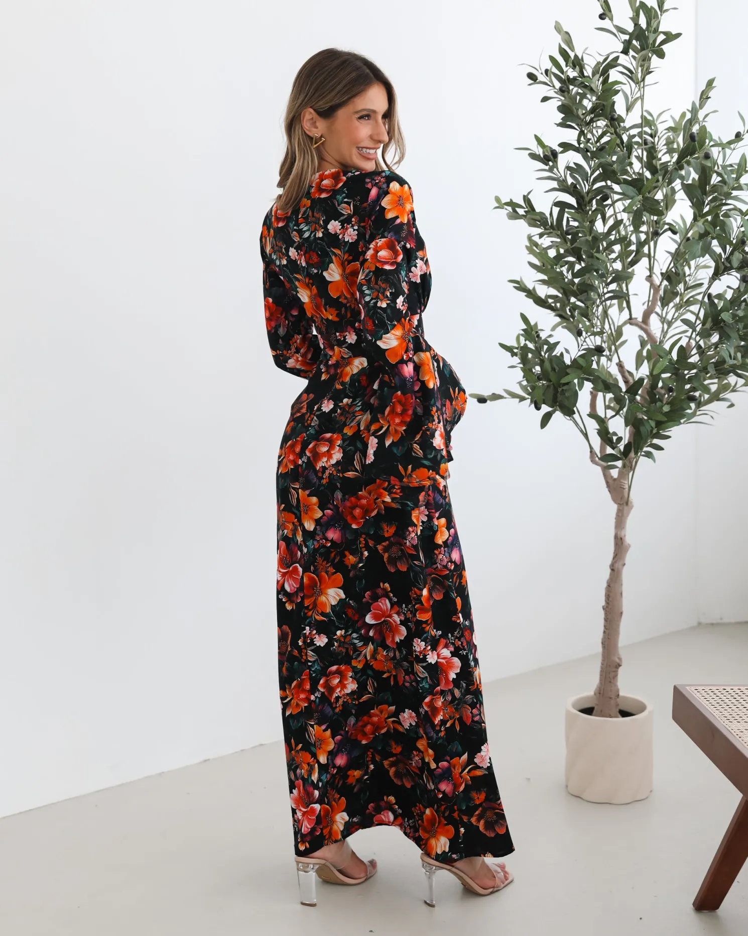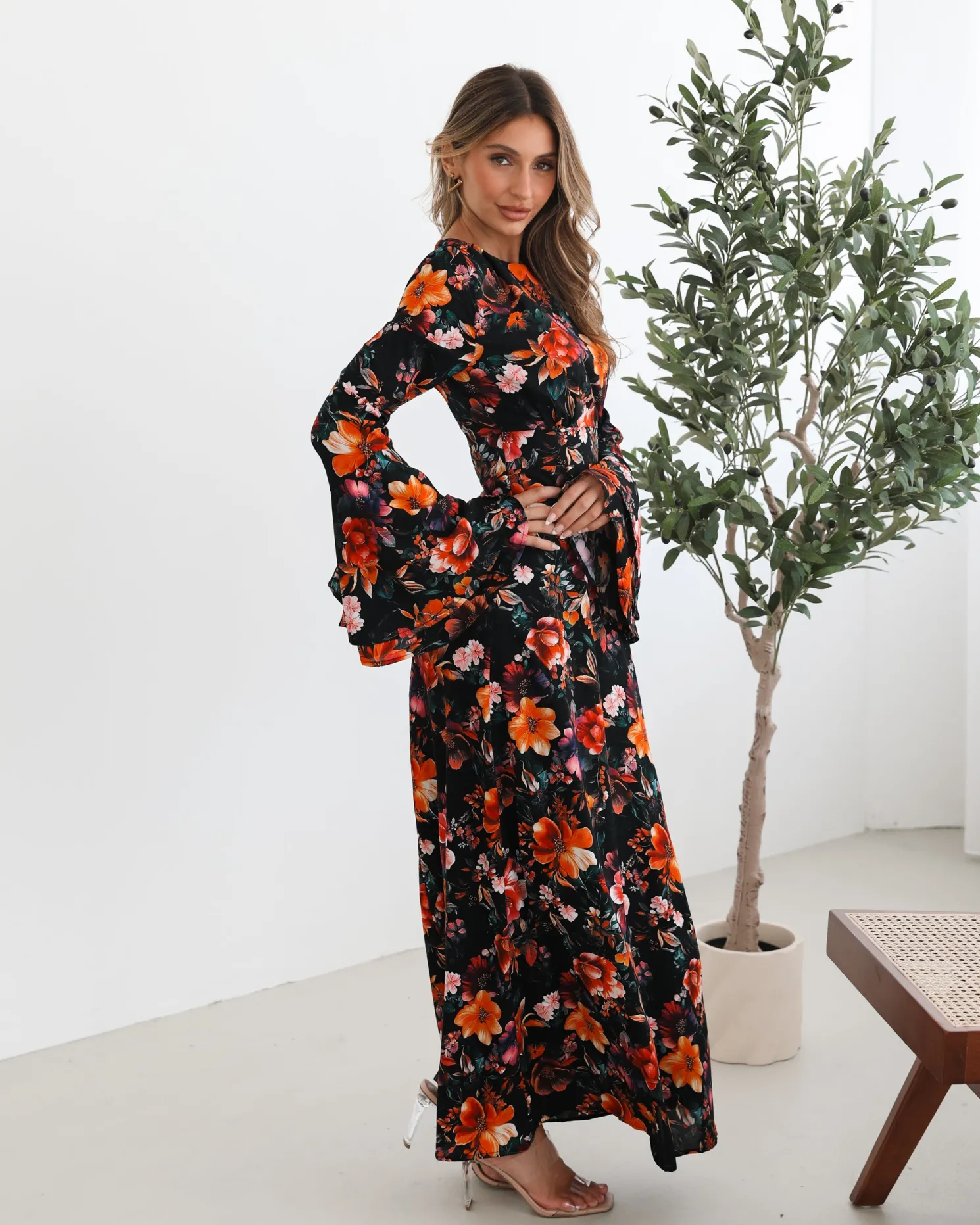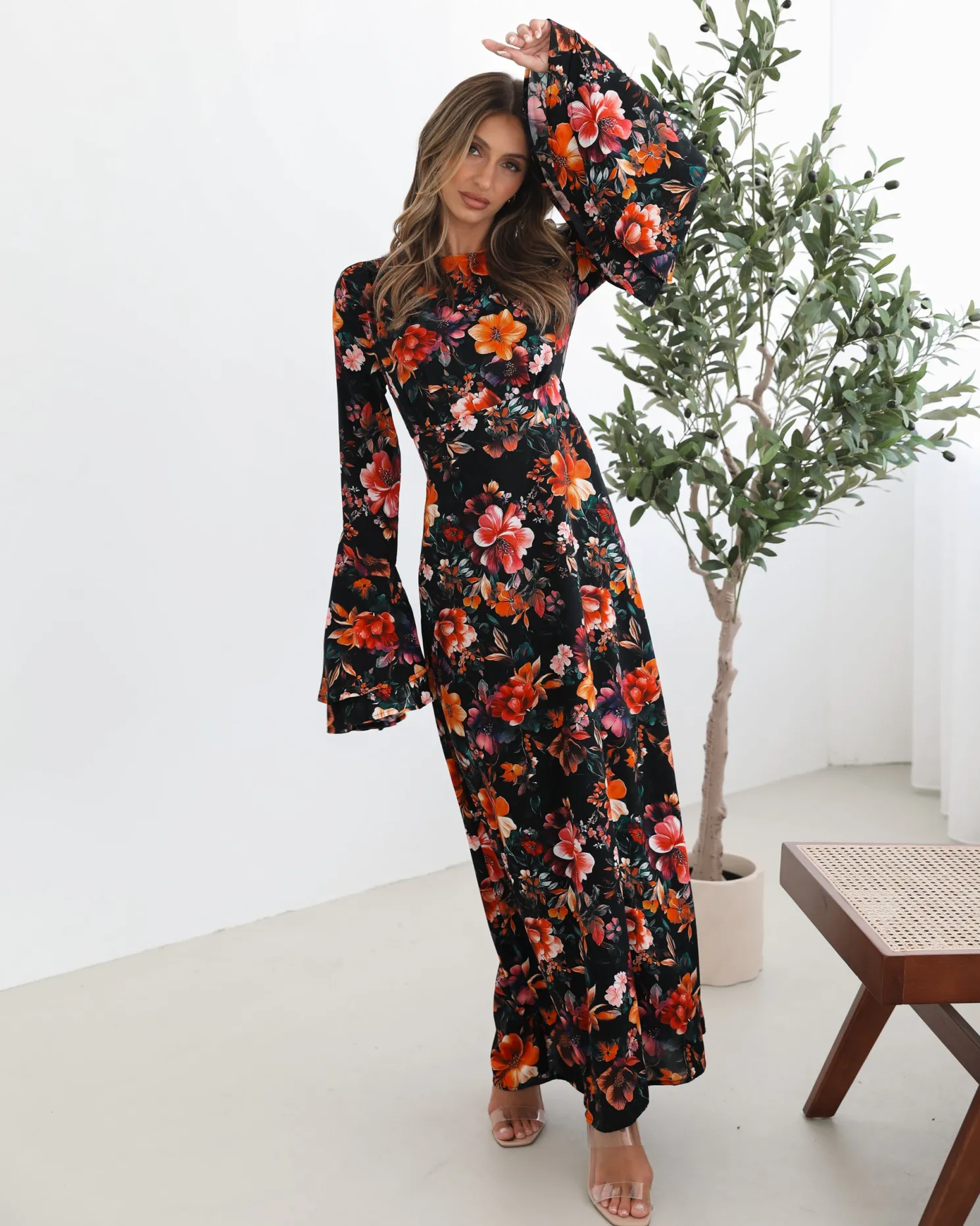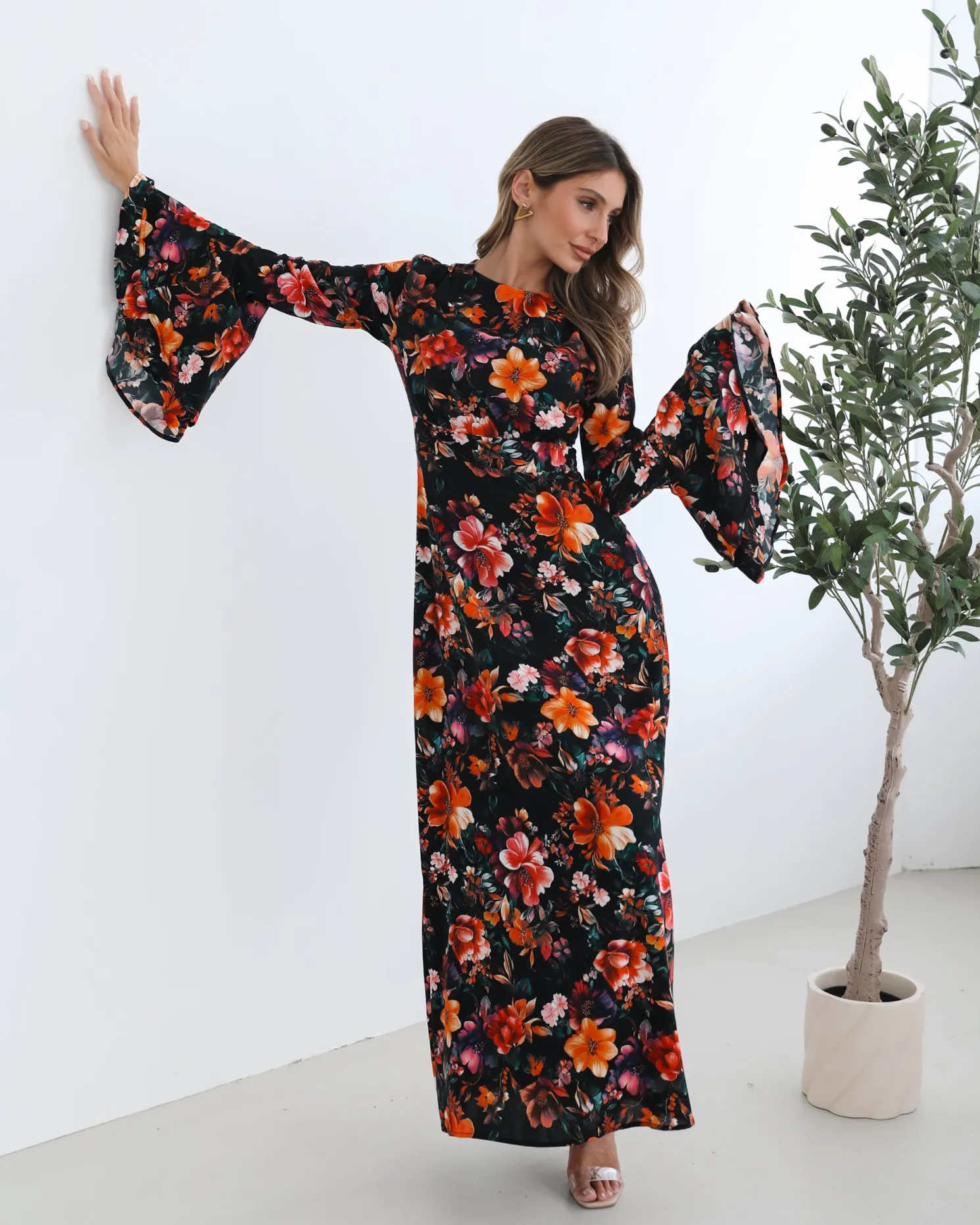 Our Amareya Dress comes in a black base with a multicoloured floral print. Making every moment feel a little more magical, this stunner is designed with a straight neckline, trumpet sleeves, flowy skirt and maxi length hem. Look classic chic with block-heel mules and a structured mini bag!