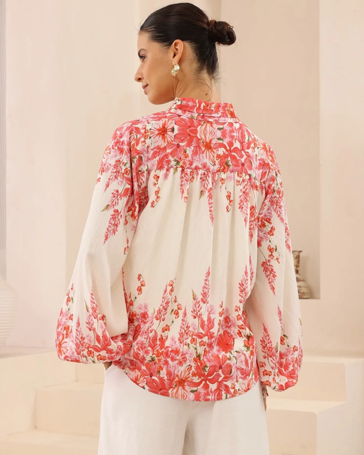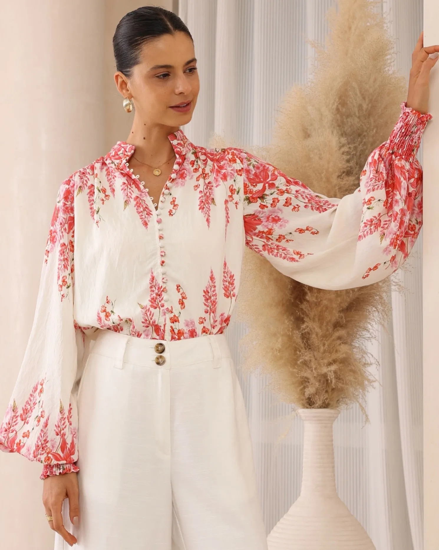 Our Avenelle Blouse comes in a cream base with pink-toned prints. All about easy femininity, this top features a collar, centre-front buttons, long balloon sleeves with smocked cuffs and floral pattern. Wear it with tailored trousers to balance the softness with structure!