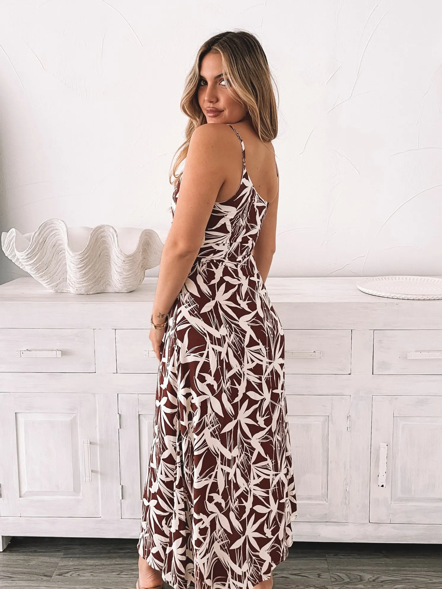 Our Catrice Dress comes in a white base and leaf prints in mocha brown colour. Look like you’re always in fashion week in this midi that features slim straps, asymmetric hemline, side waist cut out and flowy skirt. Match it with gold accessories to glam it up more!