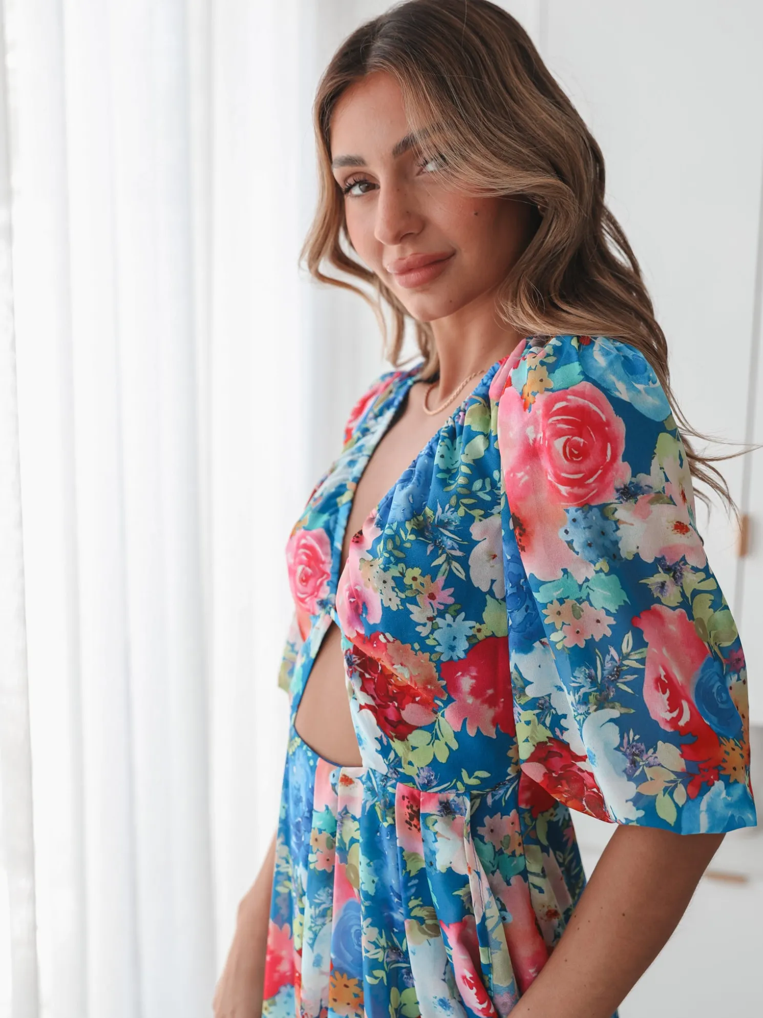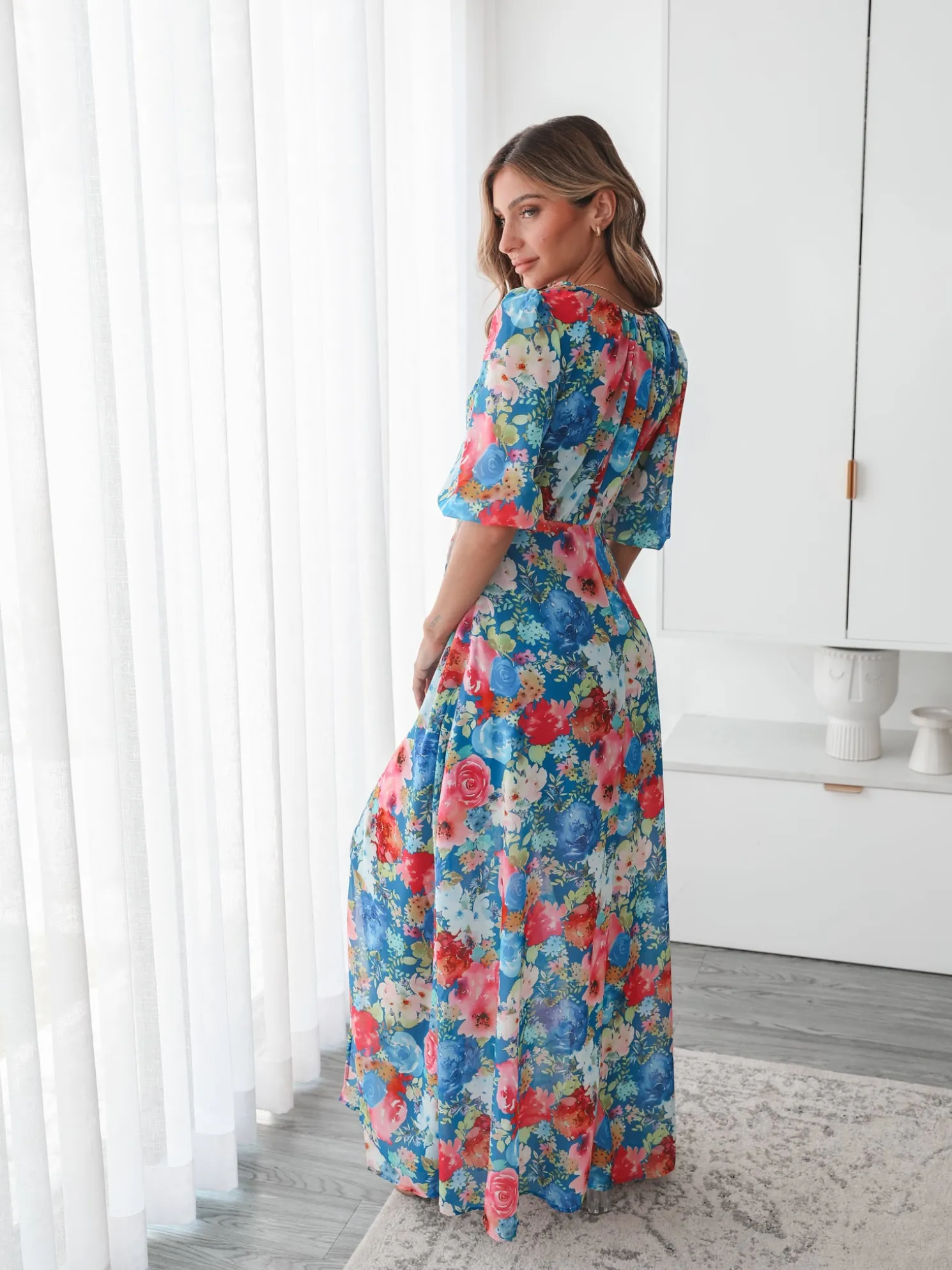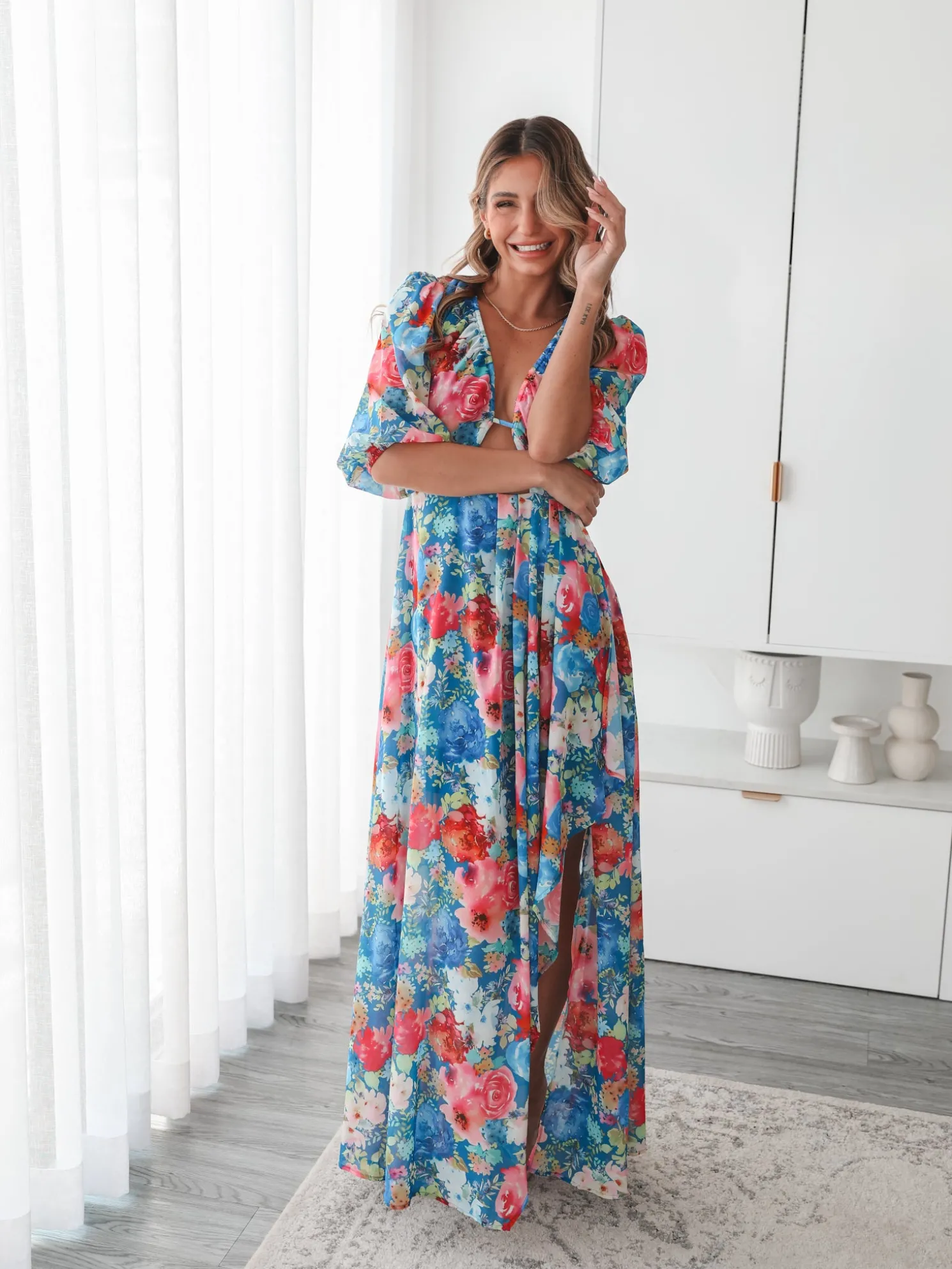 Our Delarina Dress comes in a multicoloured floral print. A feminine charm for your summer festivities, this maxi is designed with a v-neckline, cut out on waist, puff sleeves and a-line skirt with slit. Style with gladiator heels!