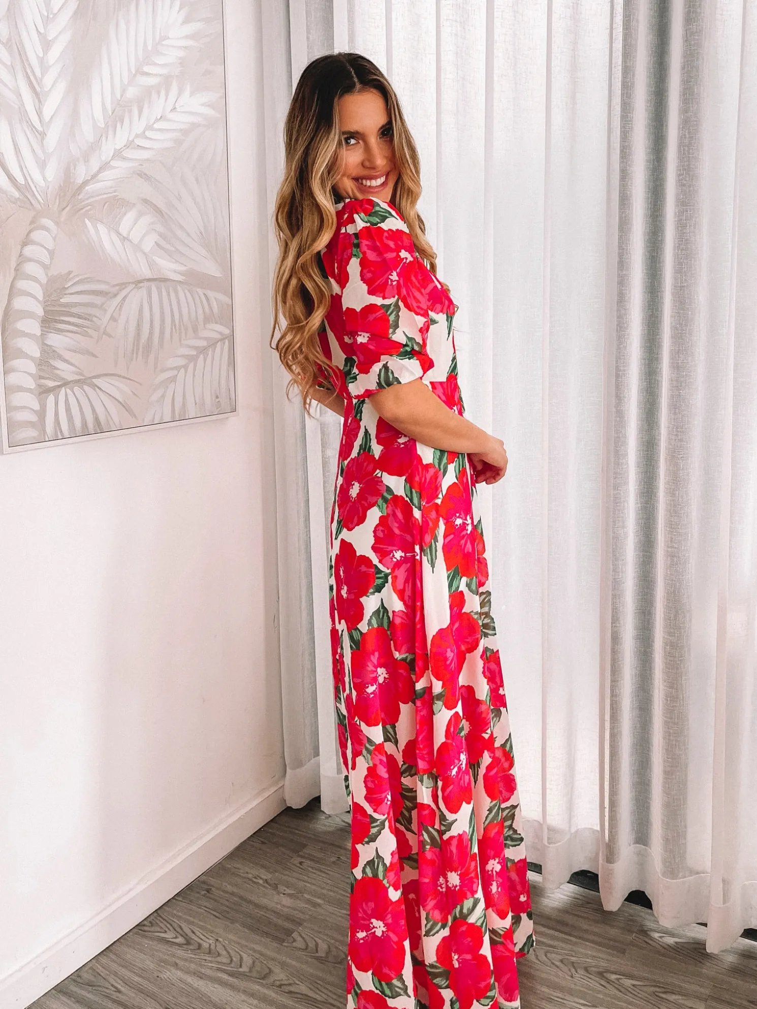 Our Delarina Dress comes in a white base with floral prints in pink colour. A feminine charm for your summer festivities, this maxi is designed with a v-neckline, cut out on the waist, puff sleeves and a-line skirt with a slit. Style with gladiator heels!