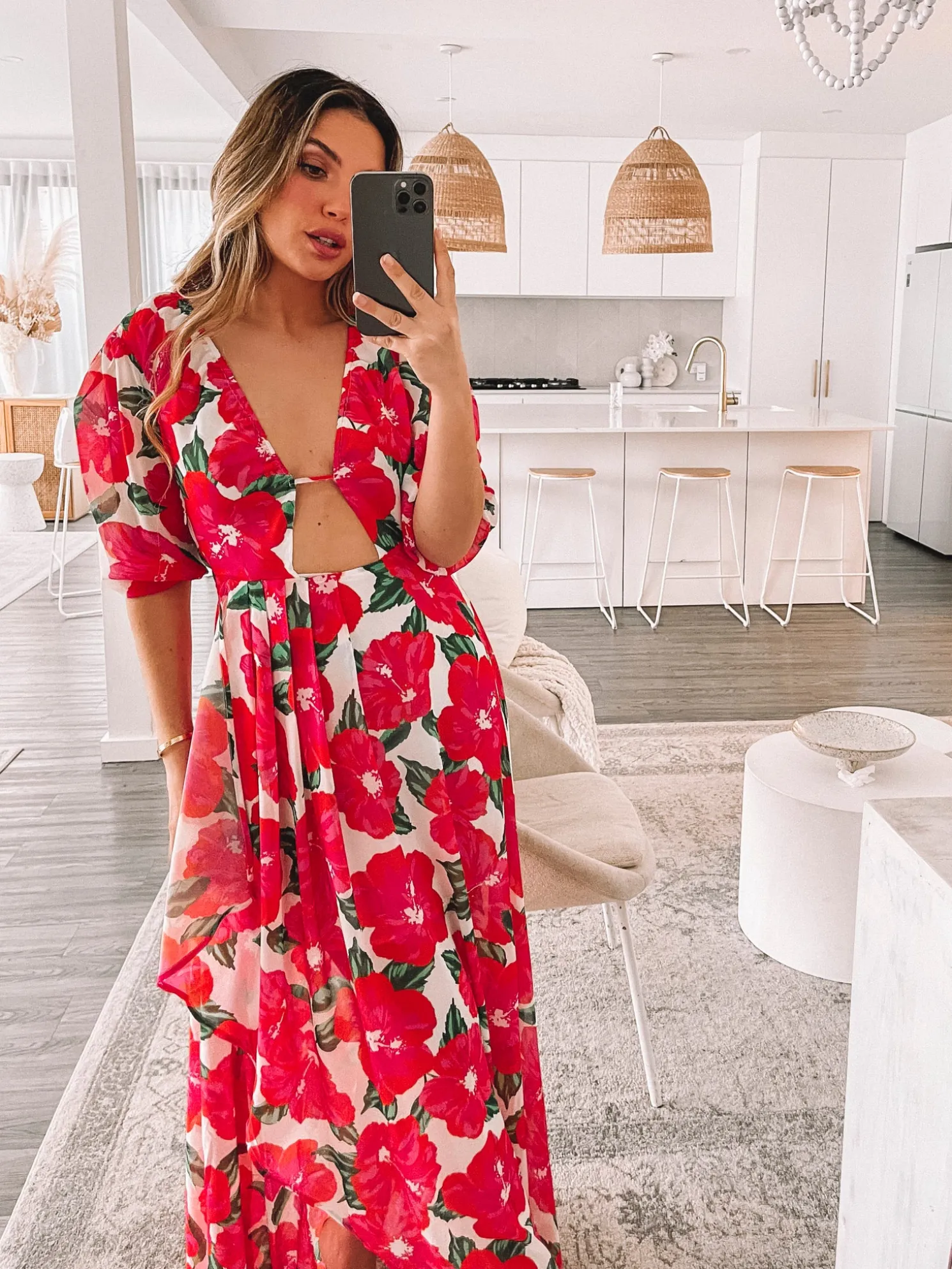 - Key Features: V-neckline. Cut out on the waist. Puff sleeves. A-line skirt with slit. Maxi length.