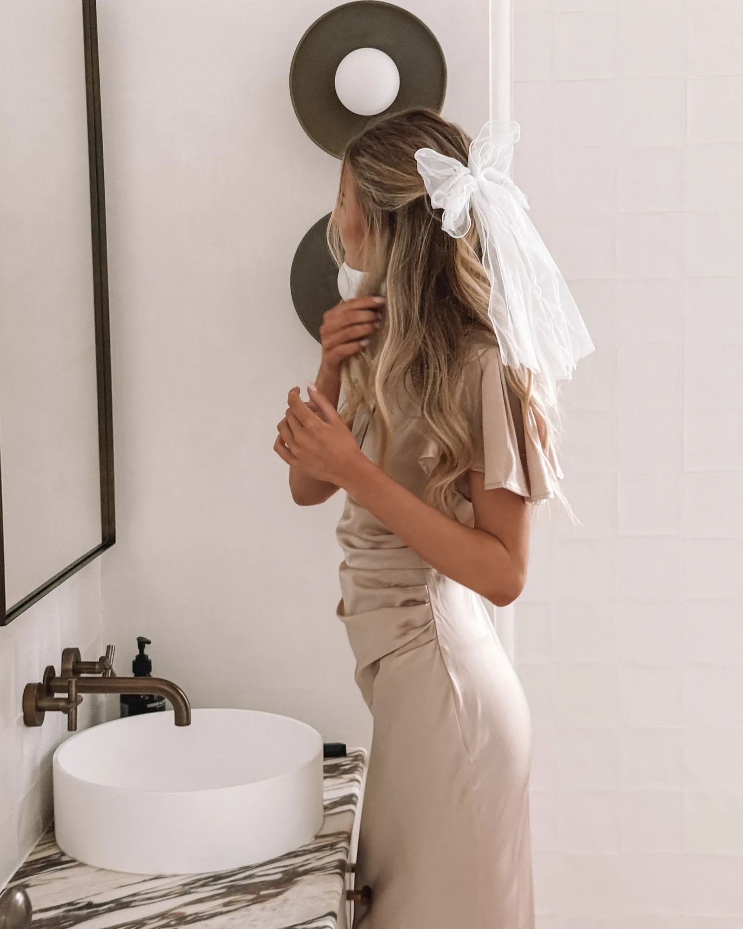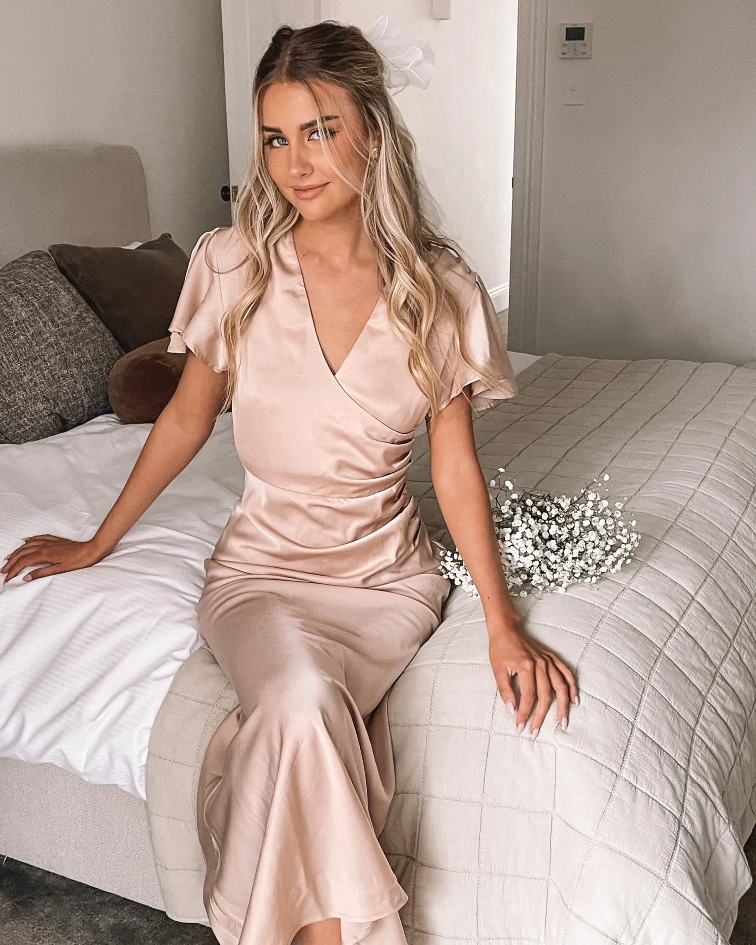 Our Doren Dress comes in a stunning champagne tone. This maxi features a V-neckline, short butterfly sleeves, and gathered detailing on the side of the bust and skirt. This effortless piece pairs so easily with heels for a date night look!