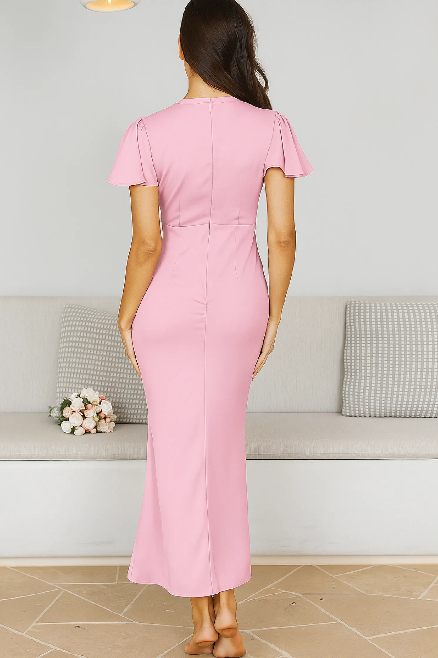 - Key Features: Maxi length. Slim fit. V neckline. Short butterfly sleeves. Gathered fabric on the shoulder.