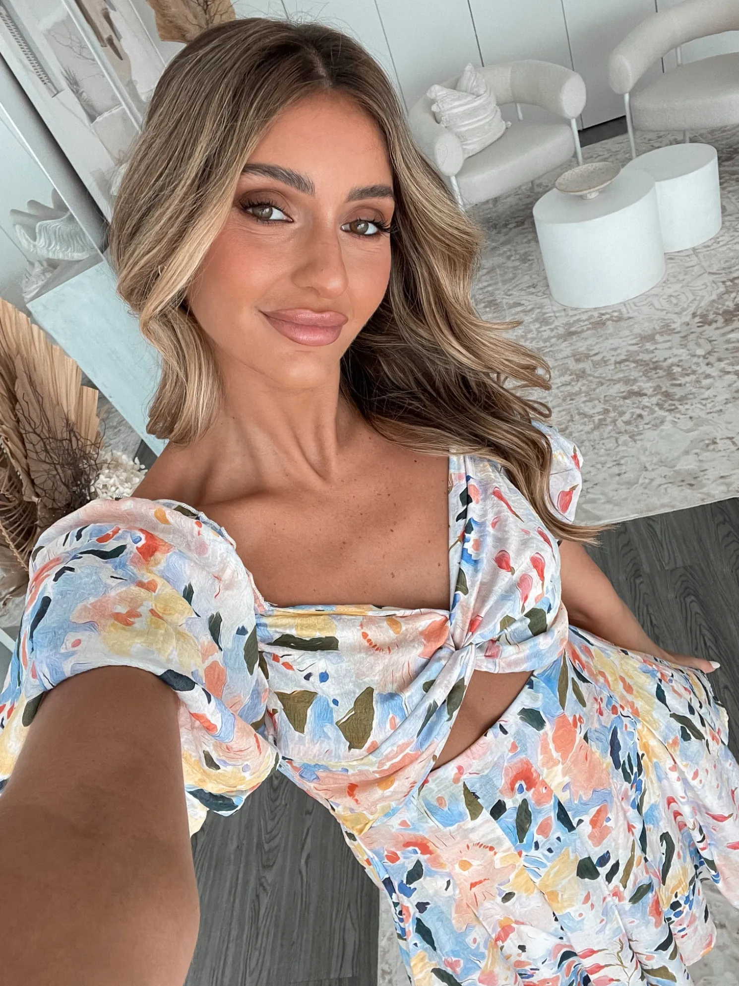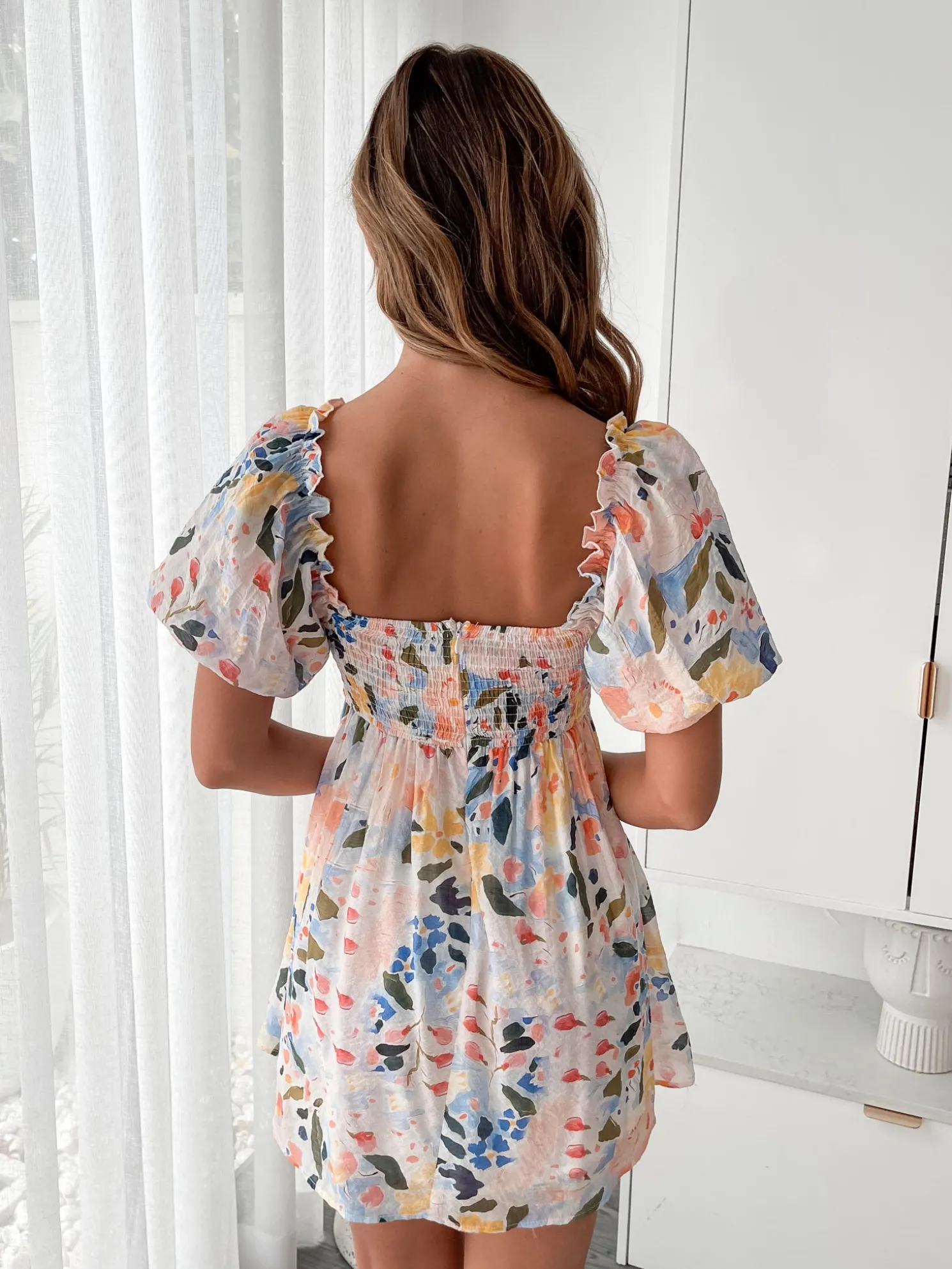 Our Elindra Dress comes in a blue base with multicoloured prints. Fresh, feminine and full of charm, this piece is designed with frilled short sleeves, sweetheart neckline, cutout on waist, pleated skirt and mini length hem. Style it with your favorite sandals for a more relaxed, chic look!