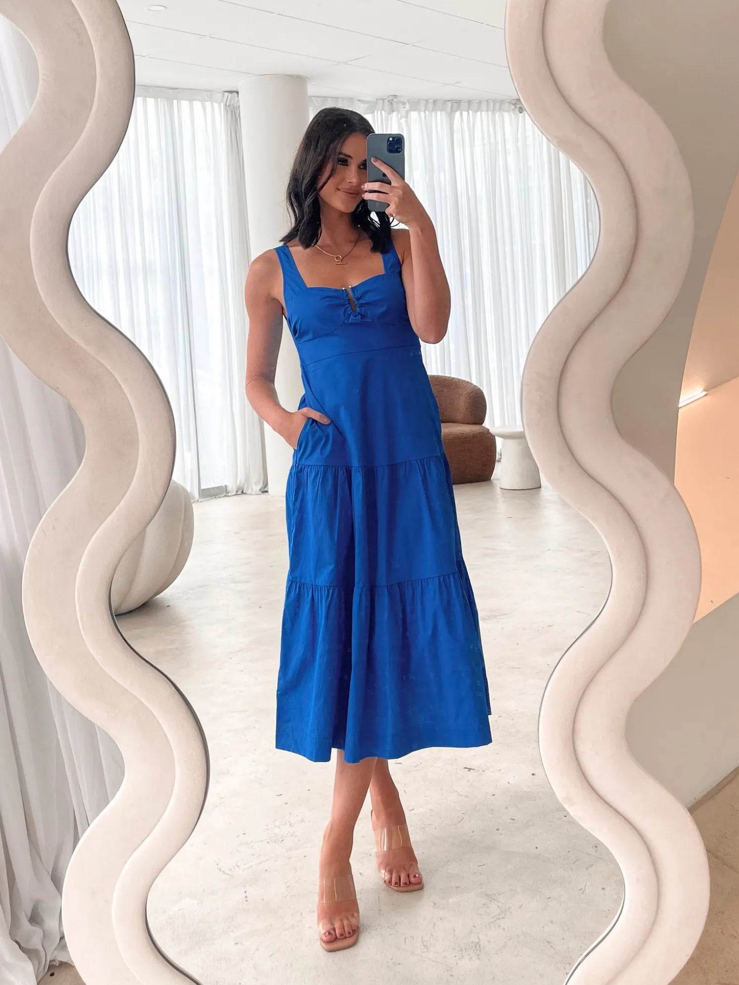 Our Eline Dress comes in a cobalt blue colour. A pop of drama that will excite you, this piece is designed with a sweetheart neckline with a metal u ring, flowy tiered skirt and midaxi length hem. Be the prettiest in the room with a hair accessory and high heels!