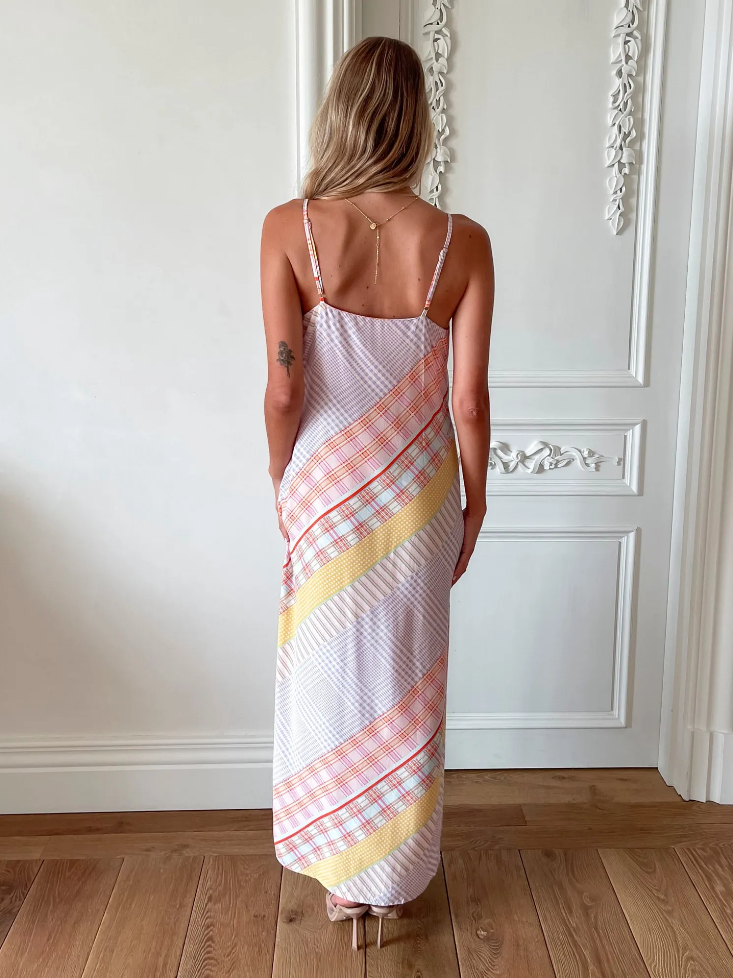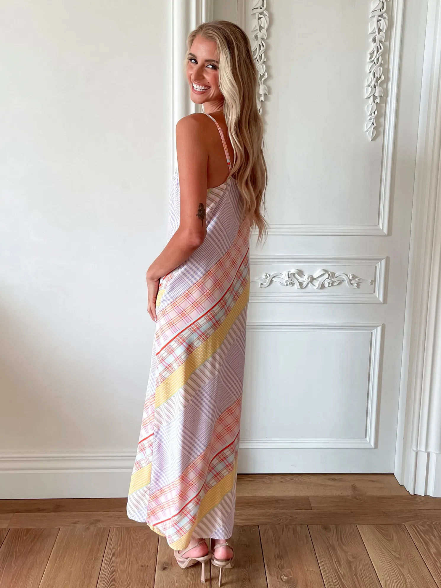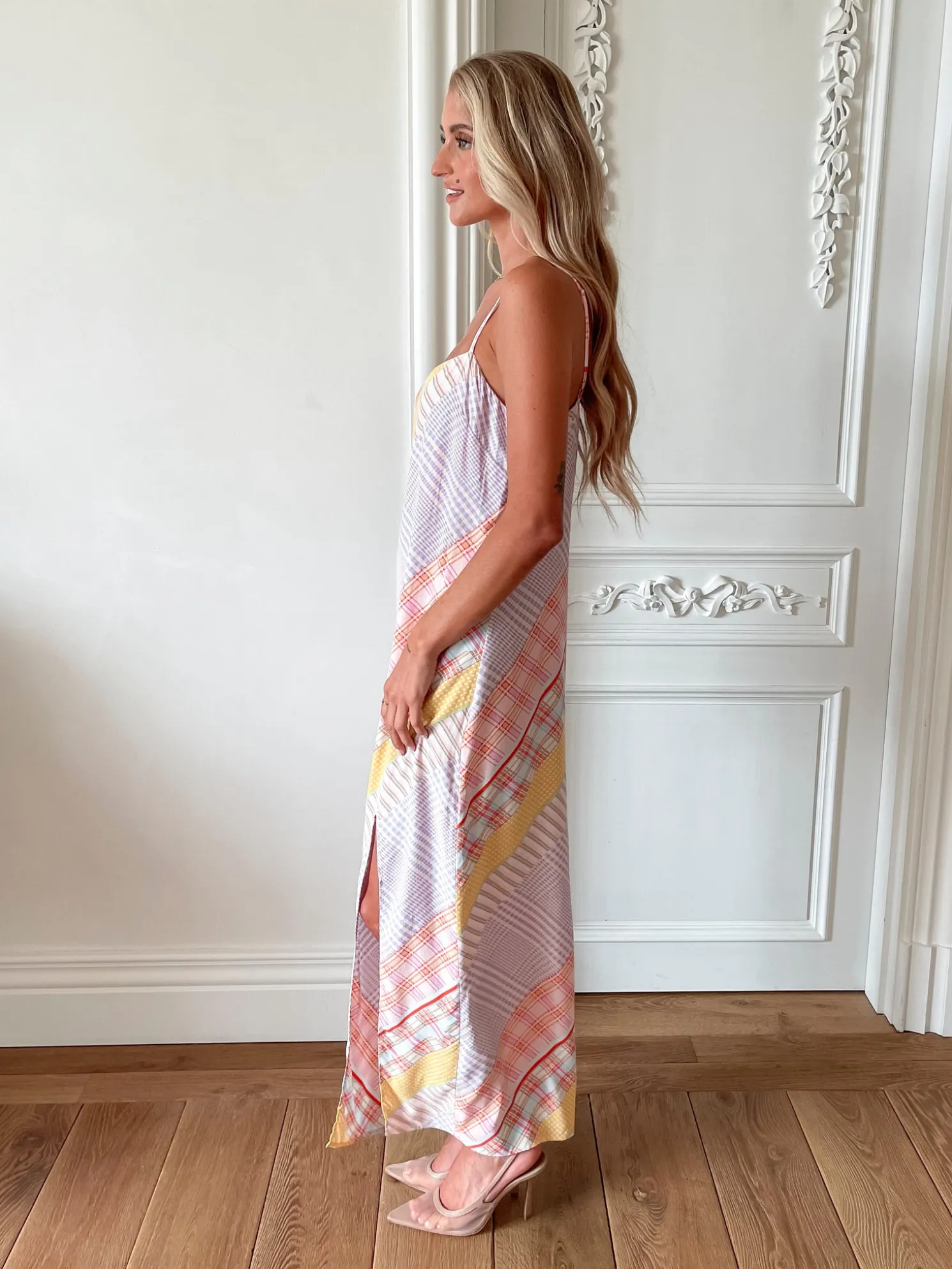Our Emrie Dress comes in a multitoned print. With the playful mix of colours dancing across the fabric, the detailing creates a lively, one-of-a-kind look! It features thin straps, square neckline, slip silhouette, side slit and maxi length hem that perfectly pair with flat sandals!