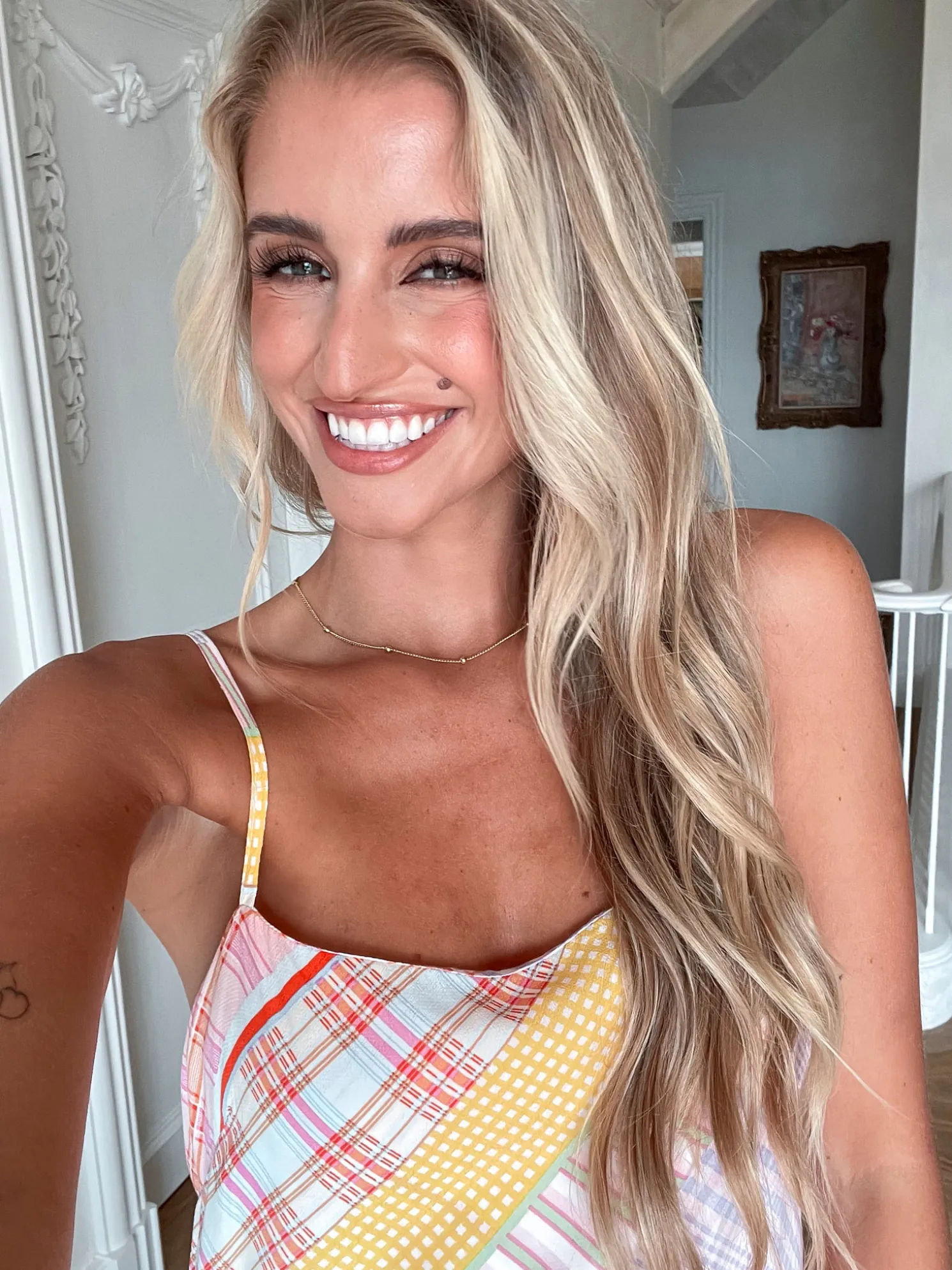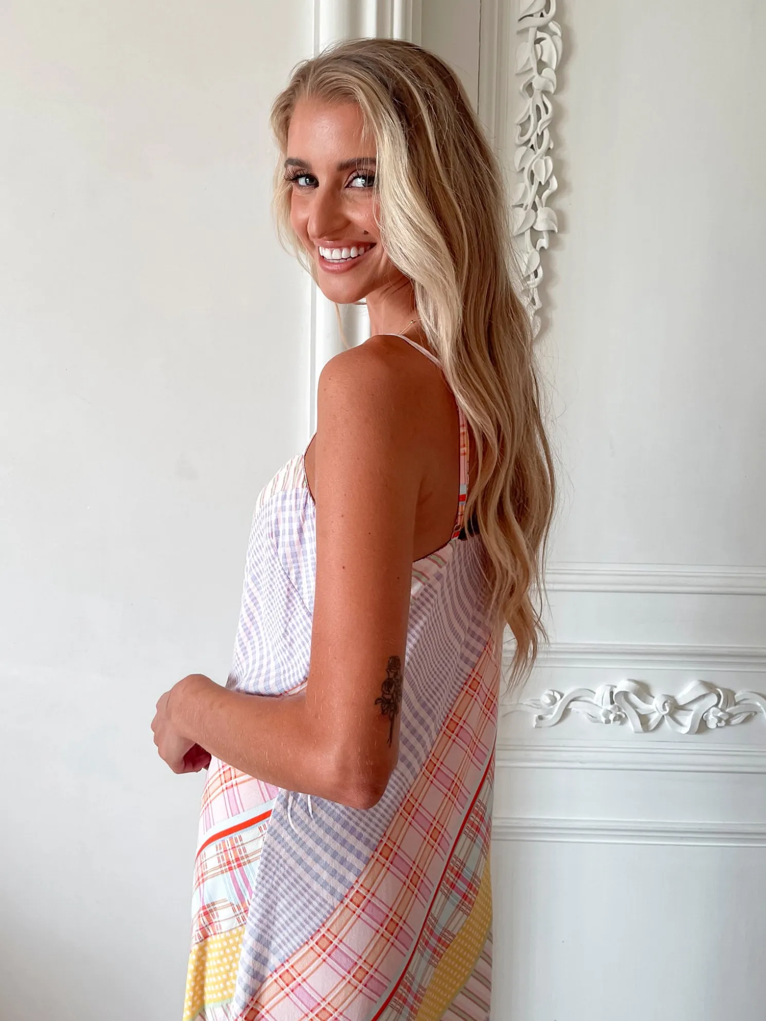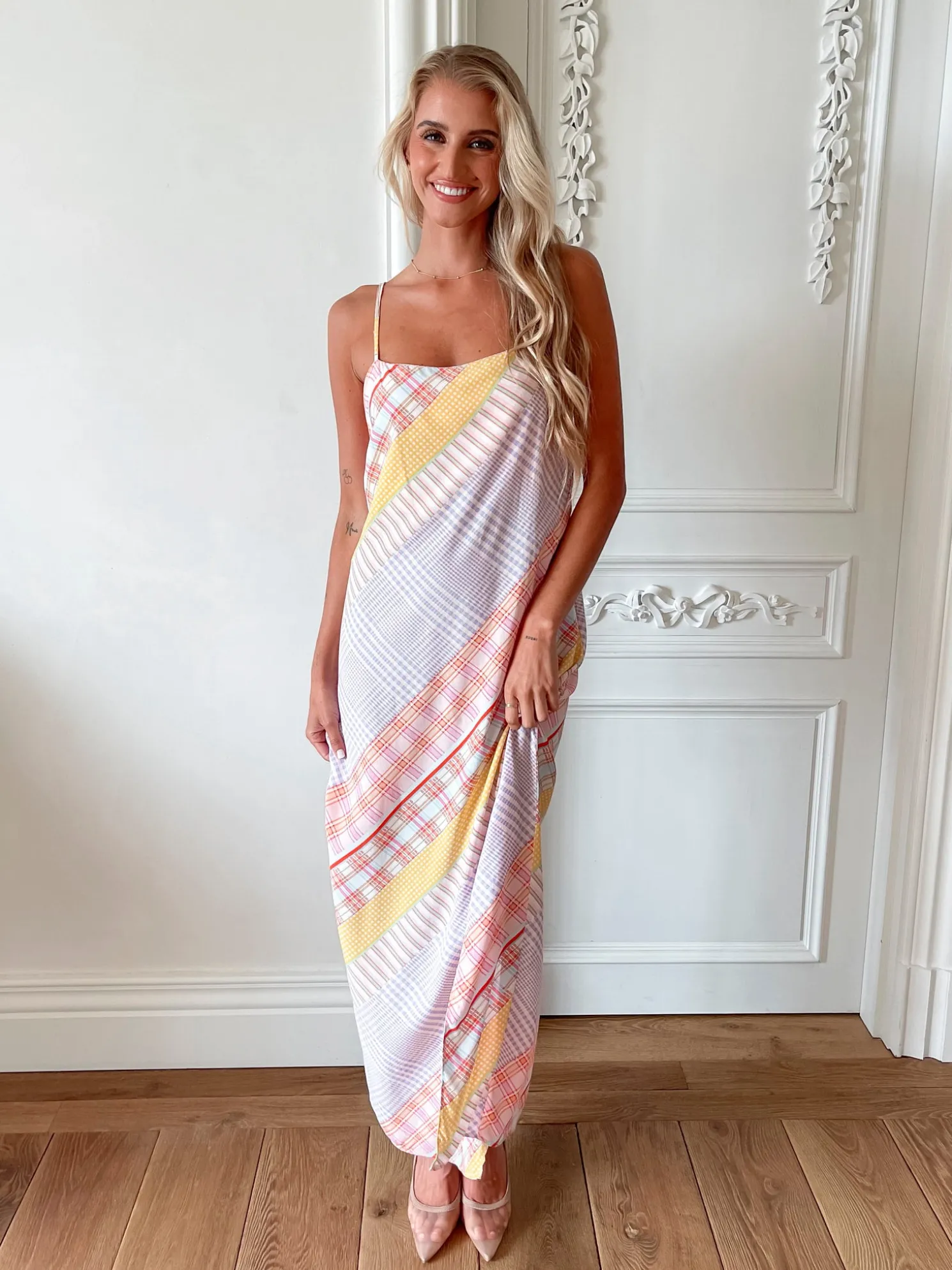 Our Emrie Dress comes in a multitoned print. With the playful mix of colours dancing across the fabric, the detailing creates a lively, one-of-a-kind look! It features thin straps, square neckline, slip silhouette, side slit and maxi length hem that perfectly pair with flat sandals!