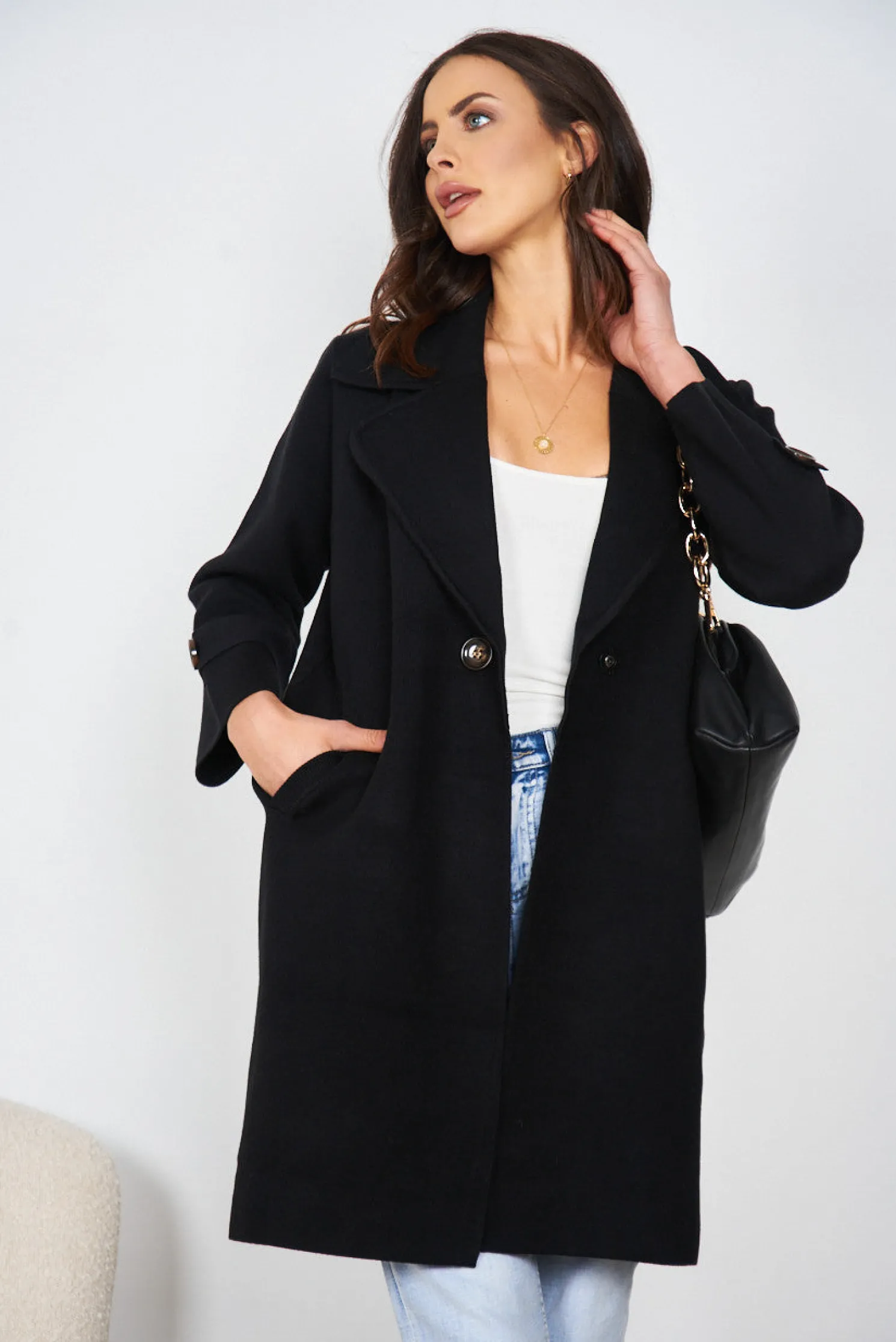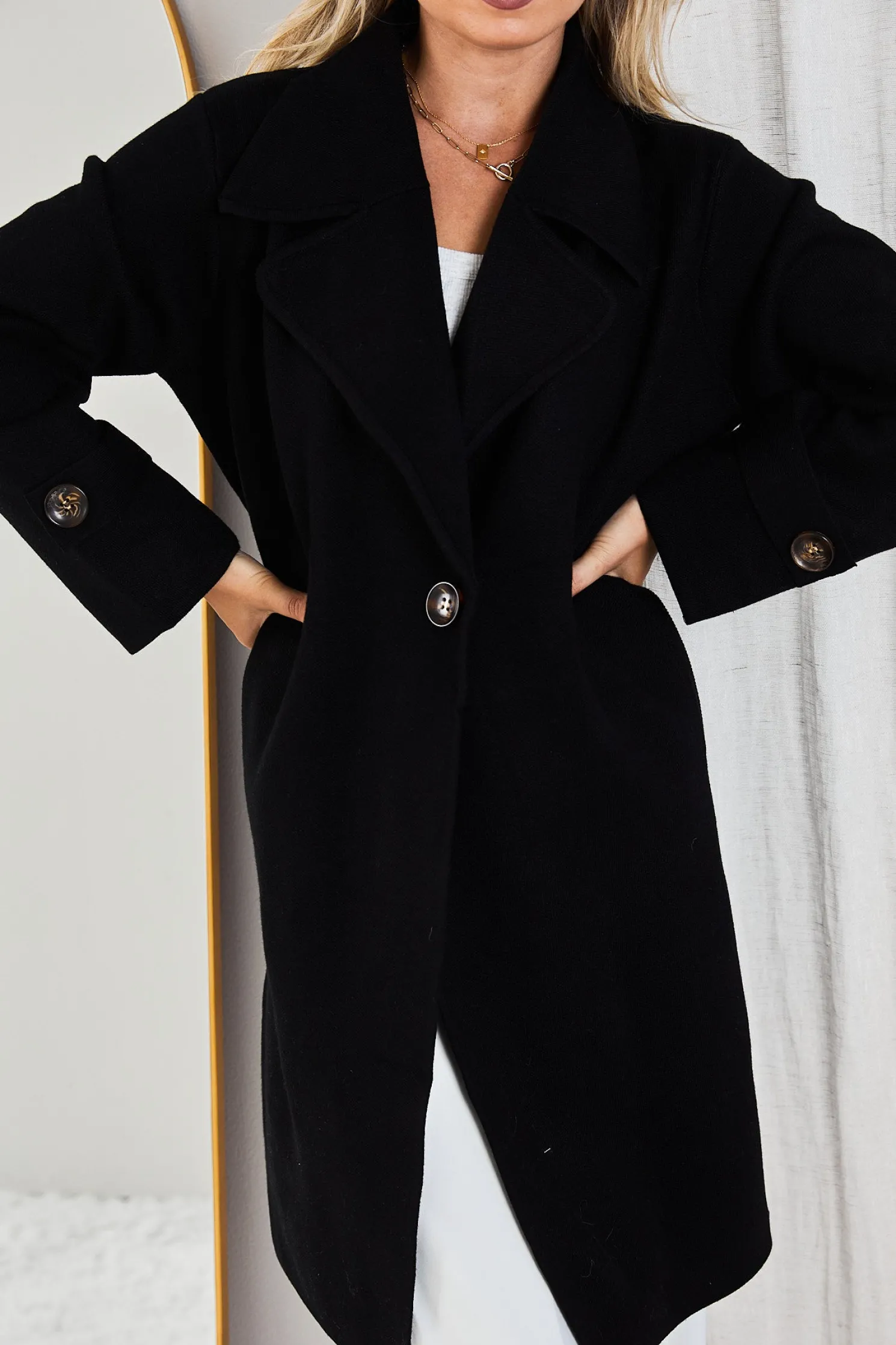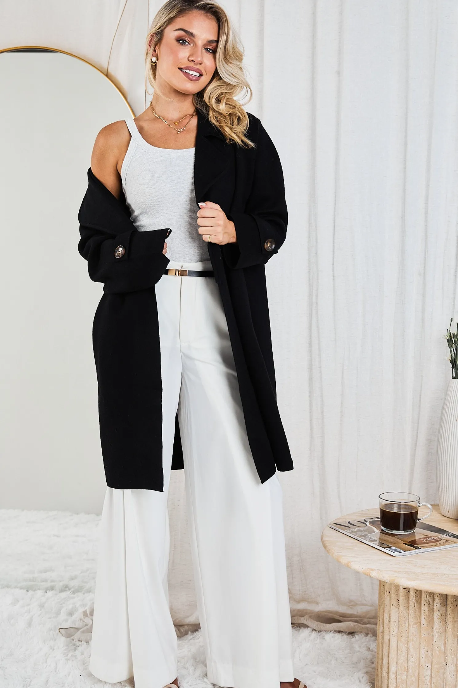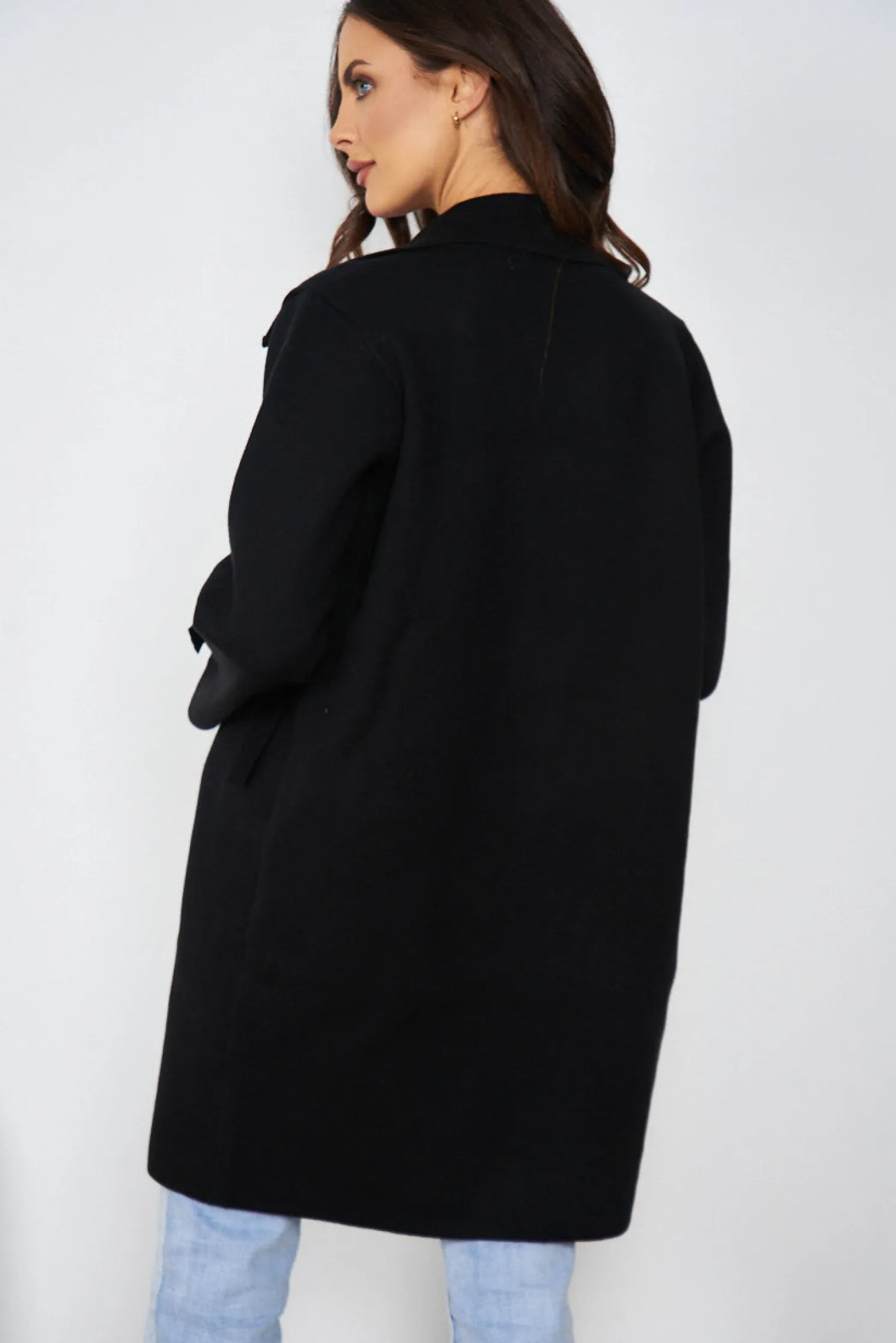 Our Fireplace Coat is a medium-weight, knitted trench style. This classic, open-stylecoat comes in a deep black tone. Featuring faux button details on the cuffs and on the front, and pockets. Pair with your favourite pair of relaxed pants for a classy winter look!