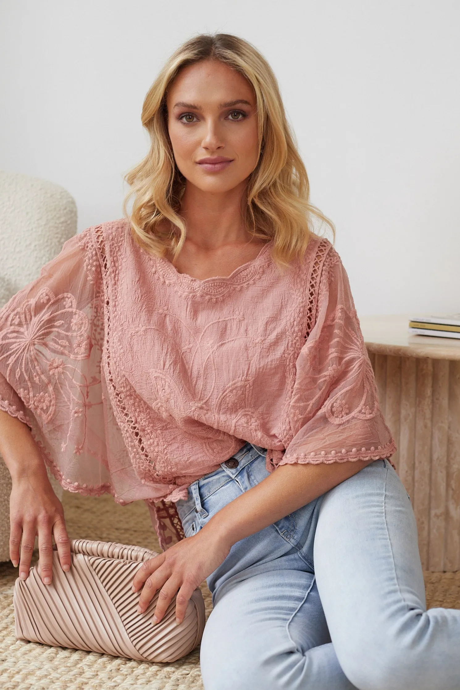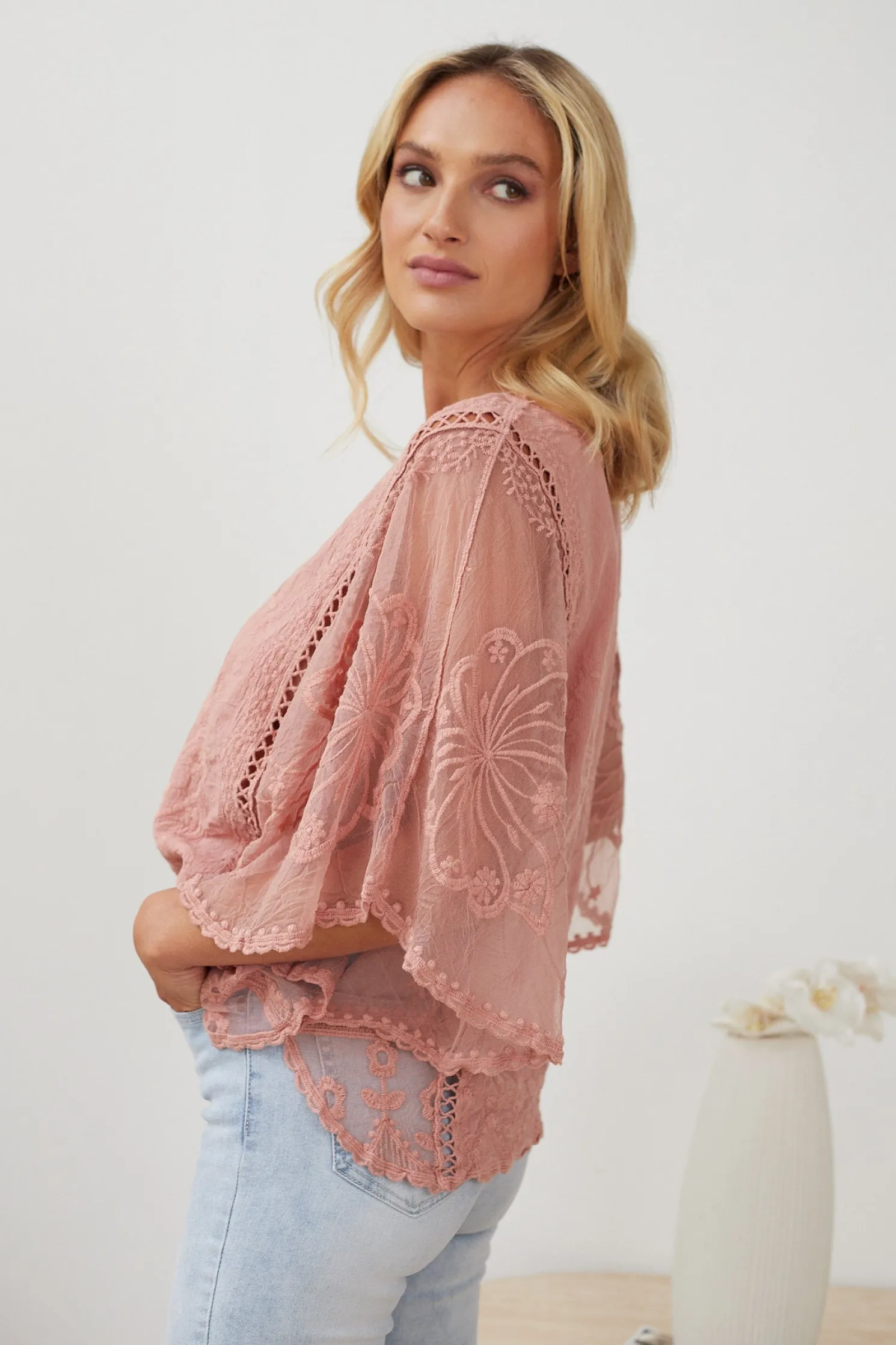 Our Gabrielle Top comes in a stunning clay pink tone. This lightweight sheer top features lace embroidery for a gorgeous bohemian look. The relaxed fit is ideal for the warm weather to come and pairs beautifully with a nude lacey bra. This is a one size fits all that fits sizes 6-14 depending on the desired fit.