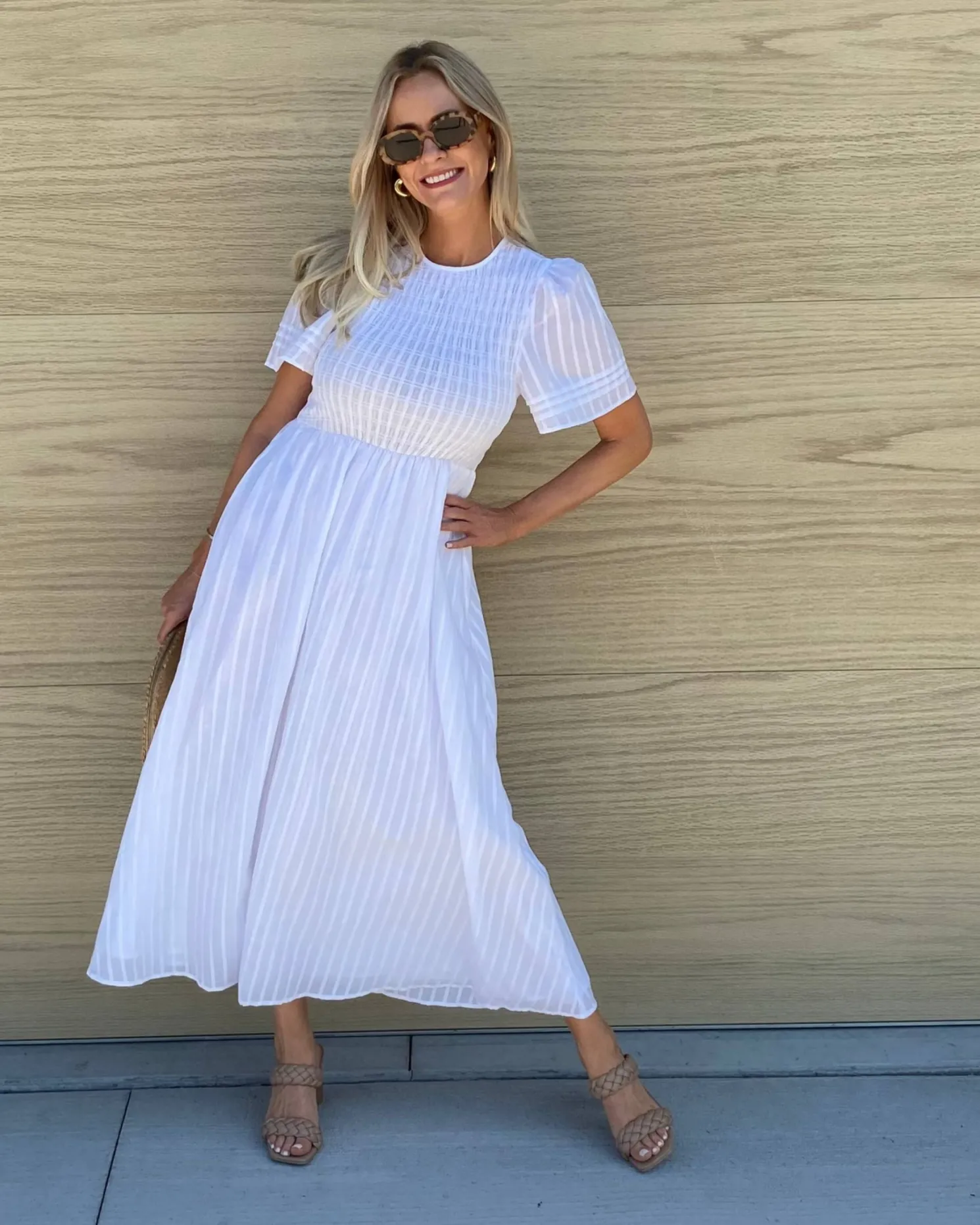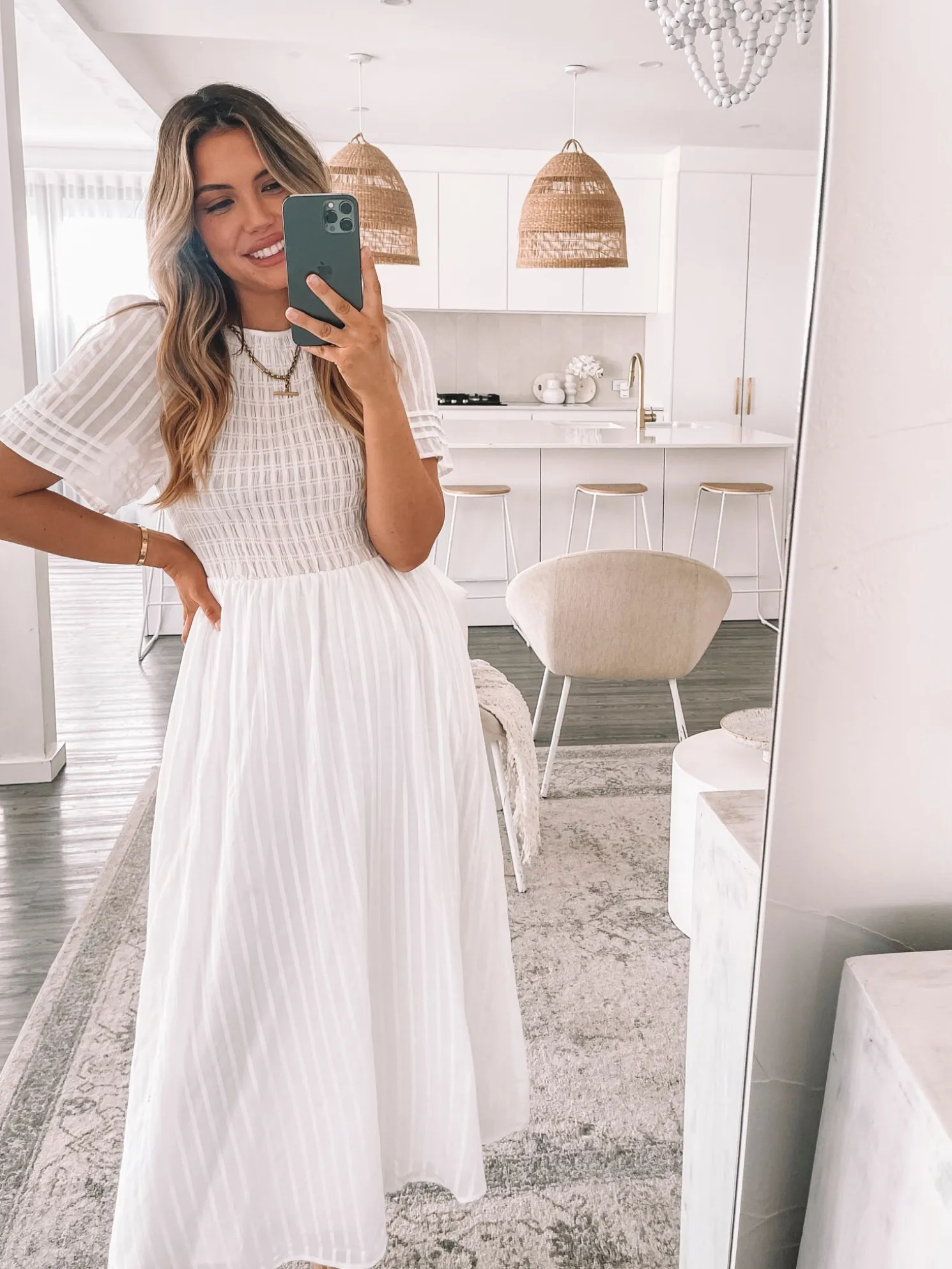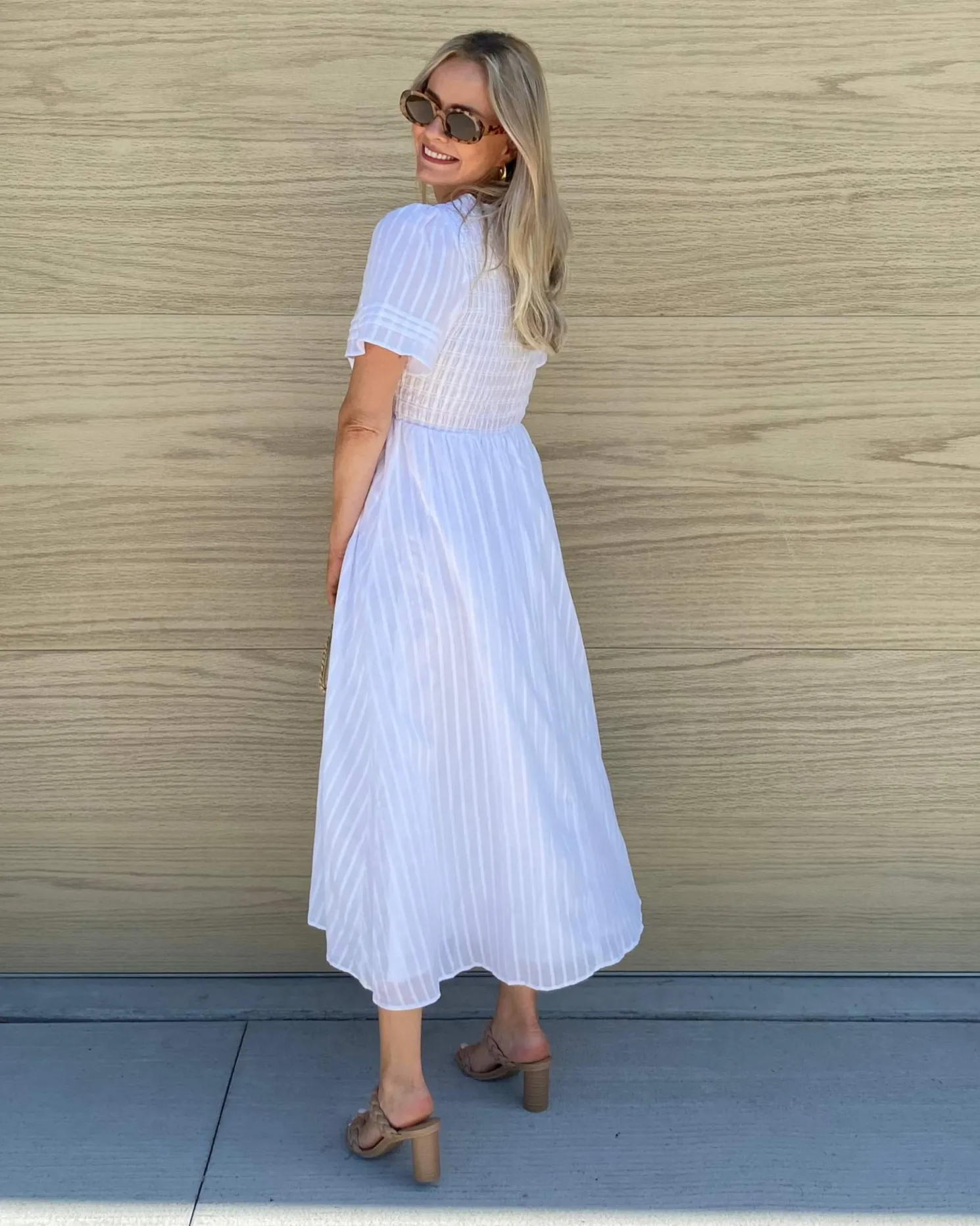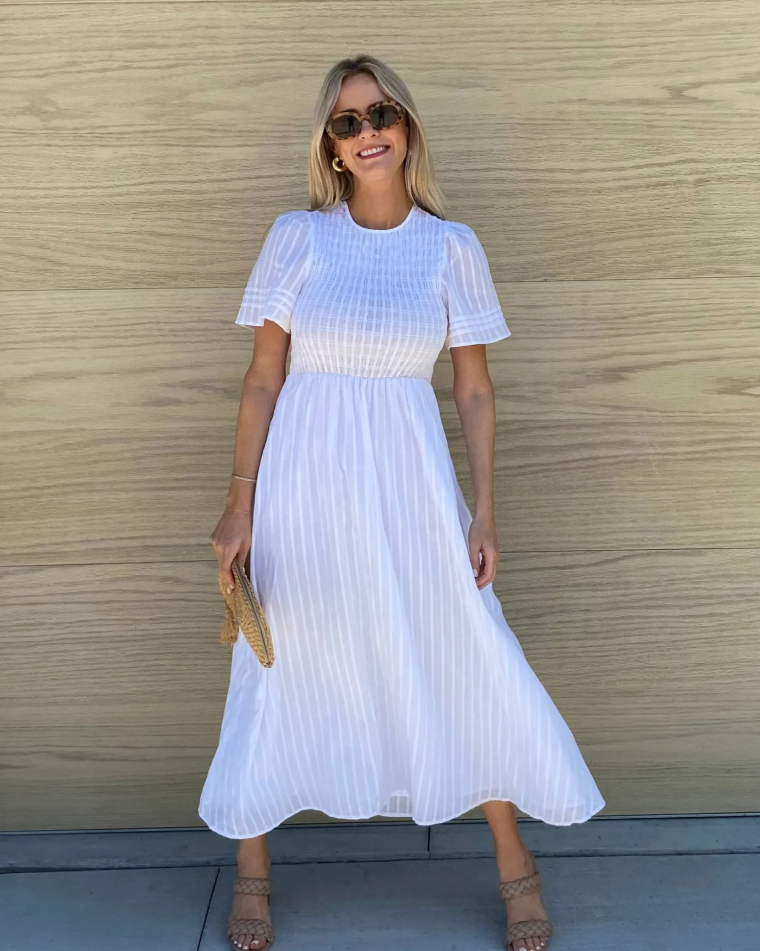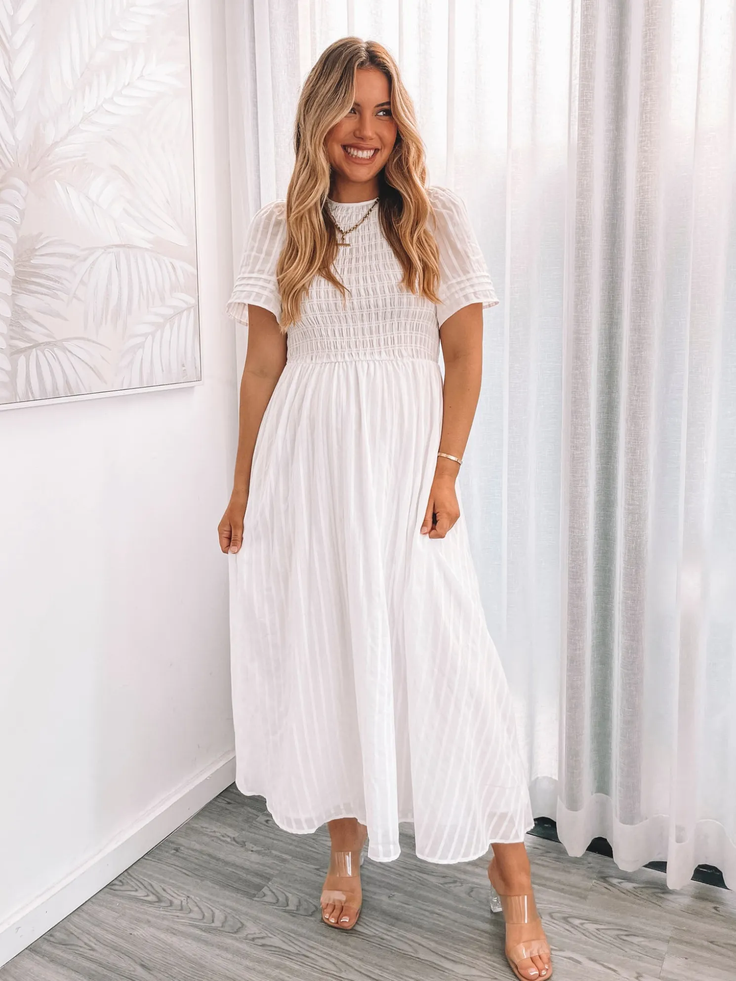 Our Iolana Dress comes in a crisp white tone. It features a round neckline, short sleeves and a textured pattern across the chest. This stunning midi pairs wonderfully with boots or heels for a stunning formal look!