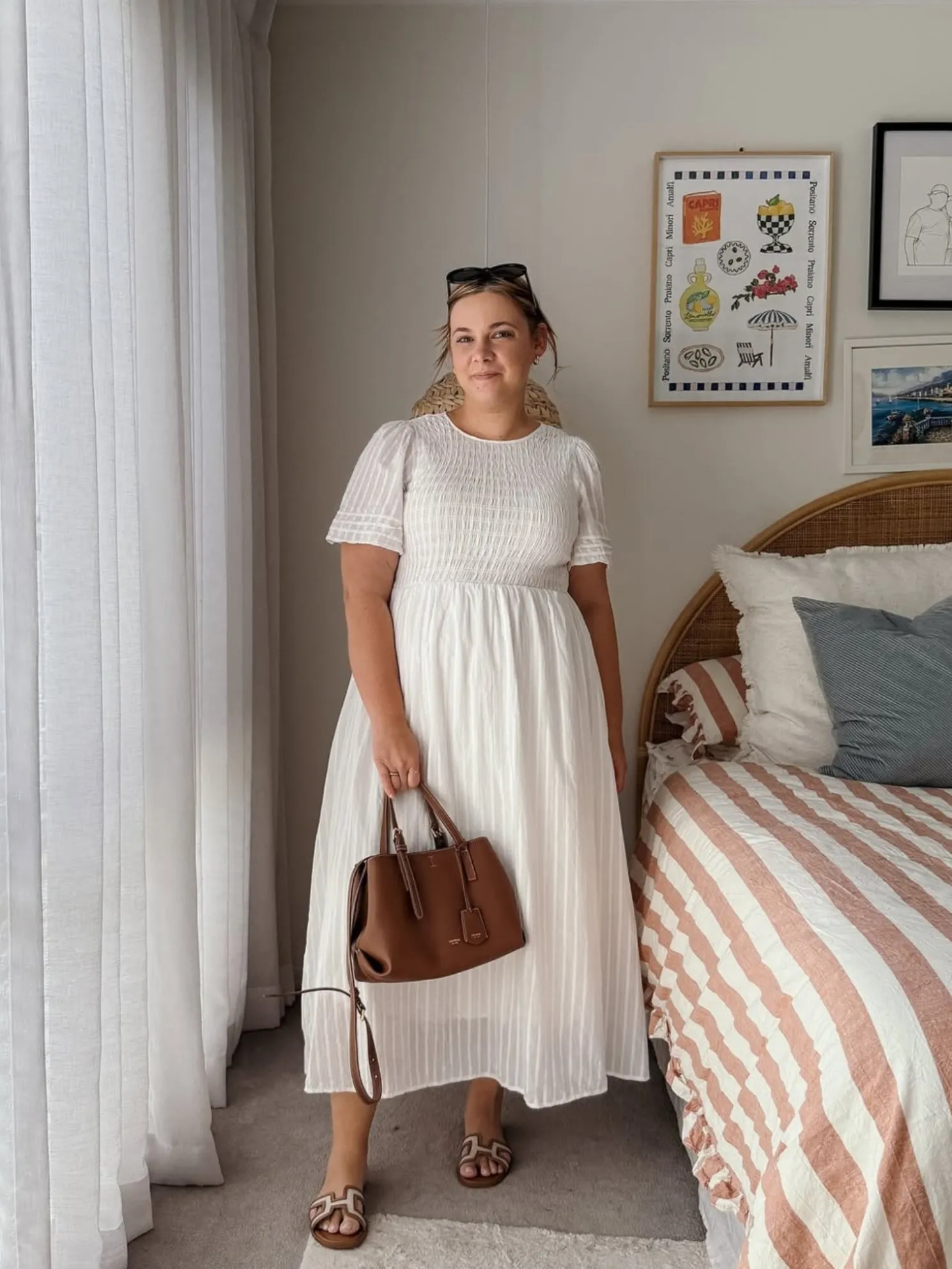 - Key Features: Midi length. Relaxed fit. Round neckline. Short sleeves. Maternity friendly. Lined.