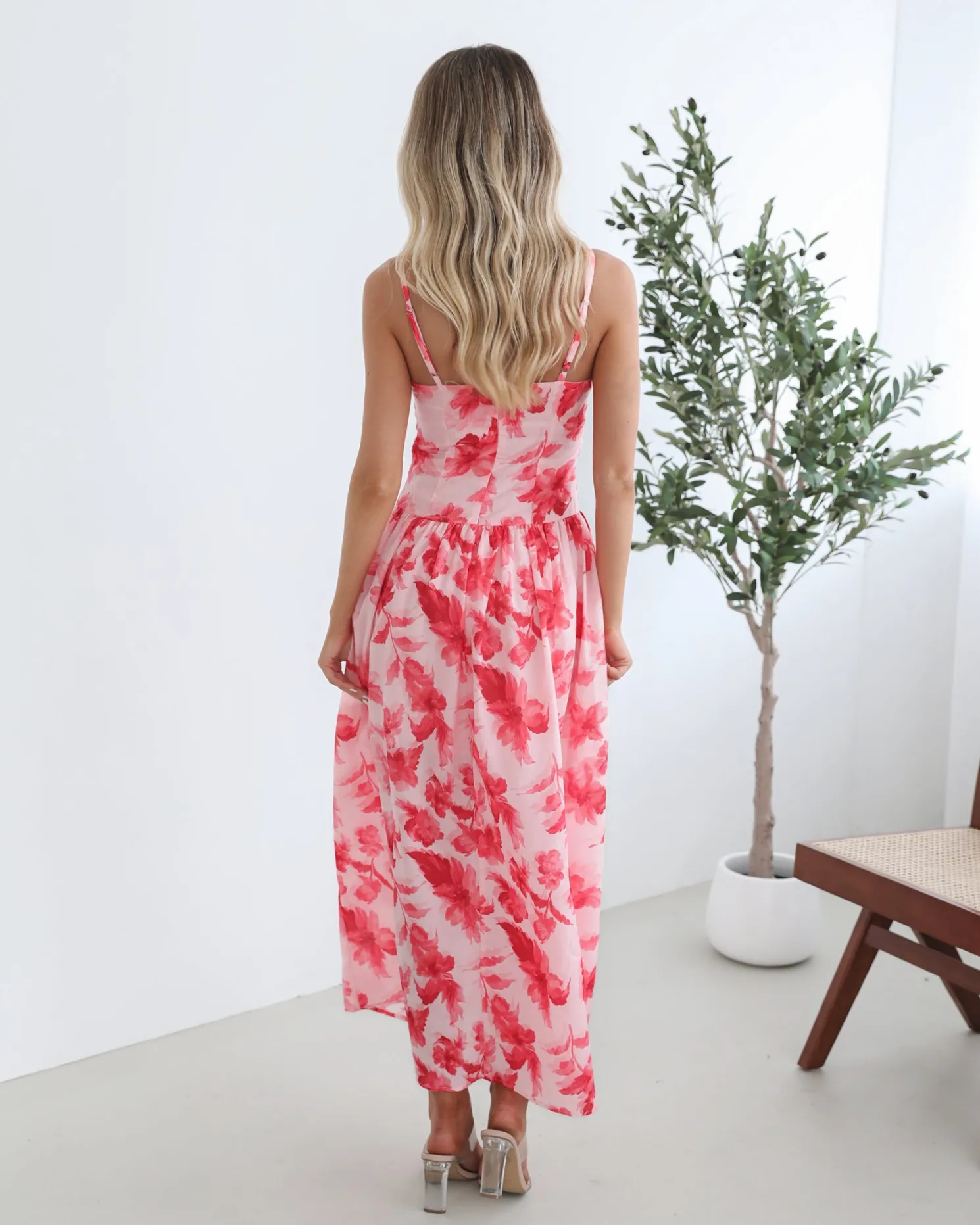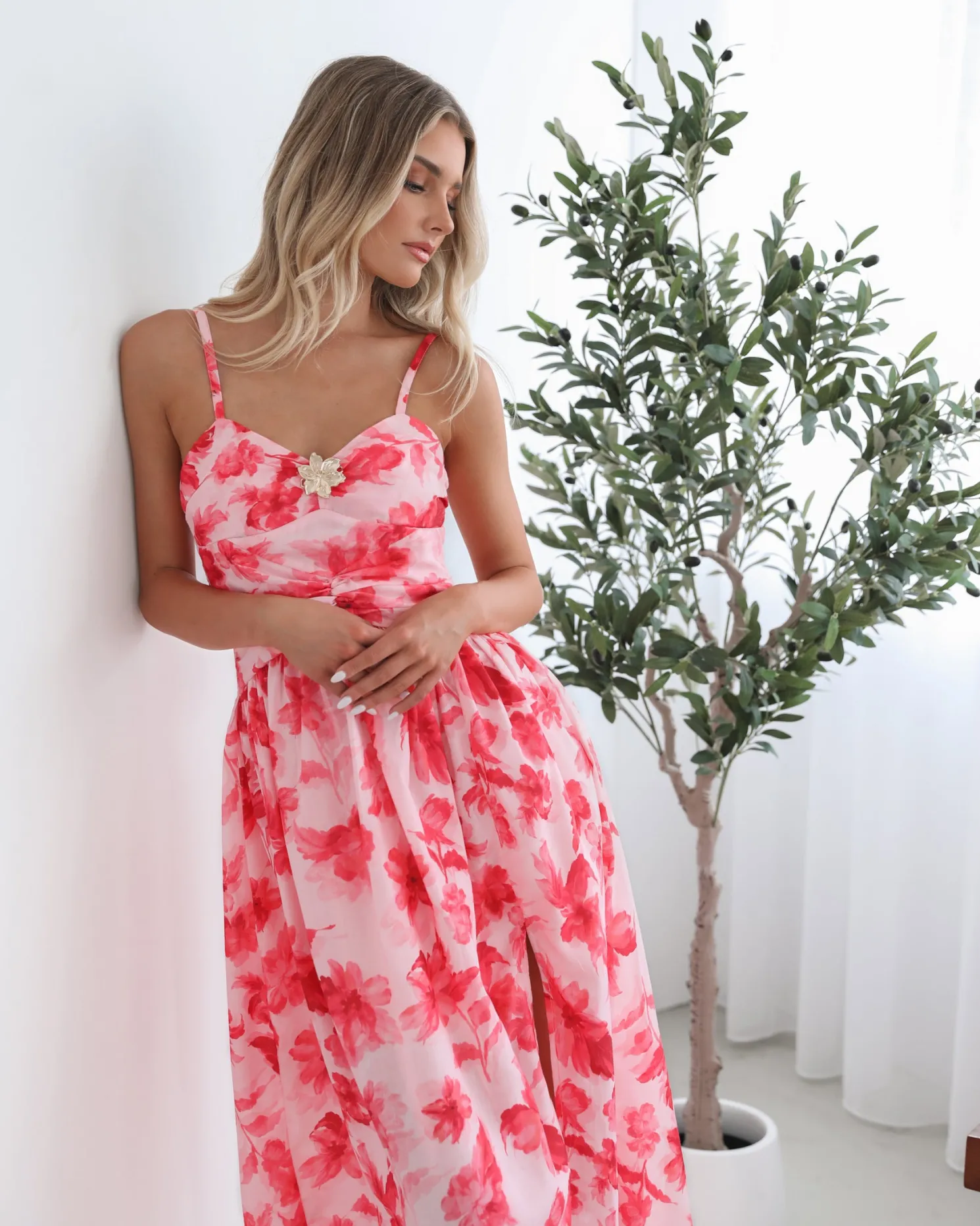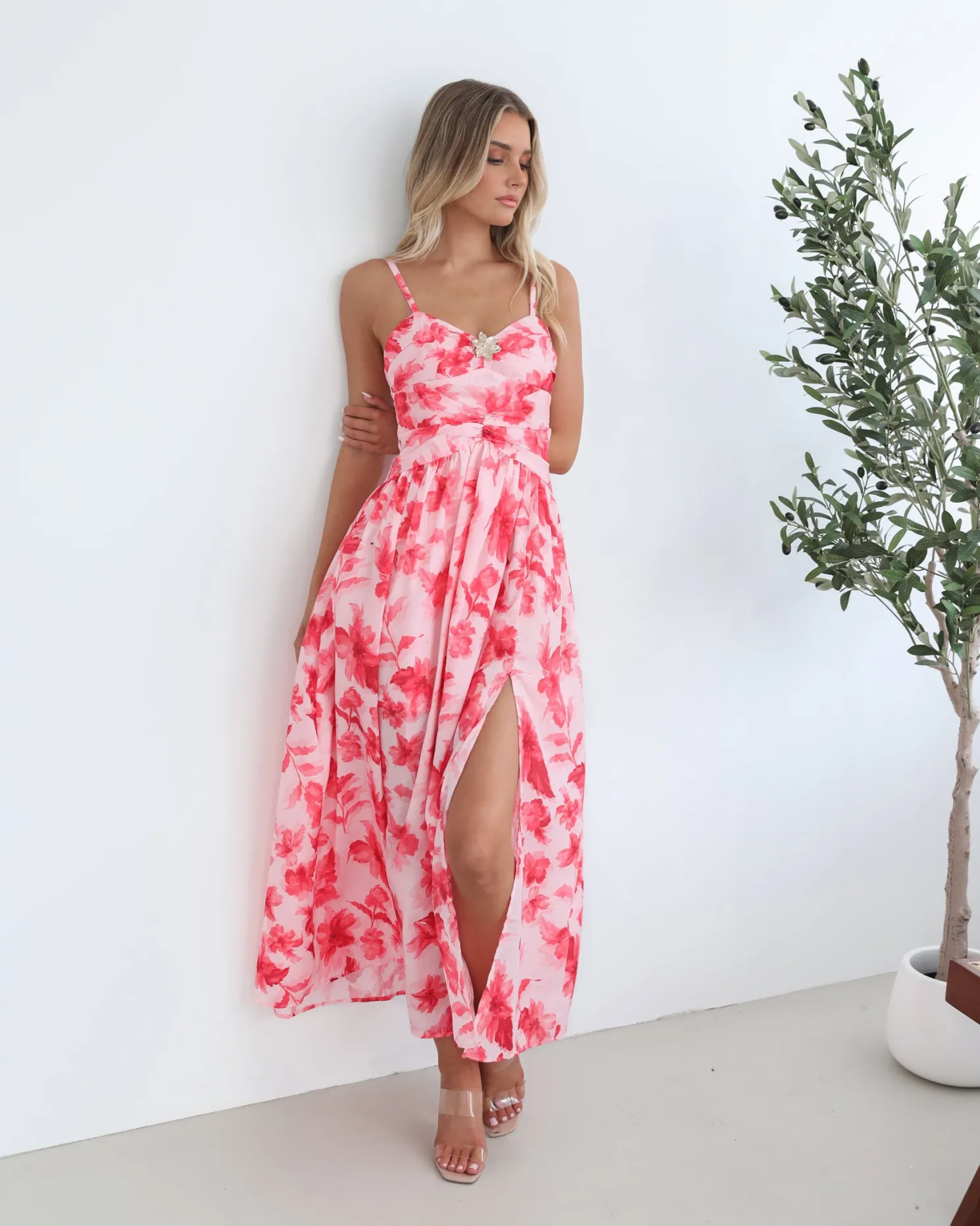 - Key Features: Floral prints. Straps. Sweetheart neckline. Non-detachable brooch. Flowy skirt. Maxi length hem.