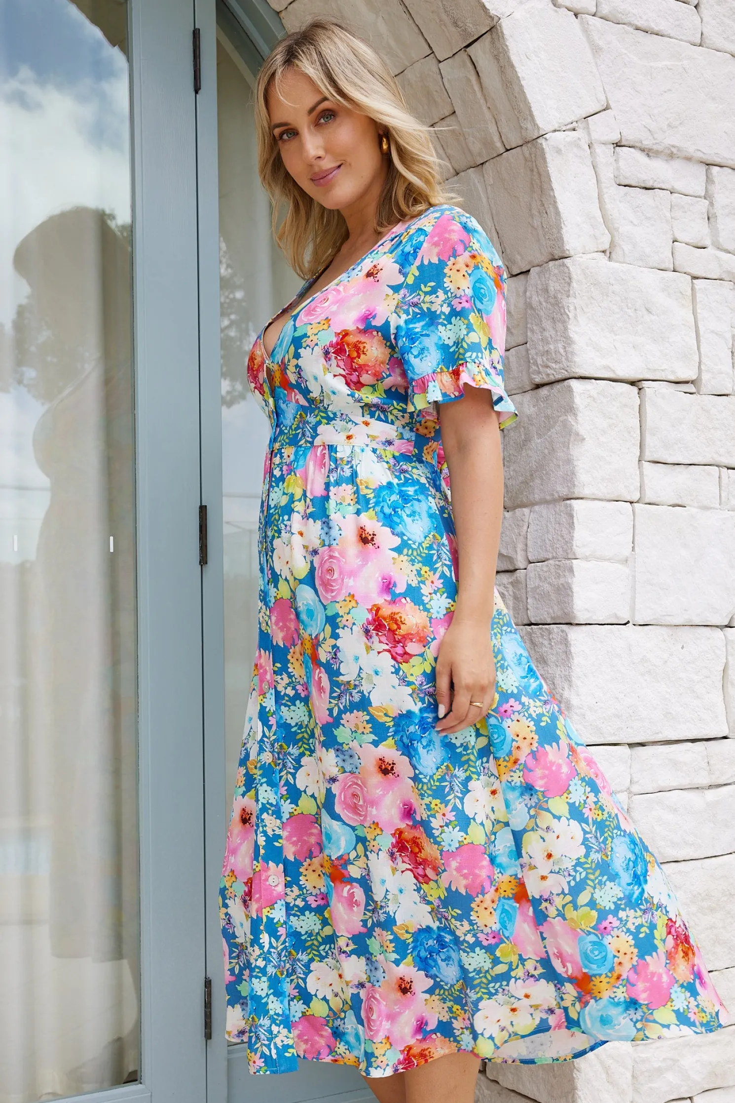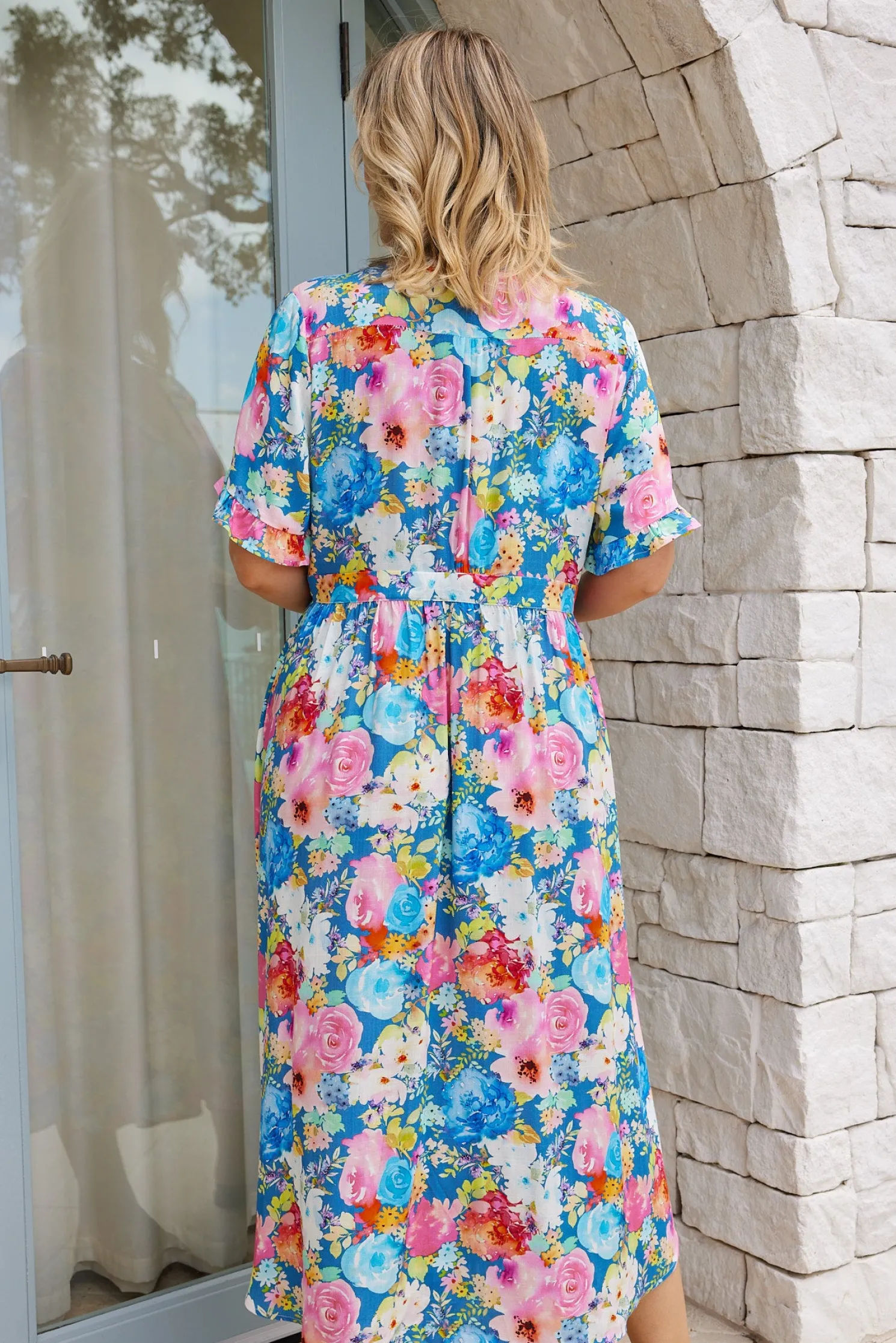 Our Karabelle Dress comes in amulticoloured floral print. Take in the beauty of the city while looking all pretty in this midi that features a v-neckline, short flounce sleeves, centre-front buttons and flowy skirt. Style with gladiator flats and a rattan bag!