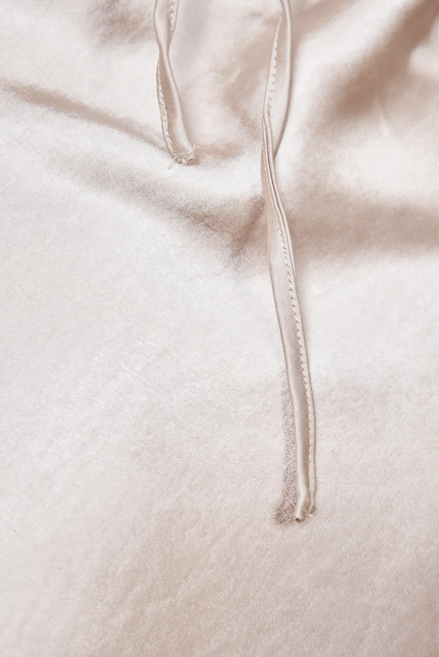 Our Keke Dress comes in a beautiful champagne tone. This slinky midi features a V neckline, twist and cut out detailing on the bust, adjustable spaghetti straps that cross over at the back, and open back with tie detailing. This romantic midi pairs beautifully with black strappy heels.