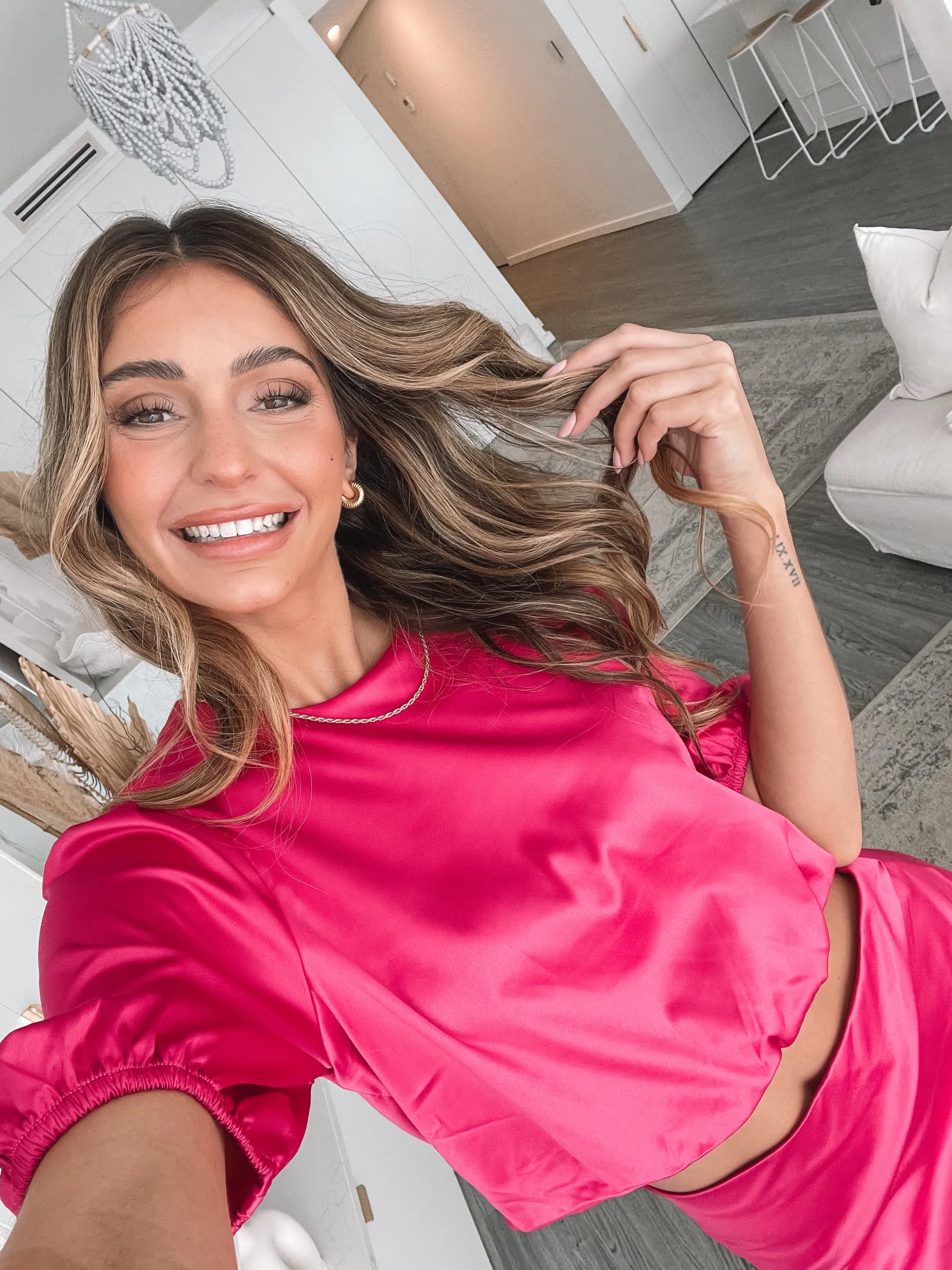Our Kerize Top comes in a hot pink colour. Feel like a million bucks in this top that features a round neckline, short puff sleeves and crop length hem. Complete the look with our Krissa Skirt!