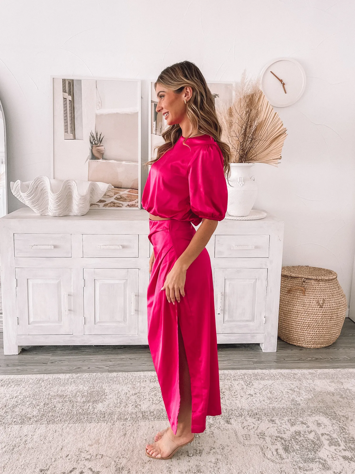 Our Krissa Skirt comes in a hot pink colour. The right amount of sophistication for your next event, this piece is high waisted and features ruching on the side, front slit and midaxi length hem. Complete the look with our Kerize Top!