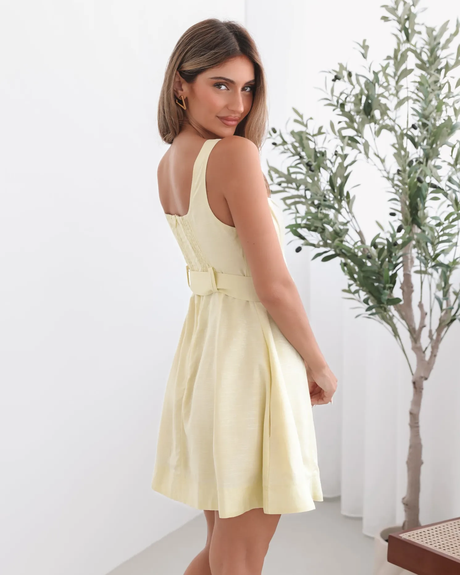 Our Kyveli Dress comes in a yellow tone. Like a ray of sunshine wrapped in casual elegance, this piece is designed with wide straps, sweetheart neckline, centre-front buttons, waist belt, a-line skirt and mini length hem. Add gold statement earrings for a touch of glamour!