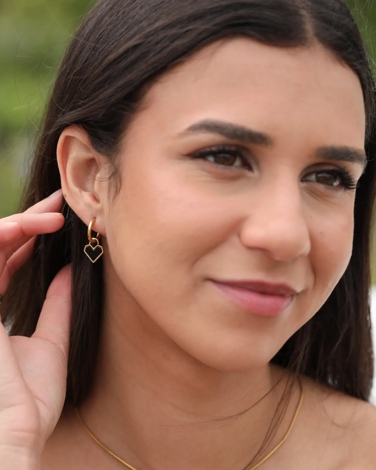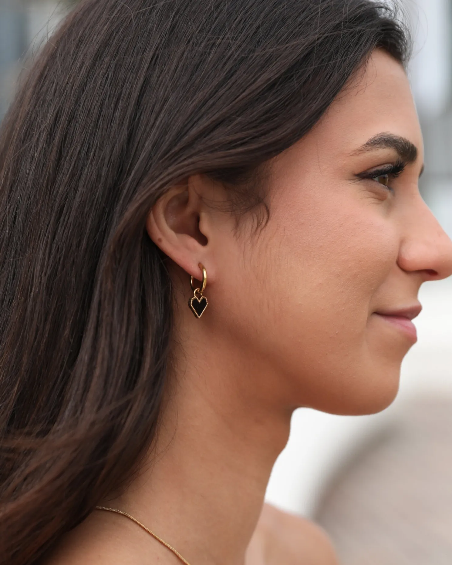 Our Liliosa Earrings come in black and gold tones. Adding a darkly romantic accent to your everyday style, this beauty is designed with a hoop and heart-shaped pendant. Let it shine by pairing it with a minimalist top!