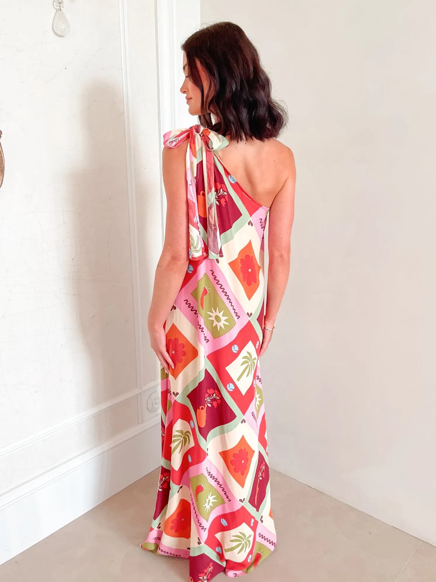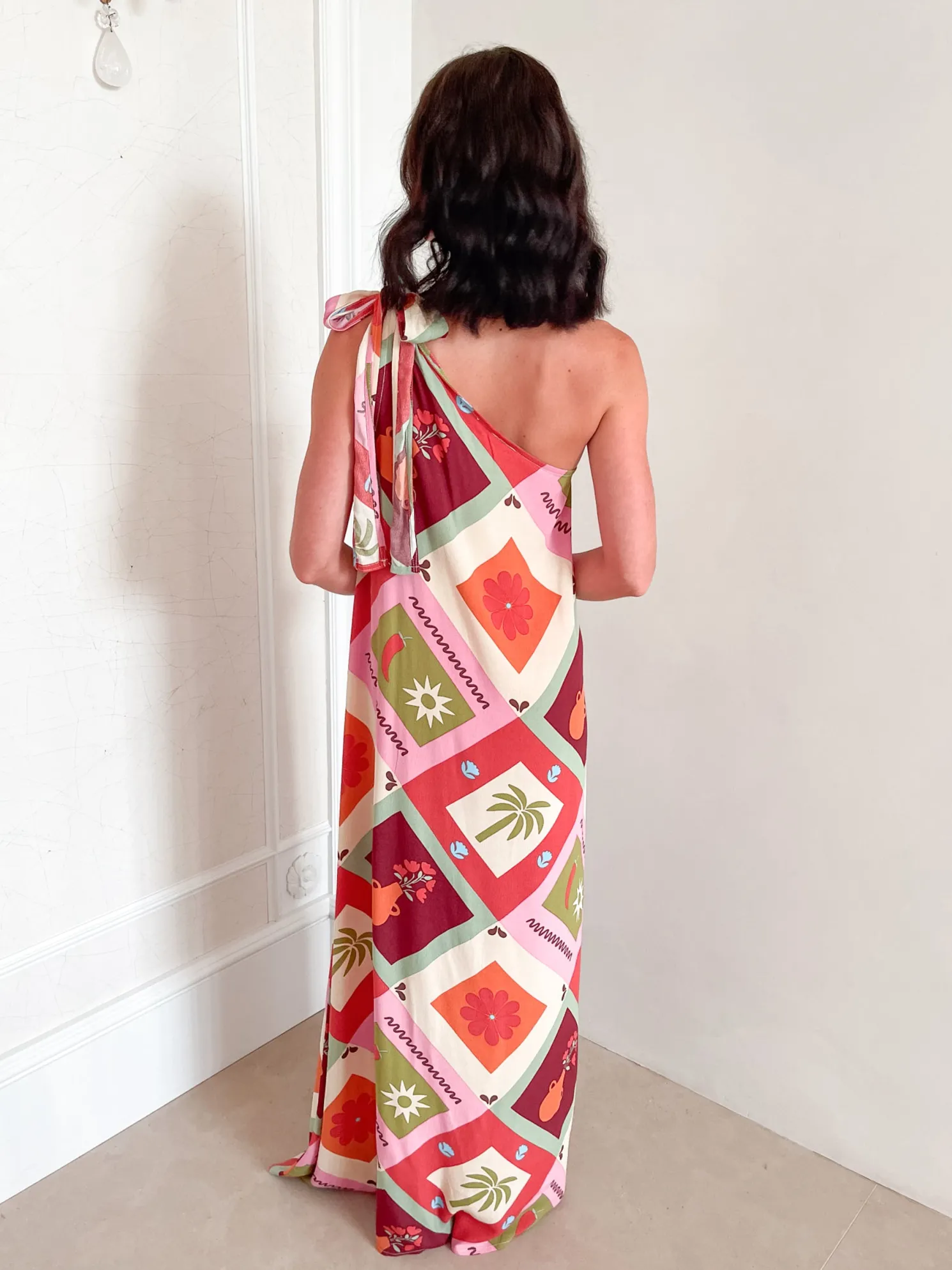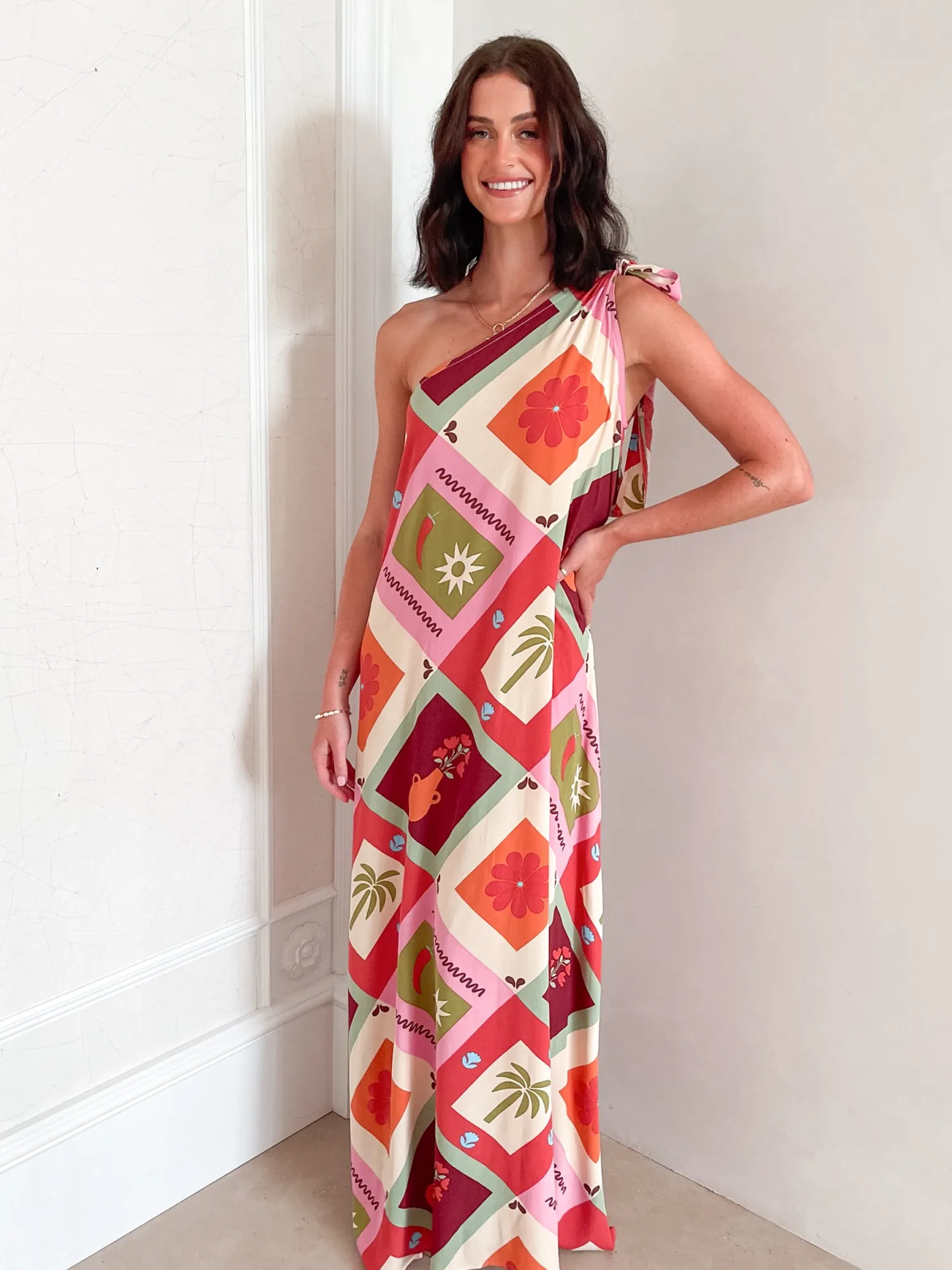 Our Lyzel Dress comes in a multicoloured print. A rainbow of prints in one gorgeous package, this piece is designed with a one shoulder neckline, relaxed silhouette and maxi length hem. Match it with a metallic stilettos for a bold, glamorous vibe!
