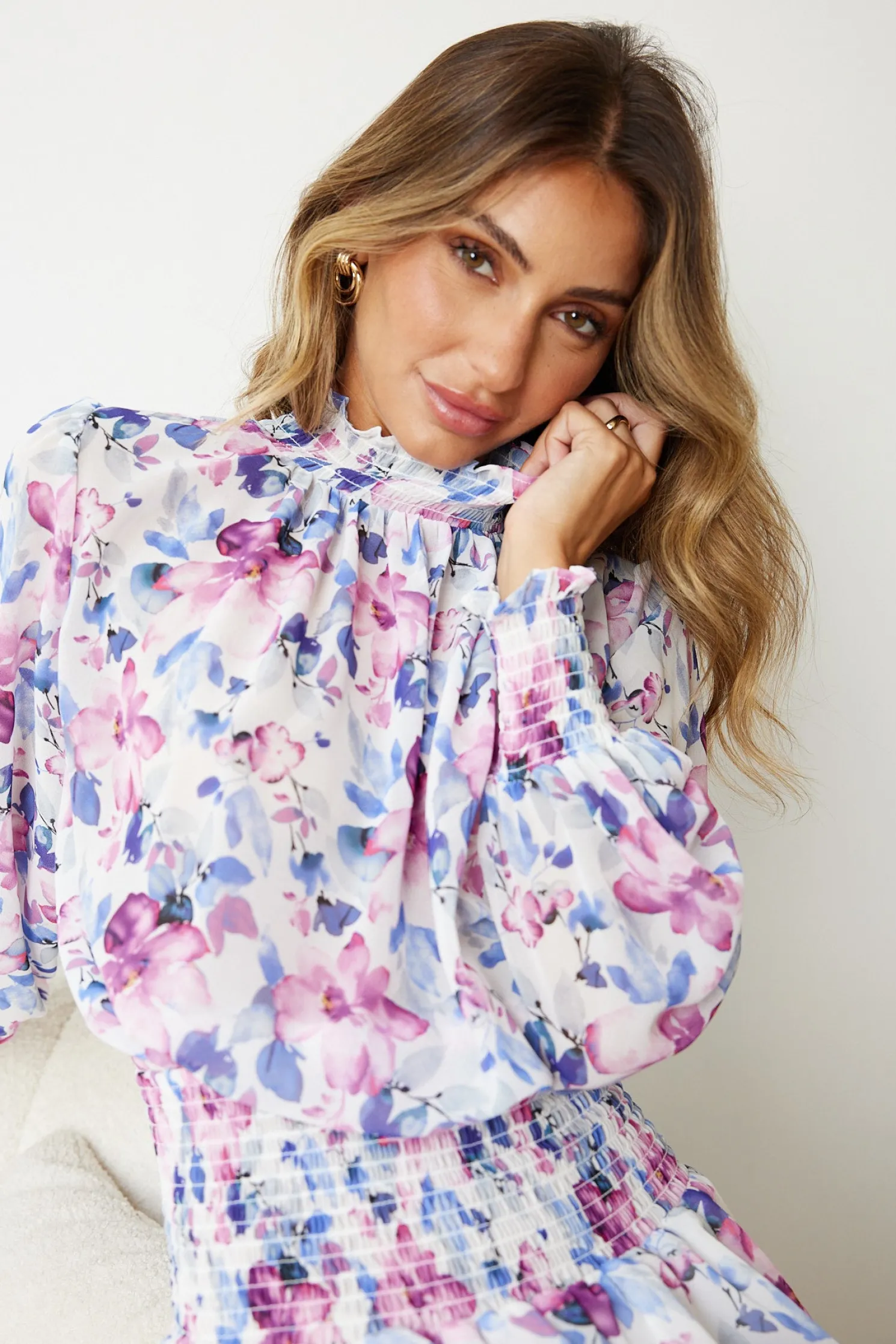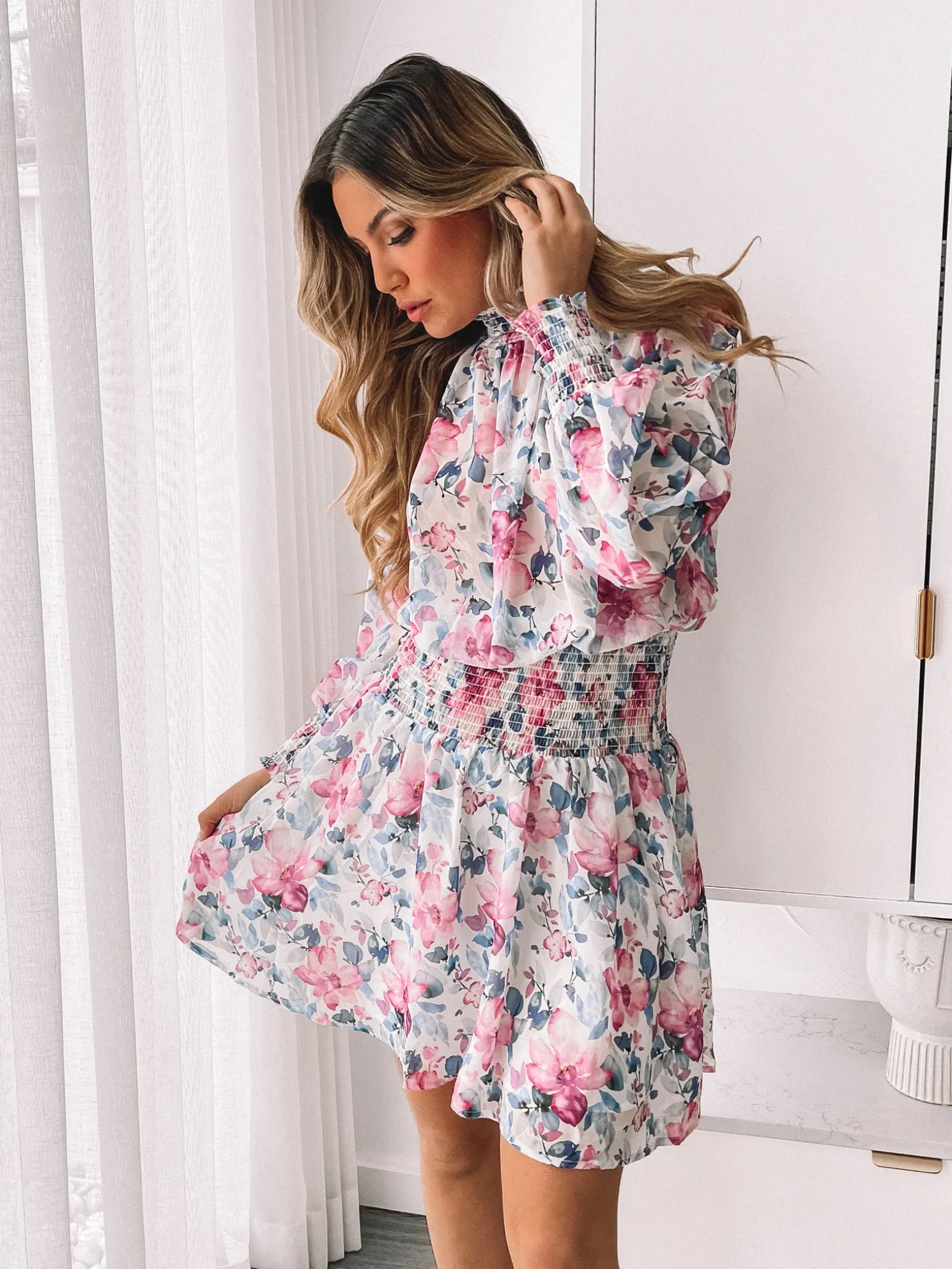 Our Neary Dress comes in aviolet floral print. Indulge in an ultimate fashion experience with this number that features a high neckline, long sleeves with smocking on cuffs, gathered detailing and mini length. Look extra stylish with platform heels and diamond accessories!