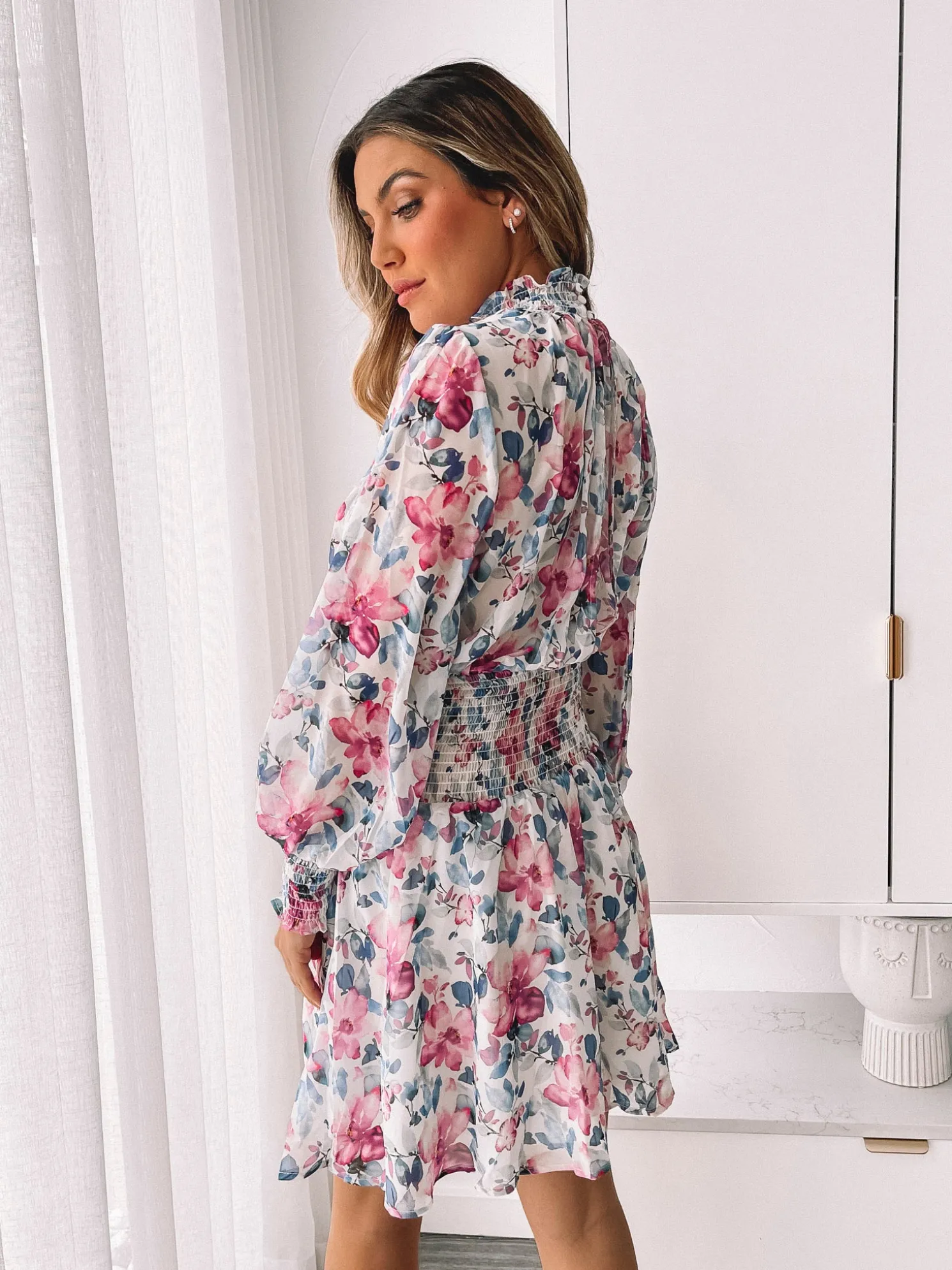 - Key Features: High neckline. Long sleeves with smocking on cuffs. Gathered detailing. Mini length.