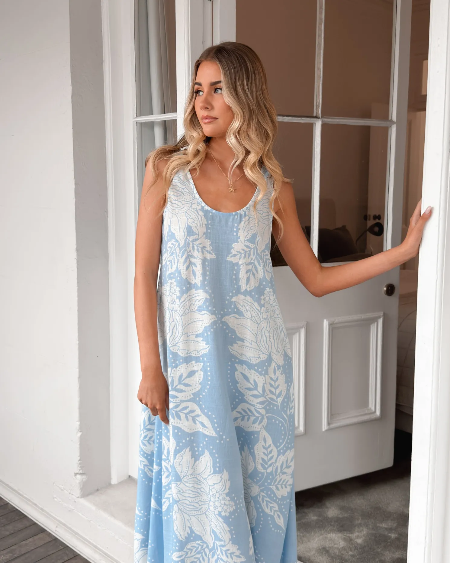Our Noerelle Dress comes in a light blue base with white prints. Crafted in a dreamy shade and delicate patterns, this piece is designed with a wide round neckline, relaxed silhouette and maxi length hem. Pair with nude sandals, a floppy hat, and a dainty bracelet stack for a look that’s effortlessly chic.