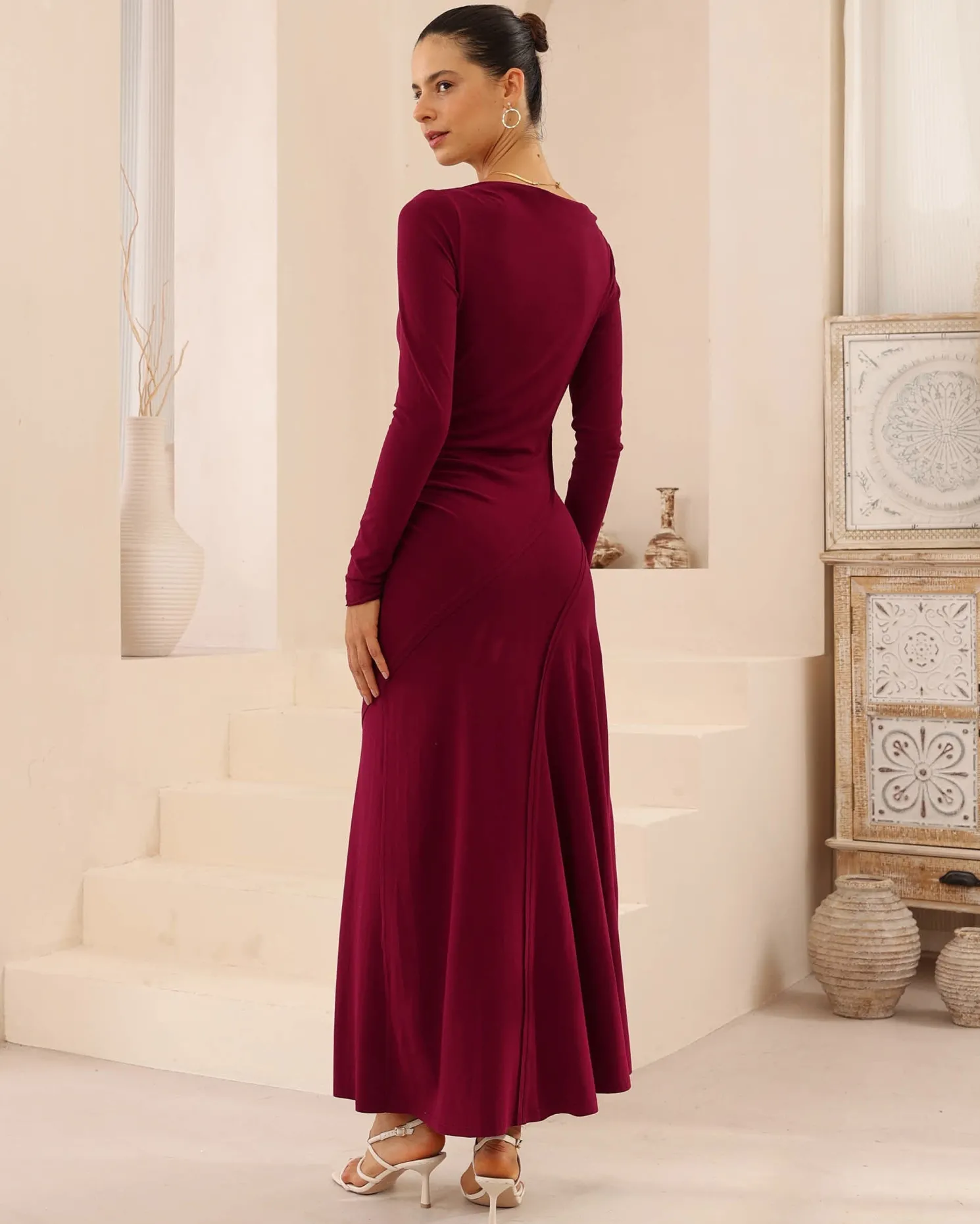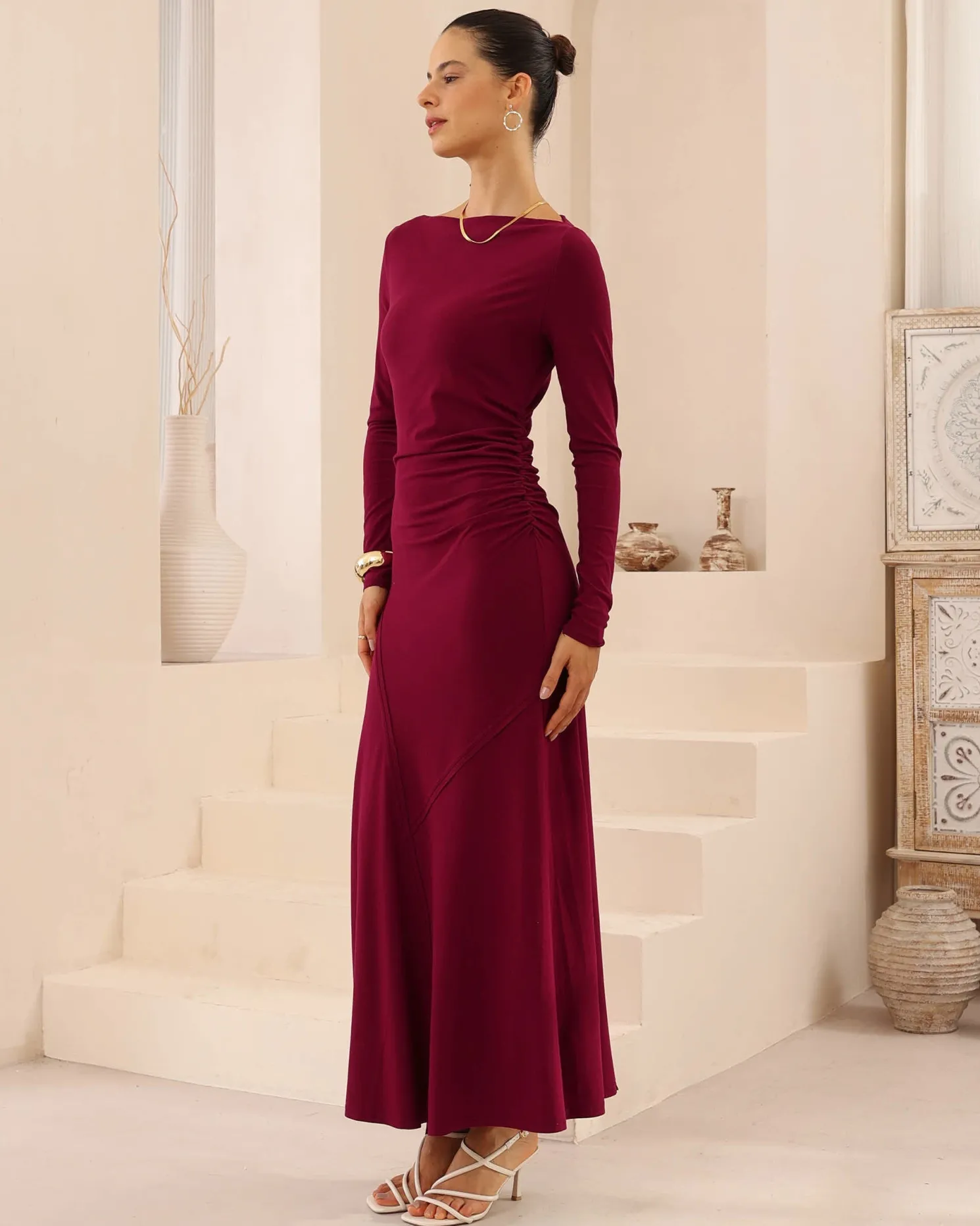 - Key Features: Boat neckline. Long tight sleeves. Ruching on waist. Flowy skirt. Maxi length hem.