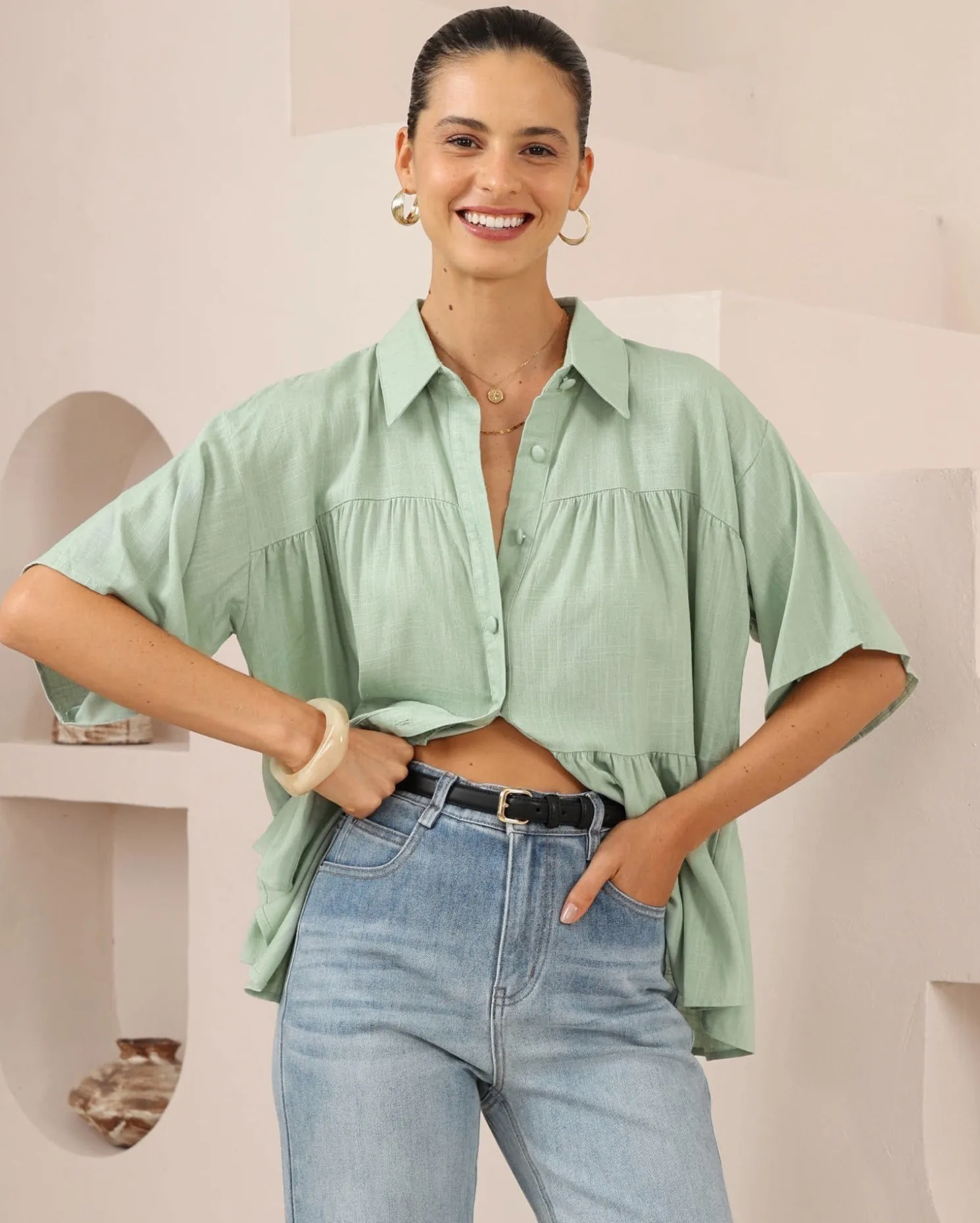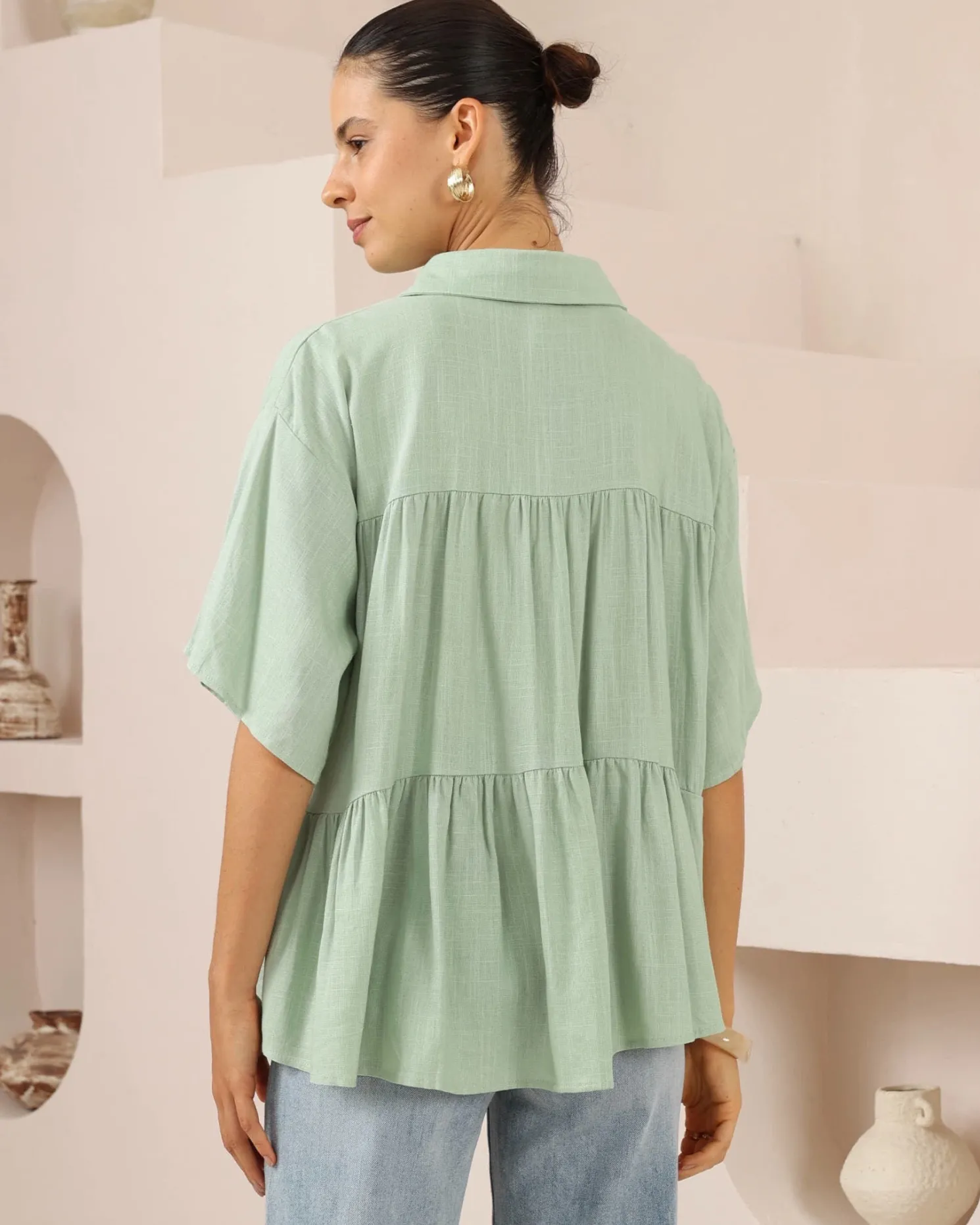 Our Nymeraine Blouse comes in a sage colour. The top that doesn’t try too hard but always lands just right, this piece features a collar, elbow length sleeves, centre-front buttons and relaxed silhouette. Match it with high-waisted straight jeans and a messy low bun!