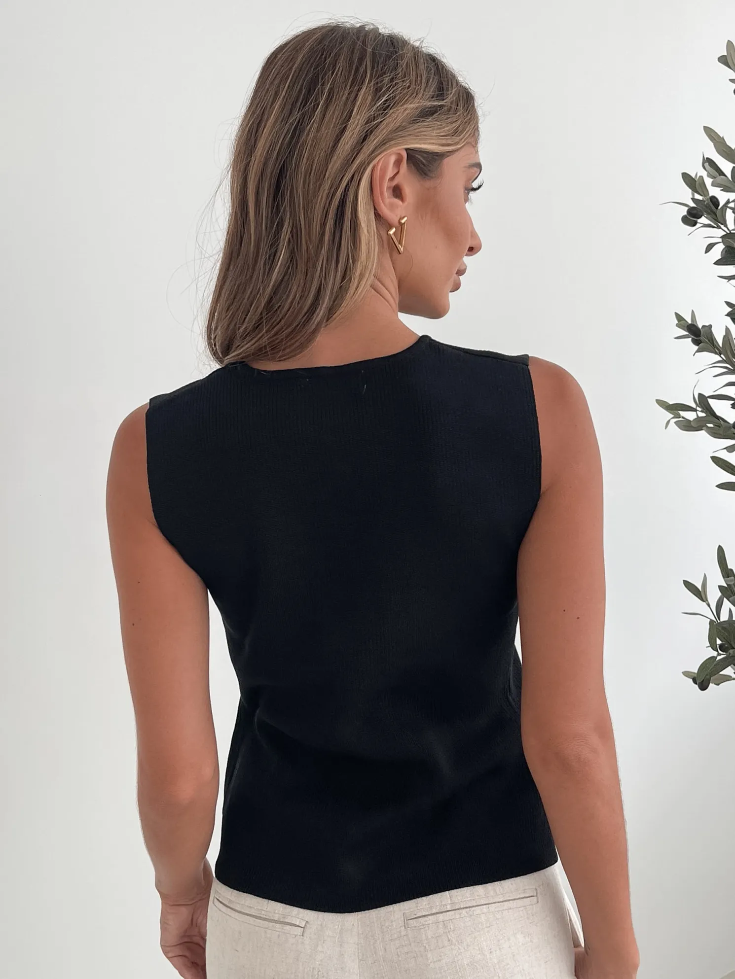 Our Odessa Knit Top comes in a black colour. Elevating classic to a new level of sophistication, this vest top features a v-neckline, centre-front buttons and semi-relaxed fit. For a smart-casual twist, tuck it into tailored trousers and pair with leather loafers!