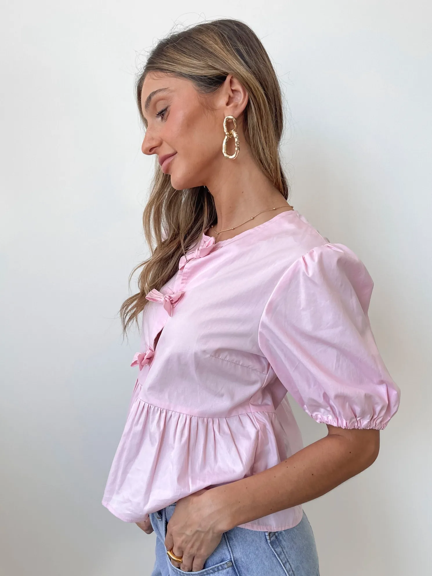 Our Rayanna Top comes in a pink colour. Wrapping you in a playful charm, this piece features a round neckline, top front bow ties, short puff sleeves and peplum design. Layer delicate gold necklaces and add a few dainty bracelets for some subtle sparkle!