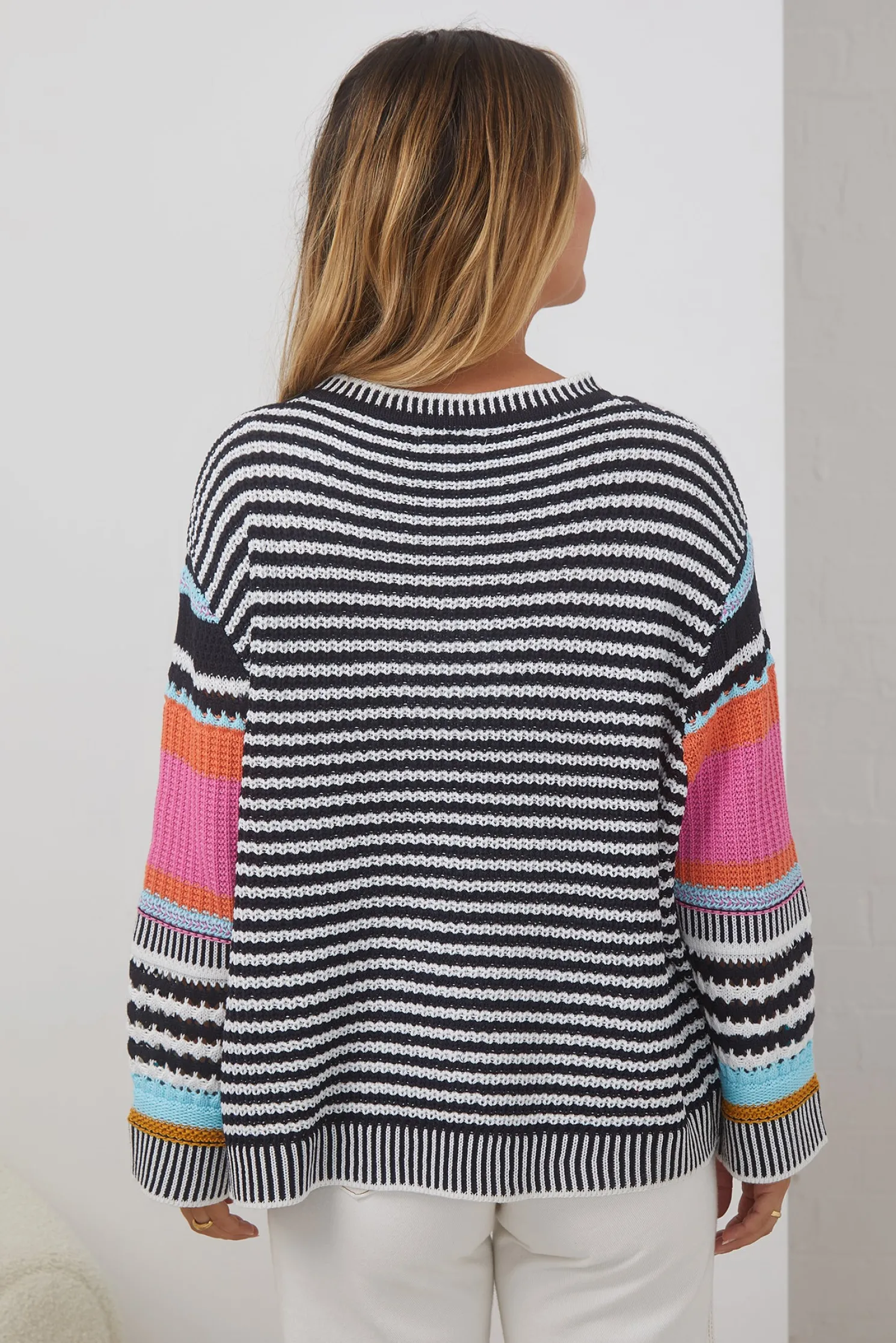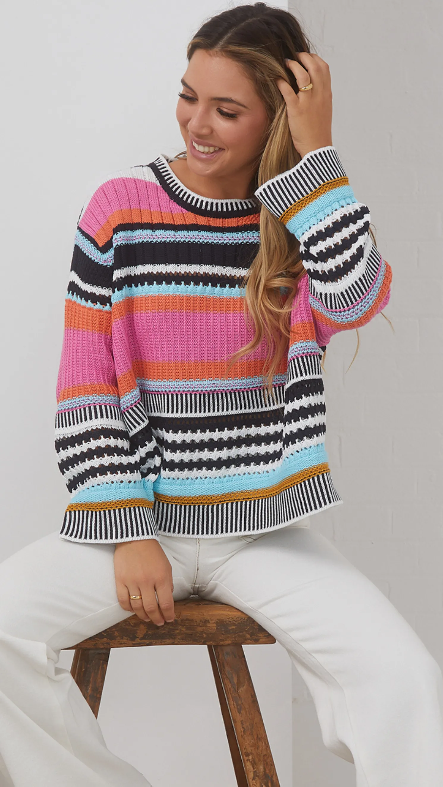 Our Roberta Knit comes in a pink, multicoloured tone. It features a scoop neckline and long straight sleeves for a relaxed, comfortable fit. Pair this cute knit with a dark pair of pants for a neat retro look!