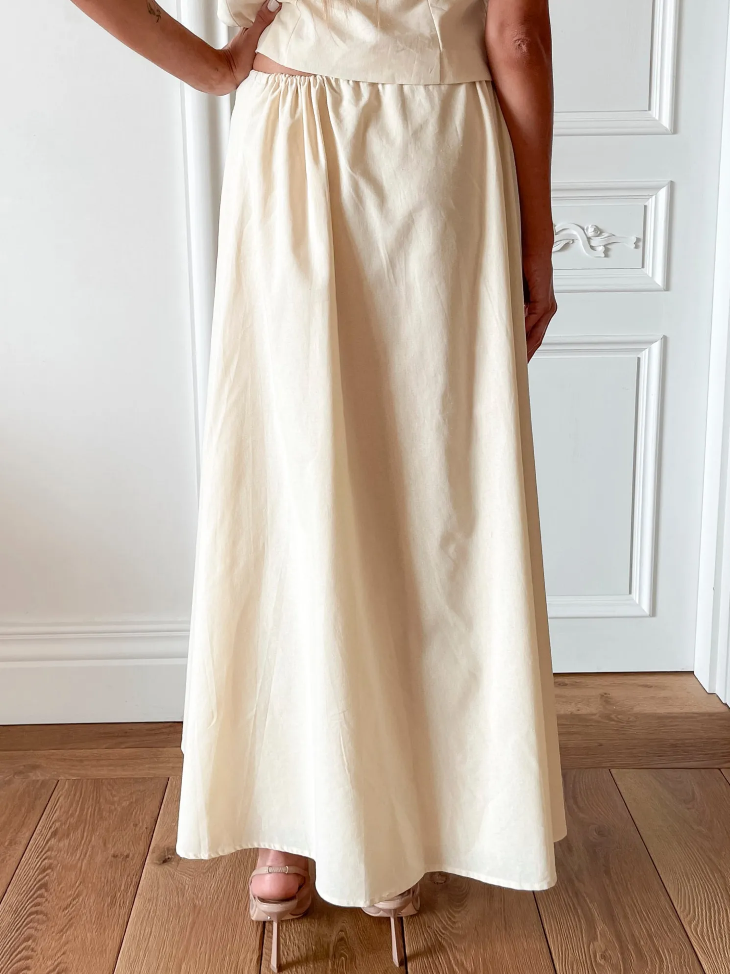 Our Rowyn Skirt comes in a yellow colour. Radiating positivity and warmth, this piece is high-waisted and features an a-line silhouette and maxi length hem. Complete the look with our Rowyn Top!