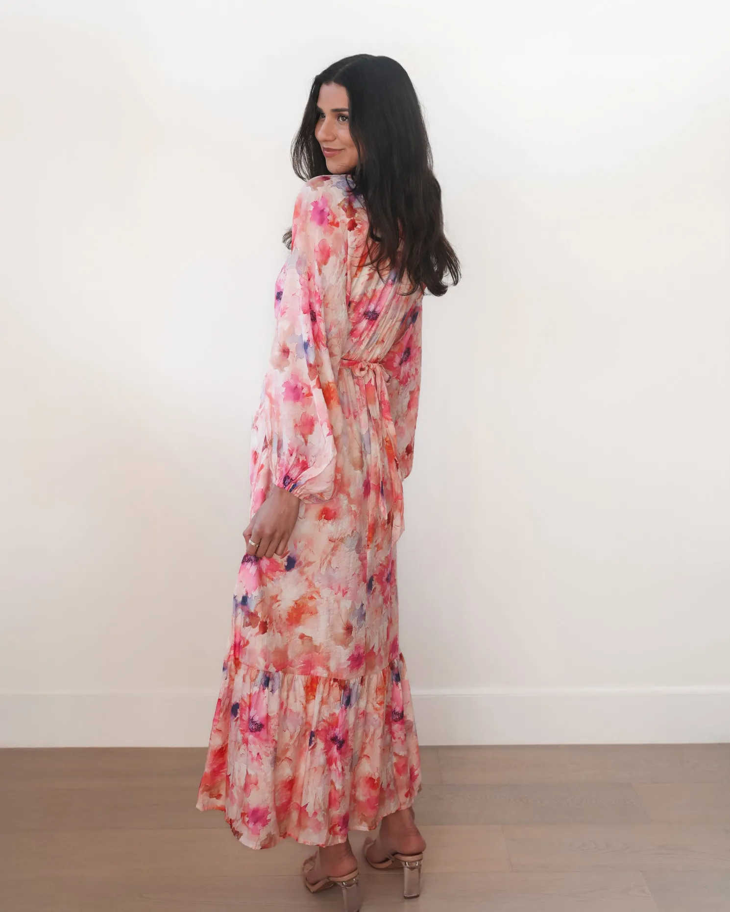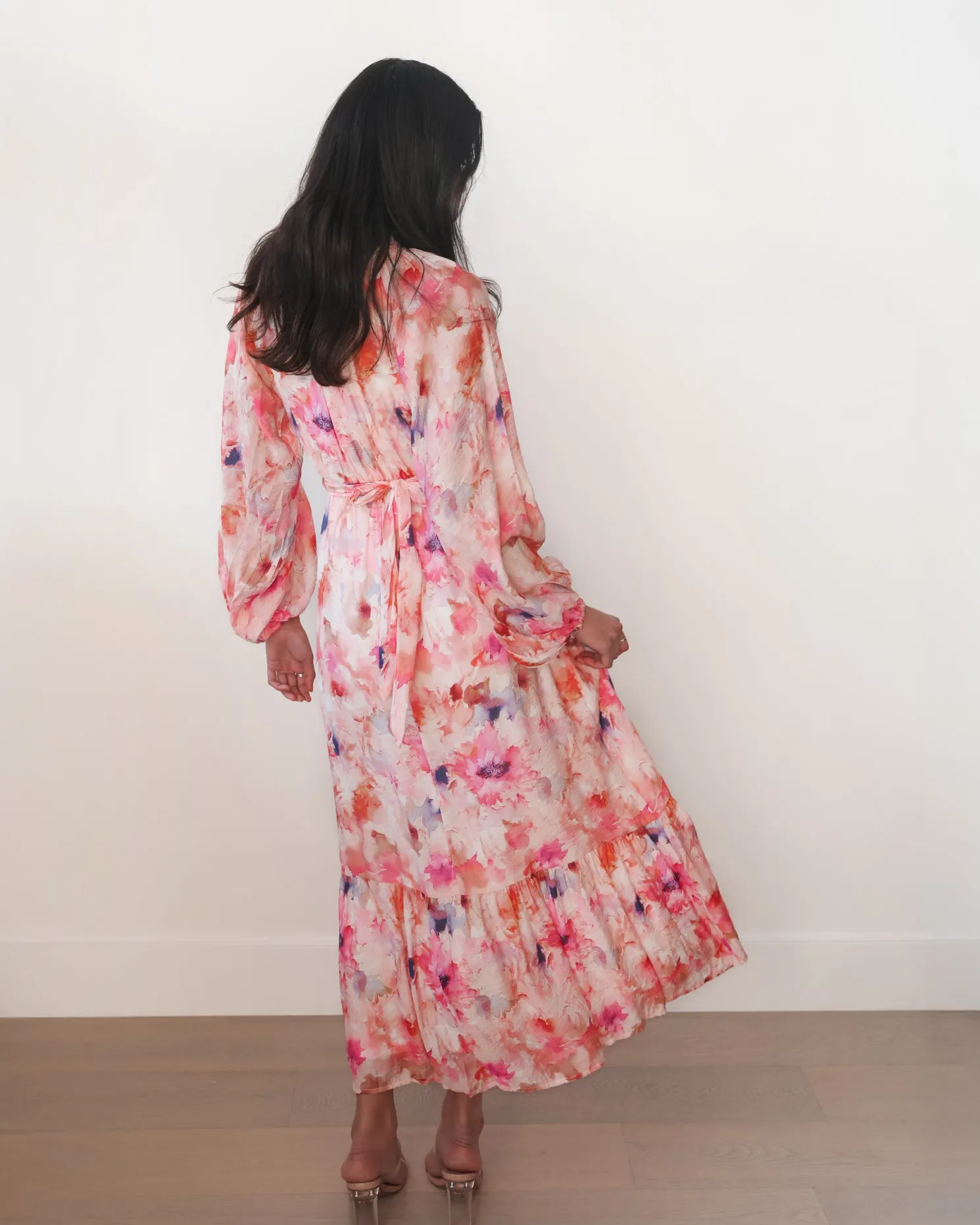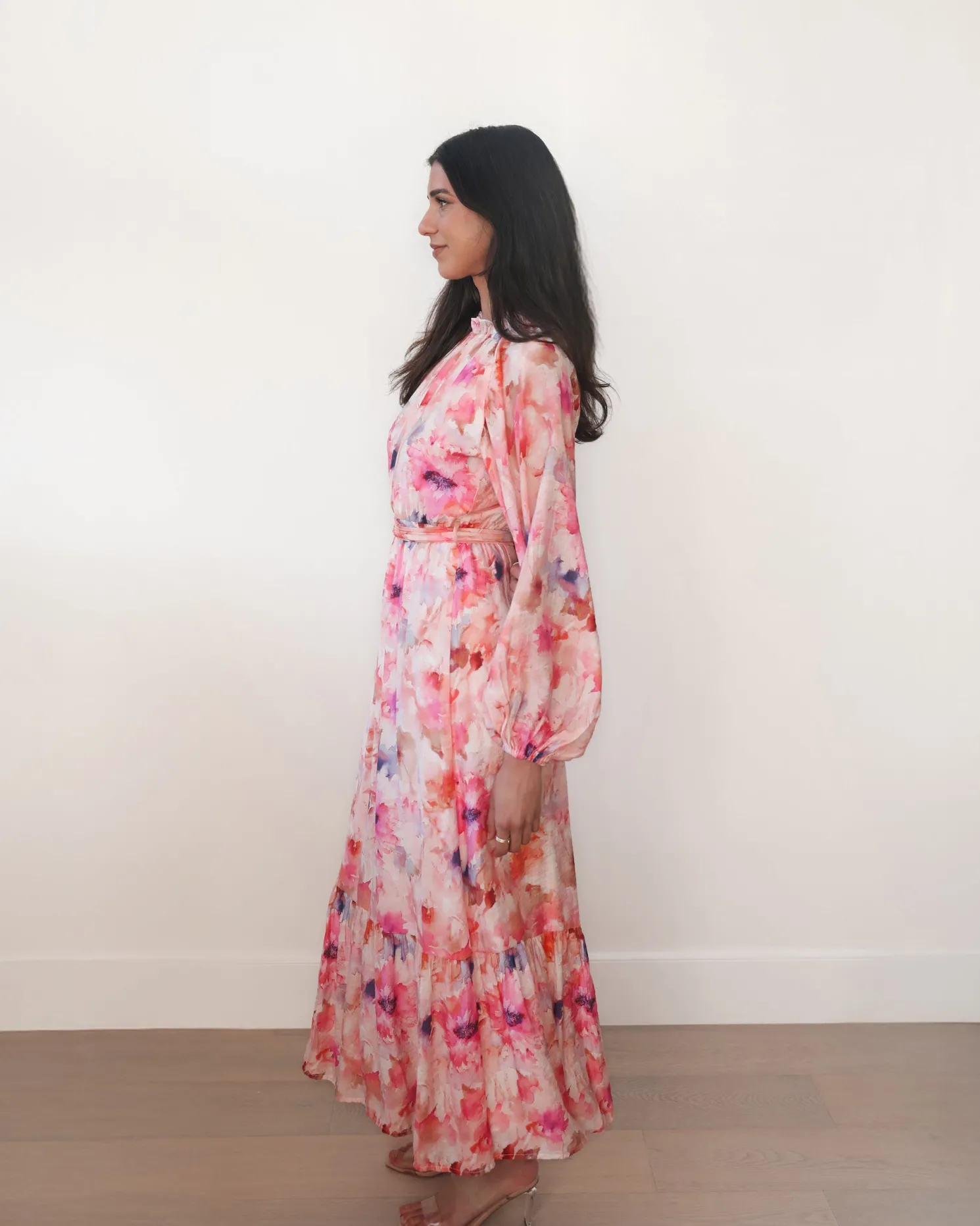 Our Sereline Dress comes in a pink base multicoloured floral patterns. Draping you in effortless romance, this number features a dreamy silhouette, frilled neckline, long bishop sleeves, waist tie, flowy skirt, and maxi length hem. Light waves in your hair and a rosy lip tint will give you fresh finish!