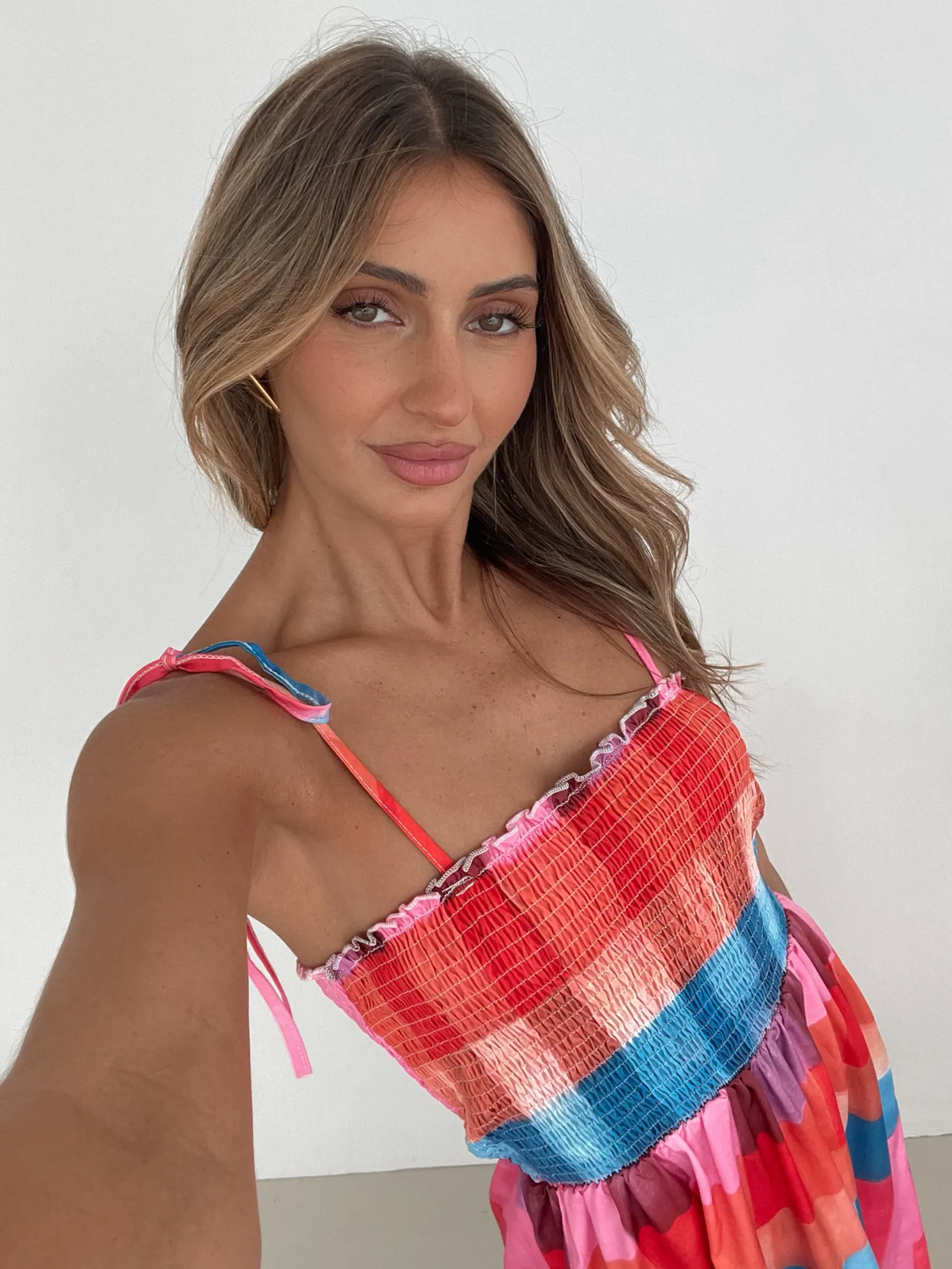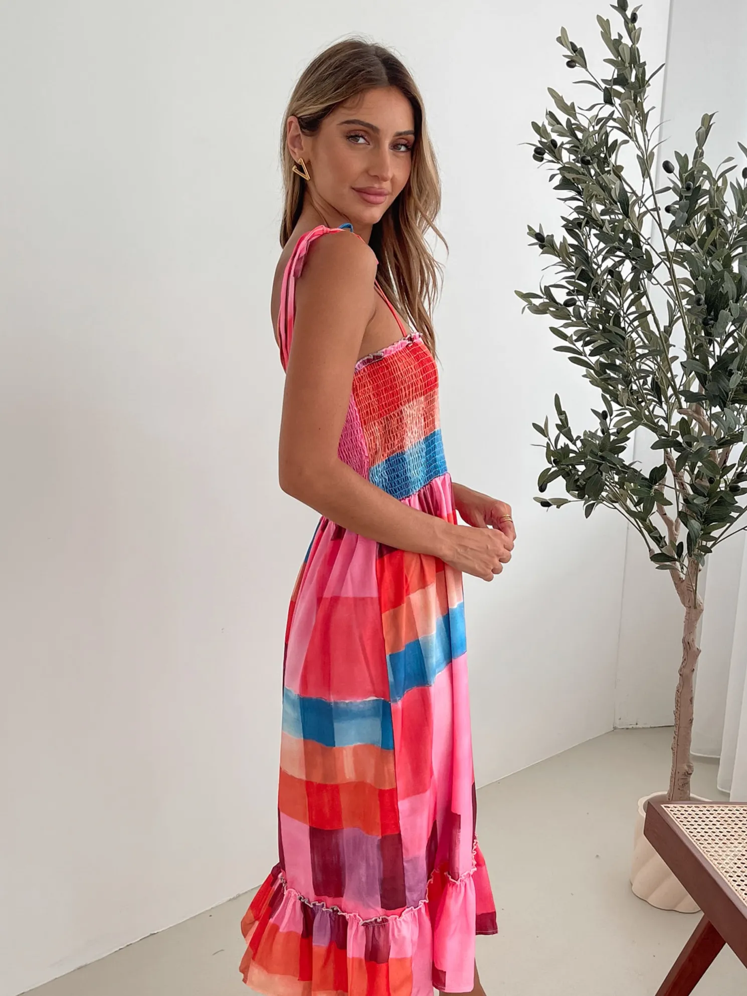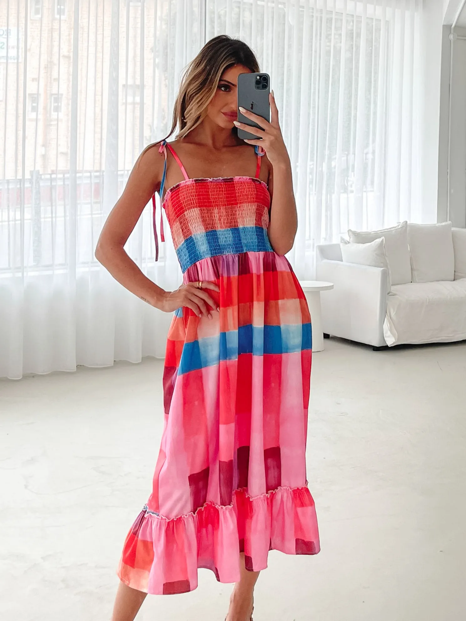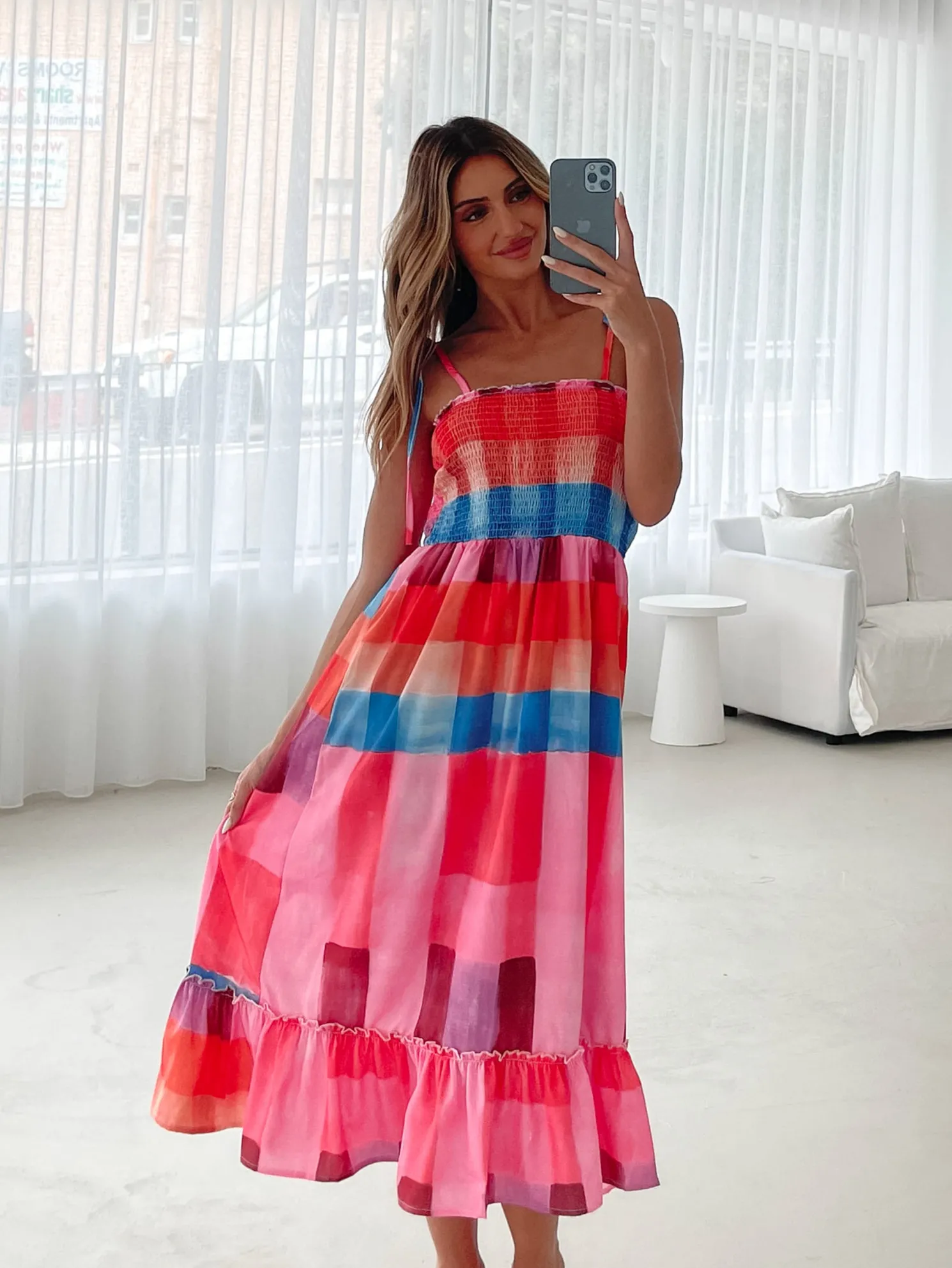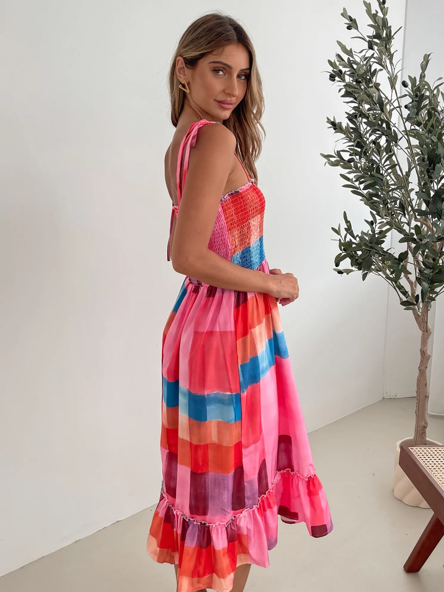 Our Tafoya Dress comes in a multi toned pattern. Crafted with a striking check print in an array of bold, complementary colours, this piece is designed with spaghetti straps, square neckline, smocked bodice, flowy skirt and midi length hem. Pair this statement piece with chunky boots for an edgier look or dress it down with classic flats for a relaxed vibe.