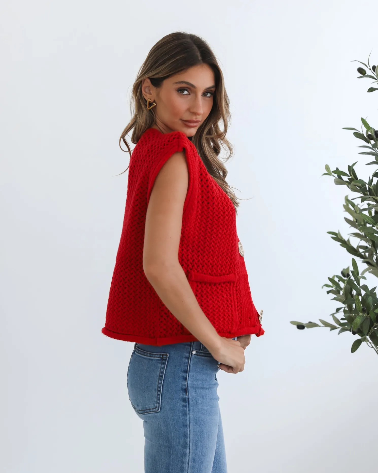 Our Vasha Knit Top comes in a red colour. A staple that works in every season and can be styled solo or layered for added dimension, this piece is sleeveless and features a round neckline, centre-front buttons and relaxed fit. Wear it with skirt or pants, the choice is yours!