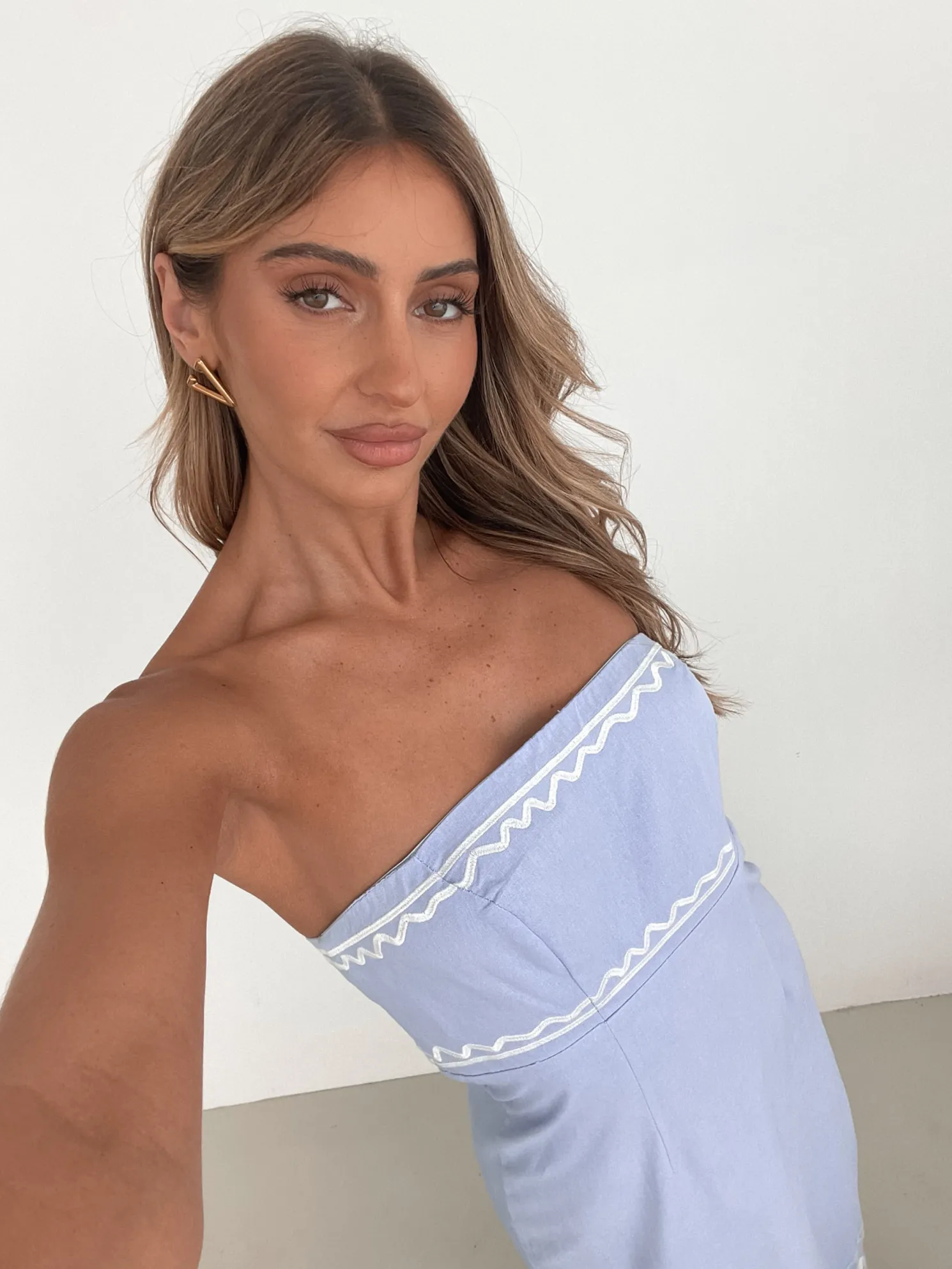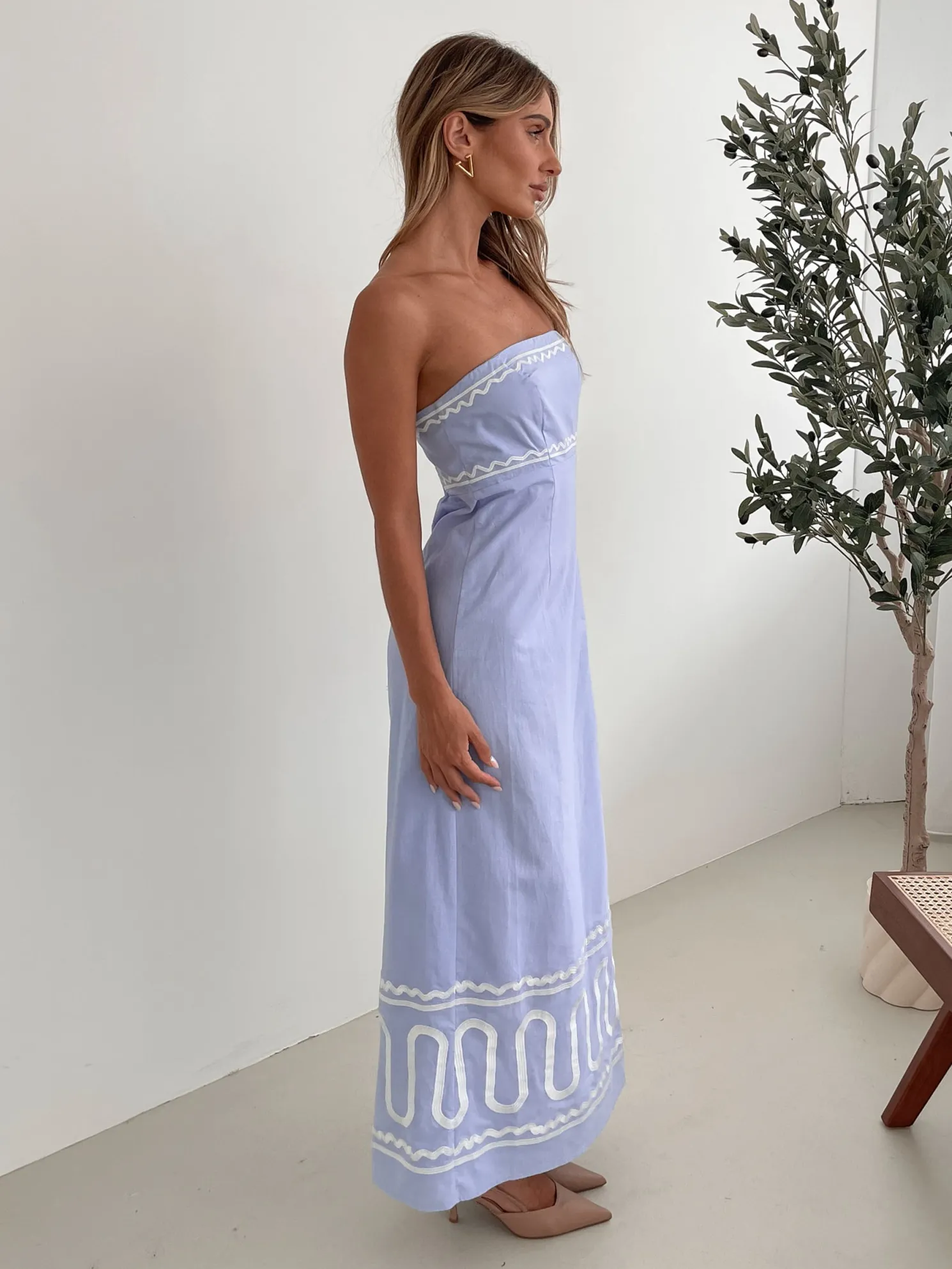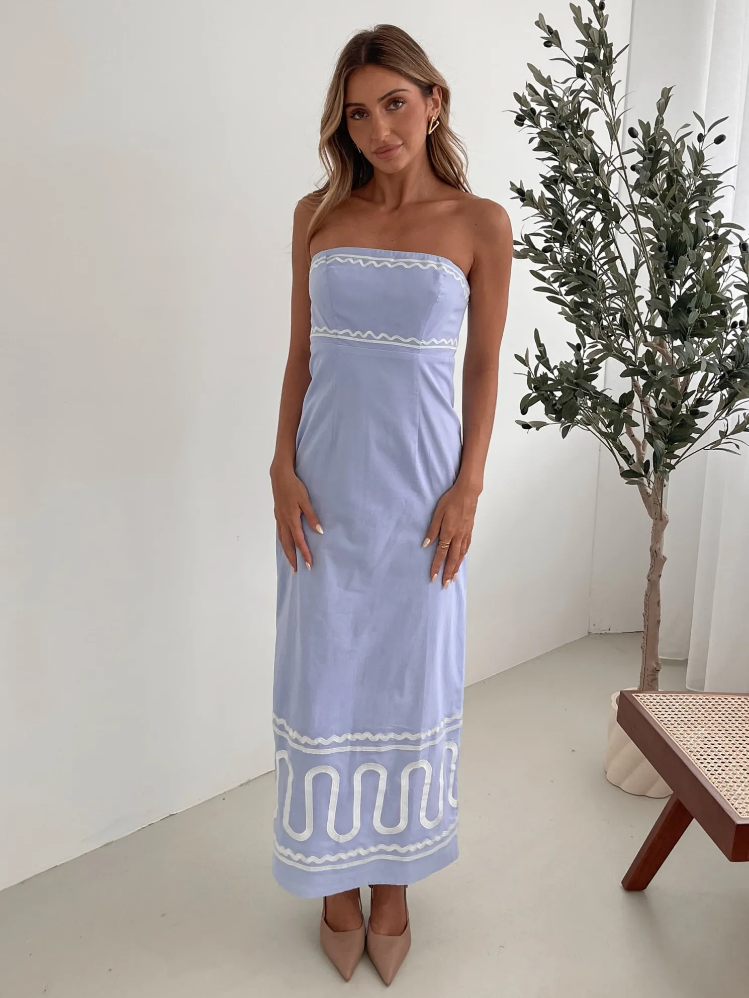 - Key Features: Tube style top. Fit to flare silhouette. Maxi length hem.