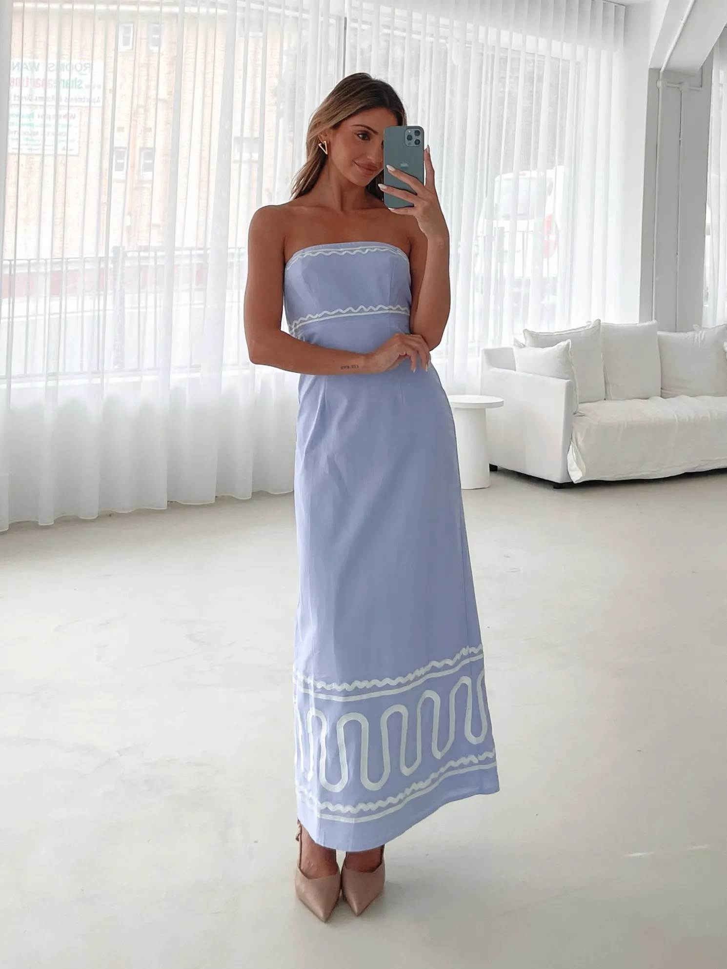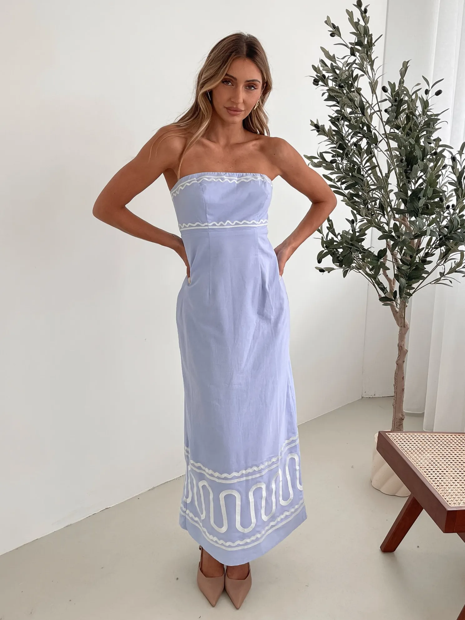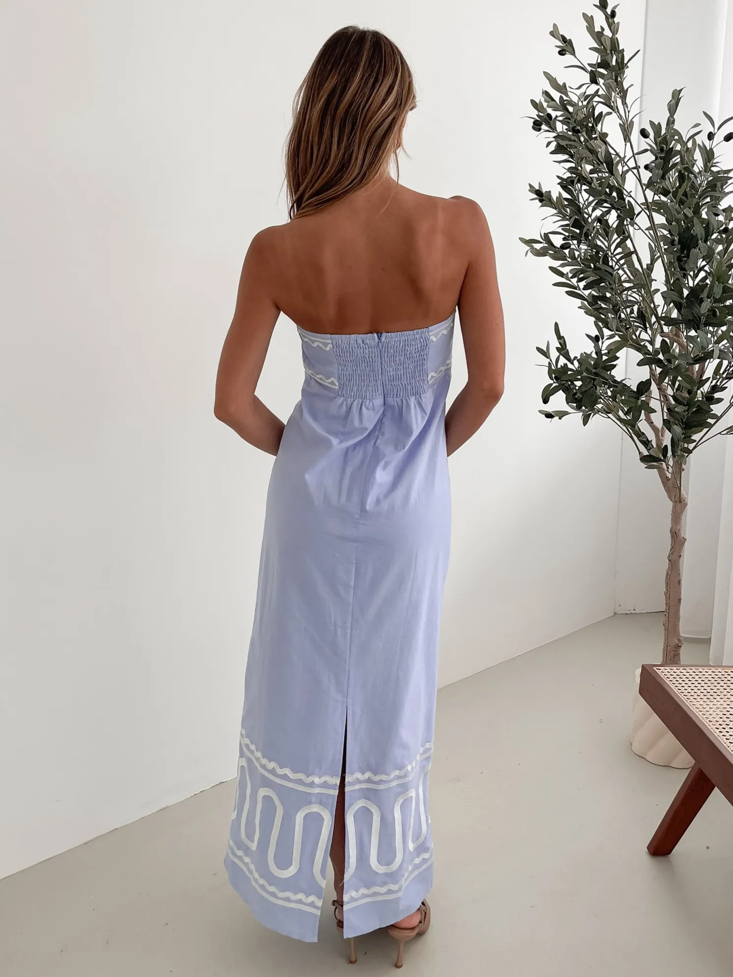 Our Zareena Dress comes in blue and white tones. When you seek not just to be seen, but to be felt this number is perfect with its tube style top, fit to flare silhouette, beautiful patterns and maxi length hem. For an elevated look, slip into metallic heels, adding just the right amount of shimmer to reflect the dress’s artistic print!
