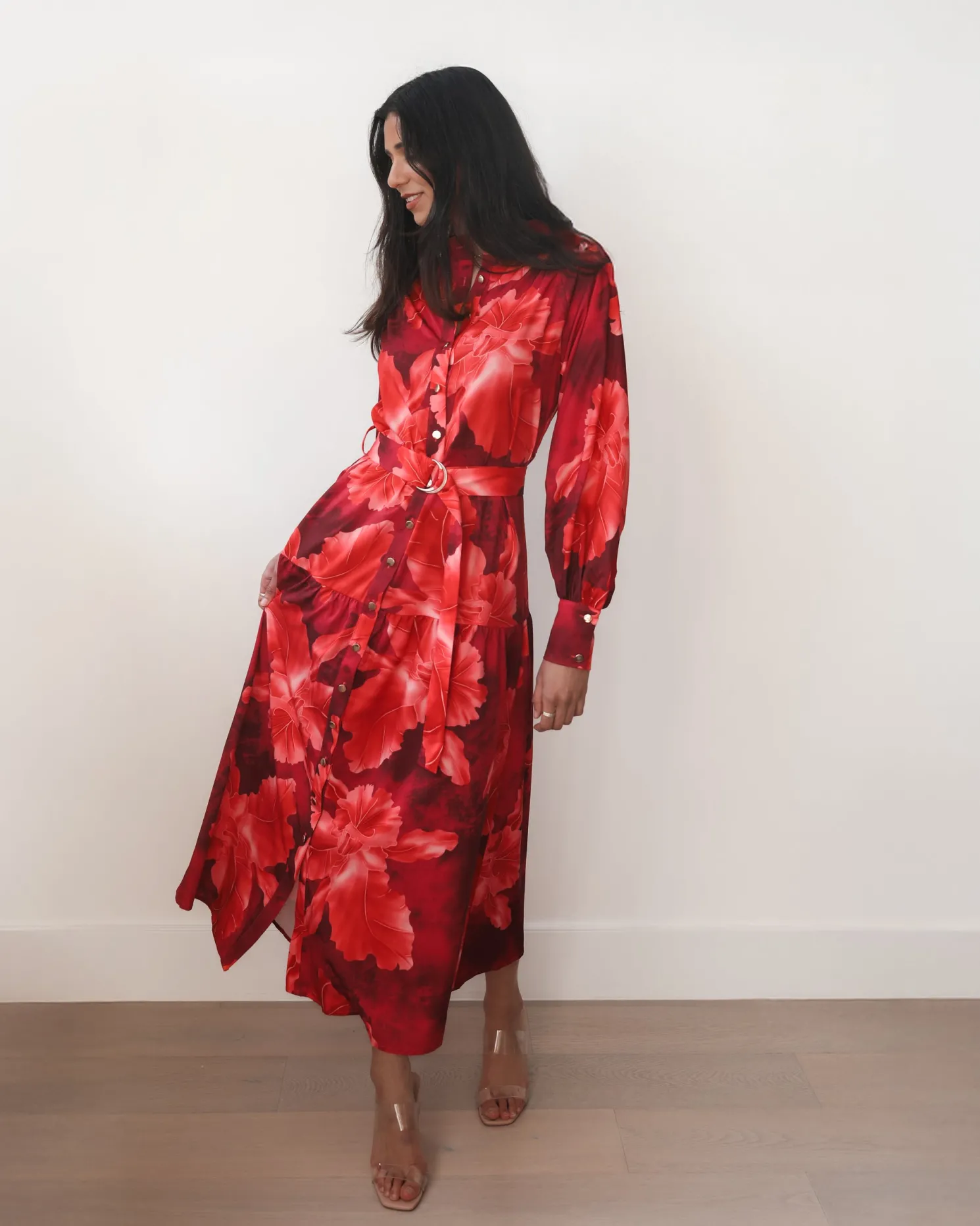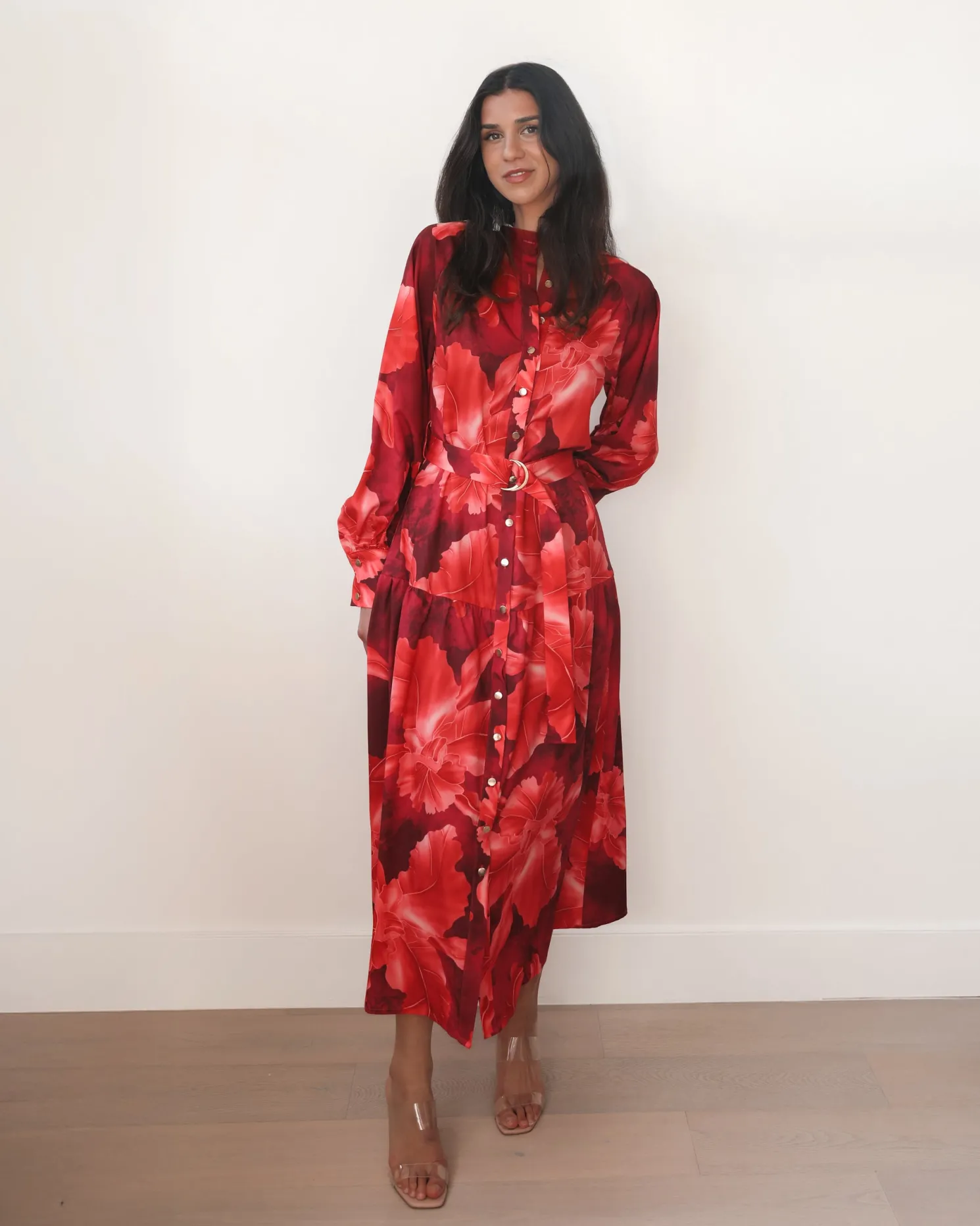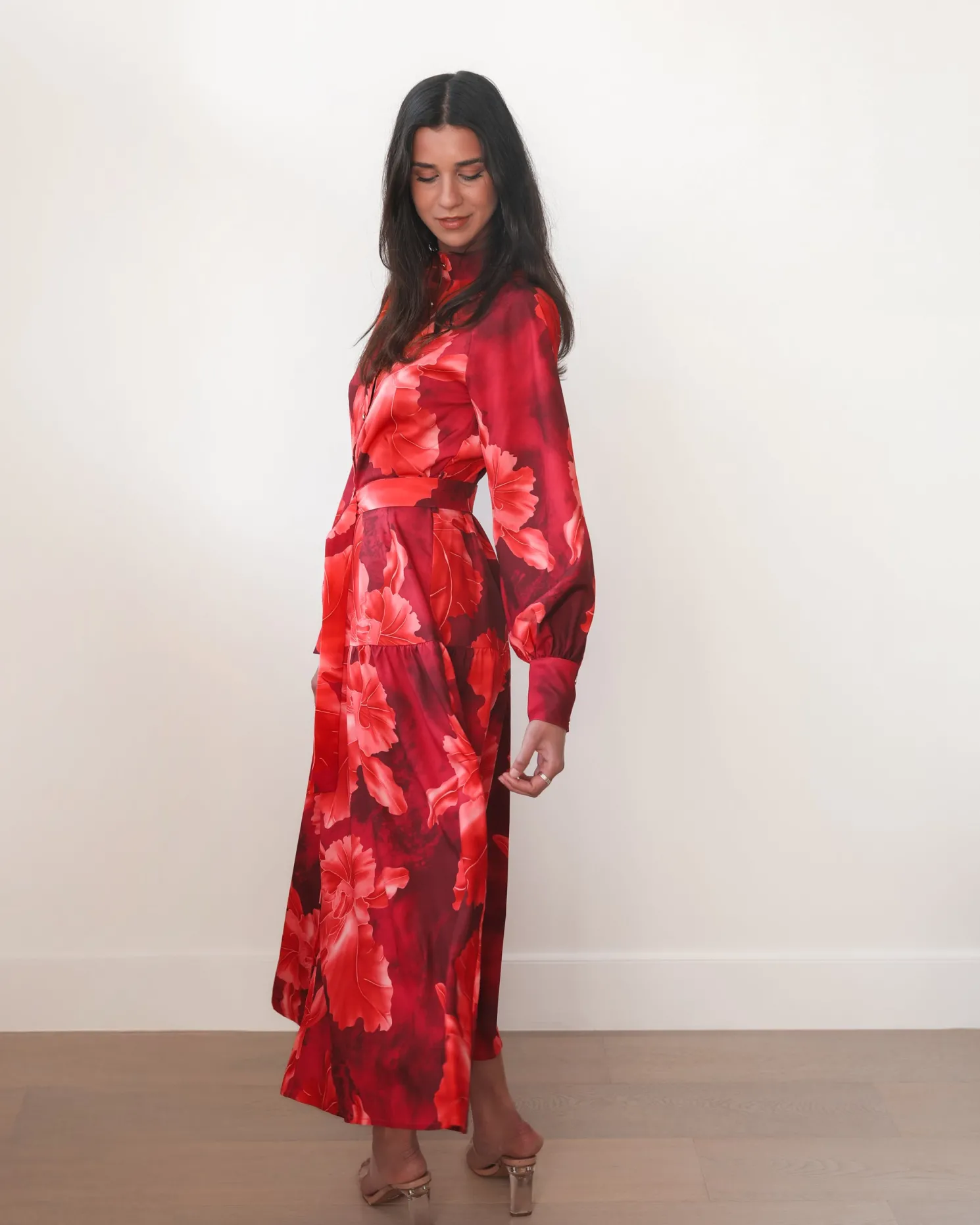 Our Zirella Dress comes in shades of red. Your floral-powered power move, this one-piece wonder features a collar, centre-front buttons, long balloon sleeves with cuffs, waist belt, flowy skirt and maxi length hem. Look extra beautiful with strappy heels, a tousled ponytail, and your signature lipstick!