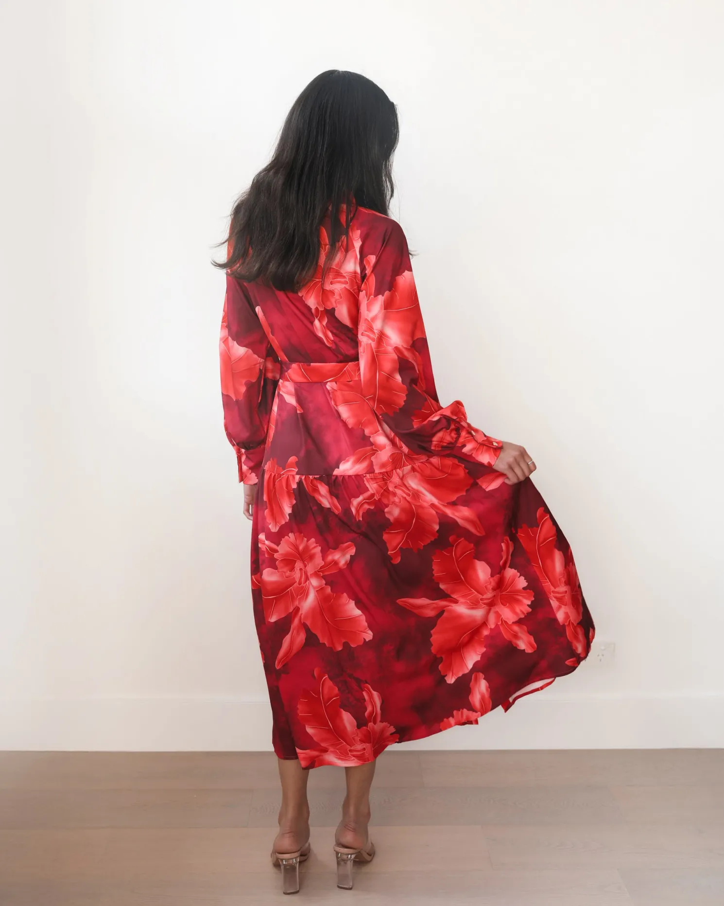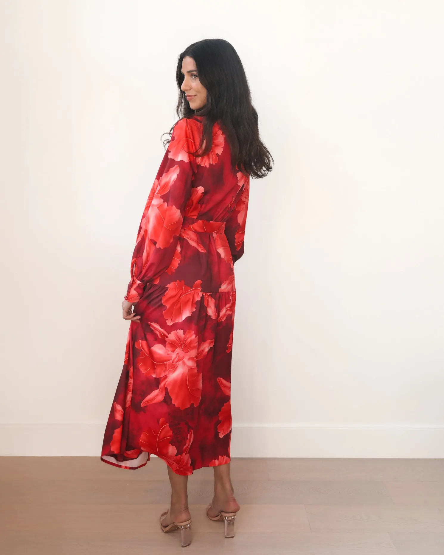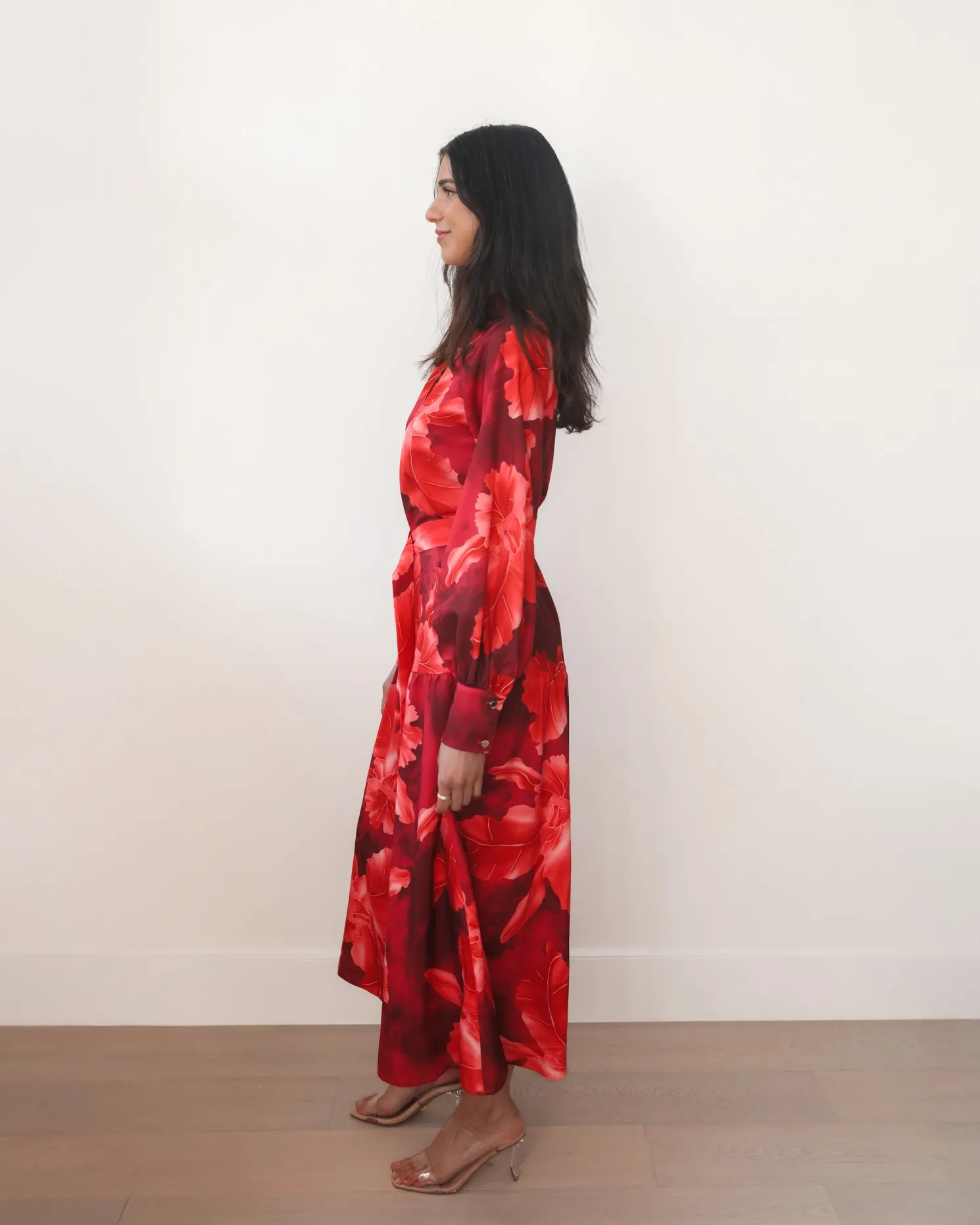 Our Zirella Dress comes in shades of red. Your floral-powered power move, this one-piece wonder features a collar, centre-front buttons, long balloon sleeves with cuffs, waist belt, flowy skirt and maxi length hem. Look extra beautiful with strappy heels, a tousled ponytail, and your signature lipstick!