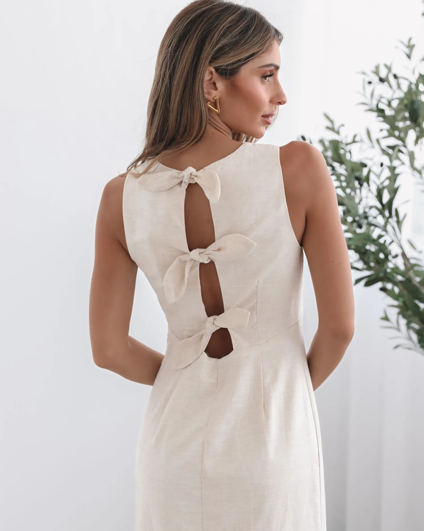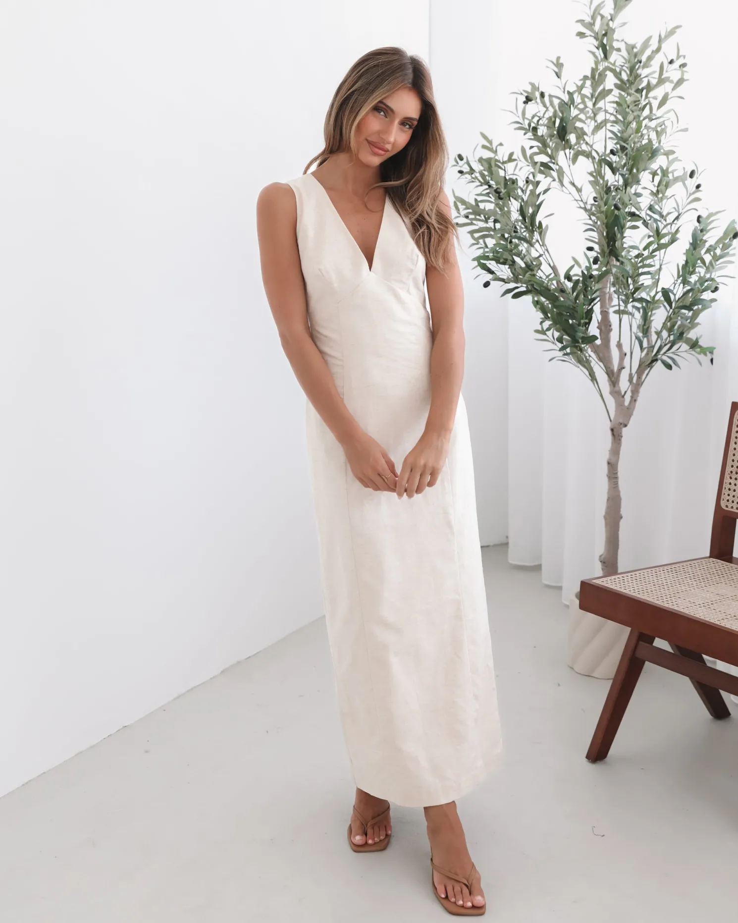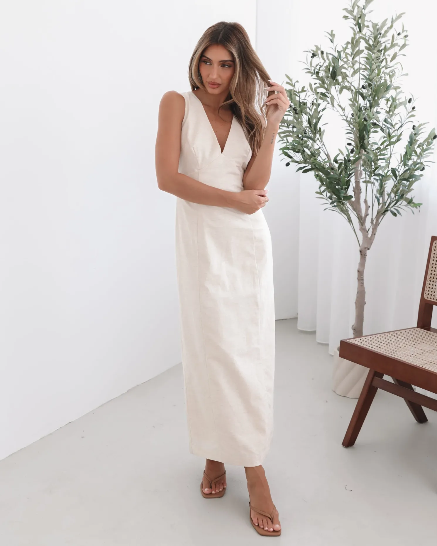 Our Abriana Dress comes in a cream colour. Understated yet undeniably captivating, this number is designed with a plunge neckline, straight skirt and midaxi length hem. Complete the look with sleek nude heels for an elongating effect and pearl drop earrings for an air of vintage romance!