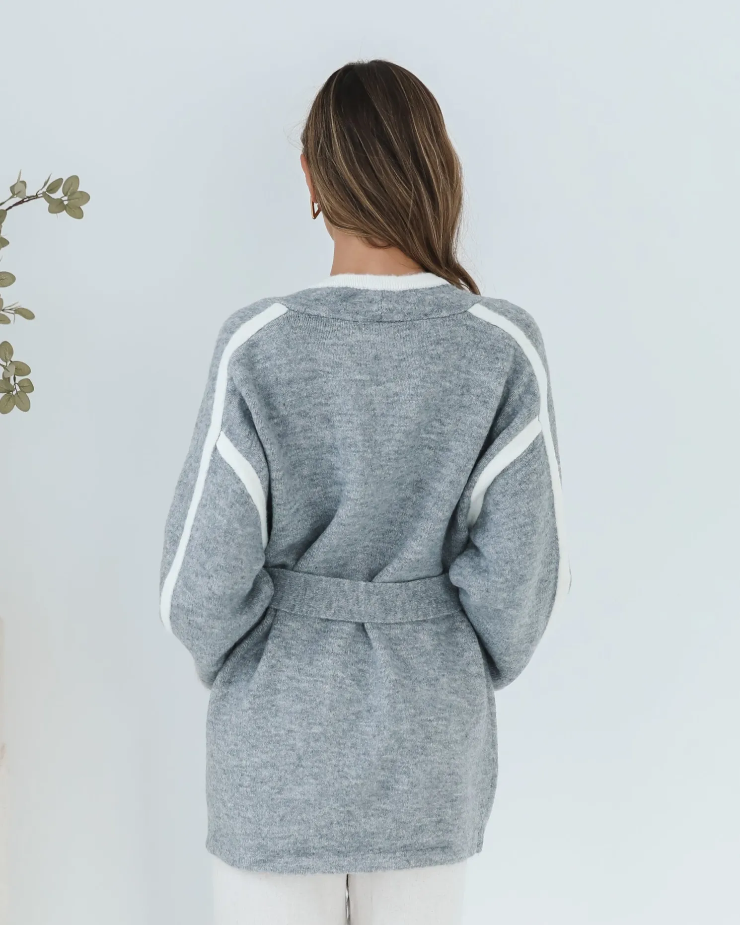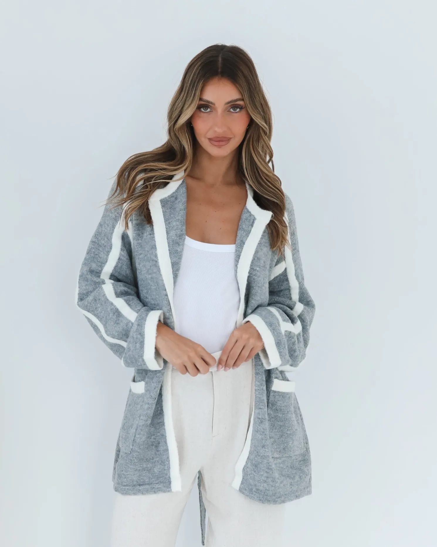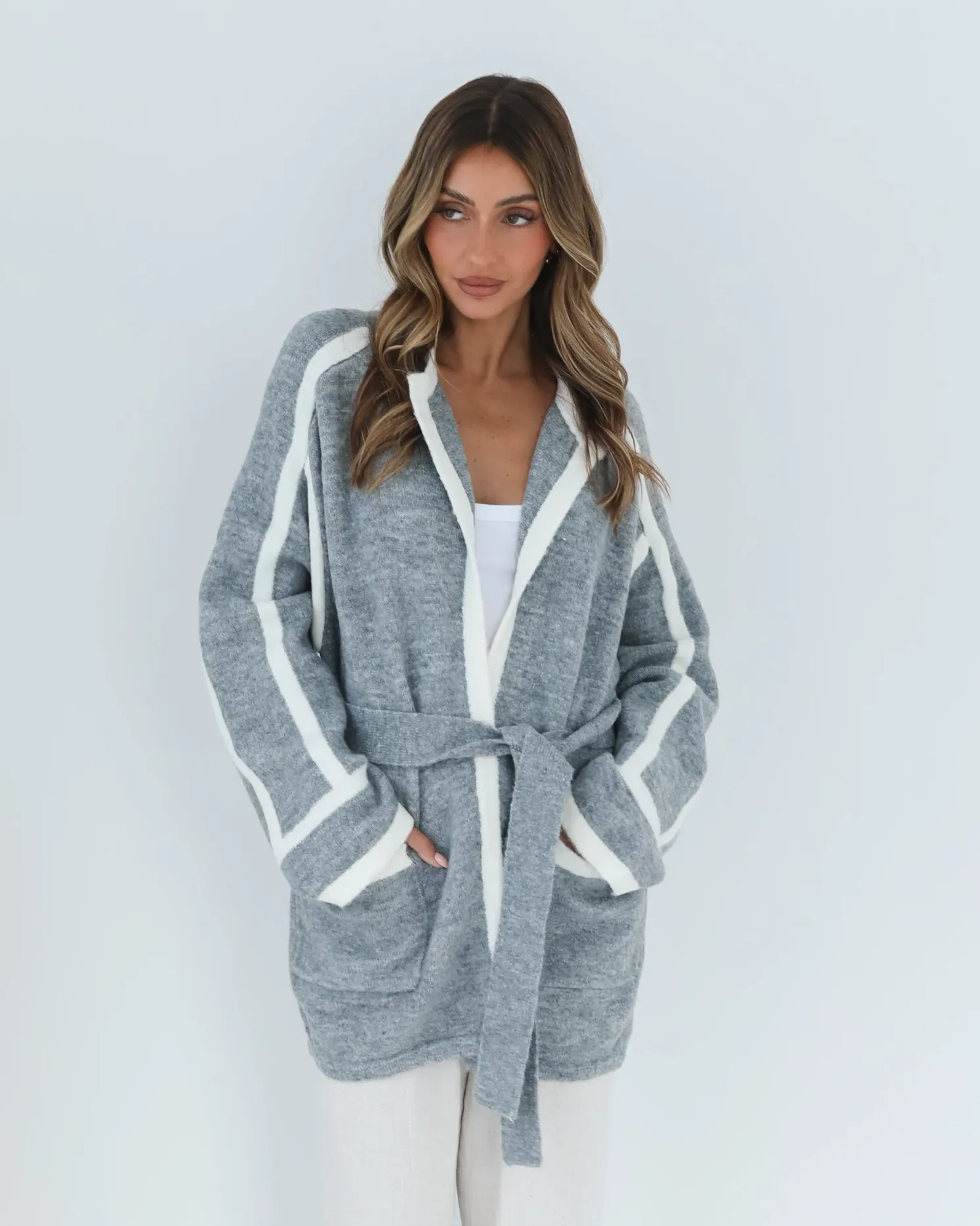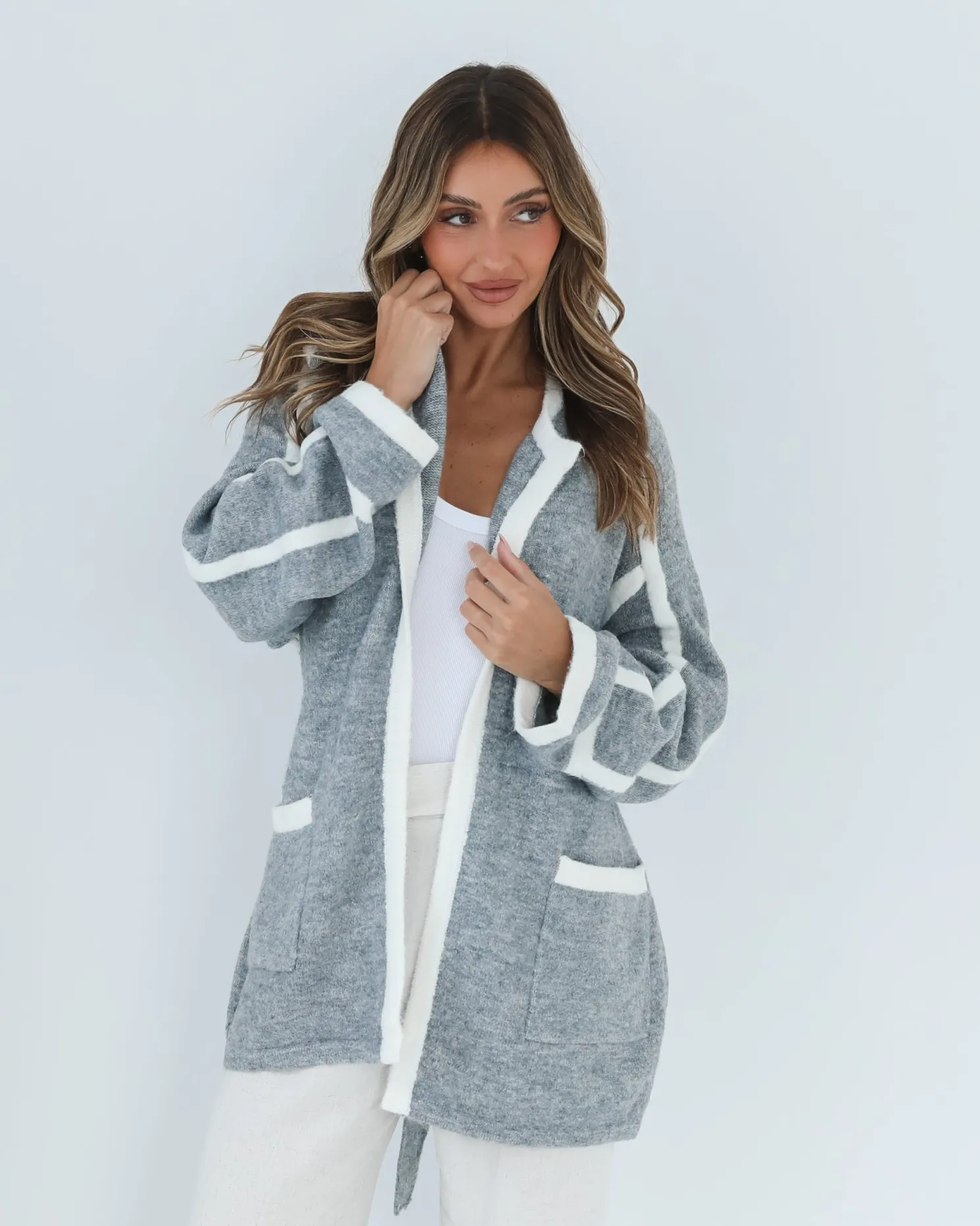 Our Adelle Coatigan comes in grey and white tones. Power walk your way to autumn with this outerwear that features long sleeves, side pockets, waist belt and thigh length hem. Style it with a classic tee & leather pants!