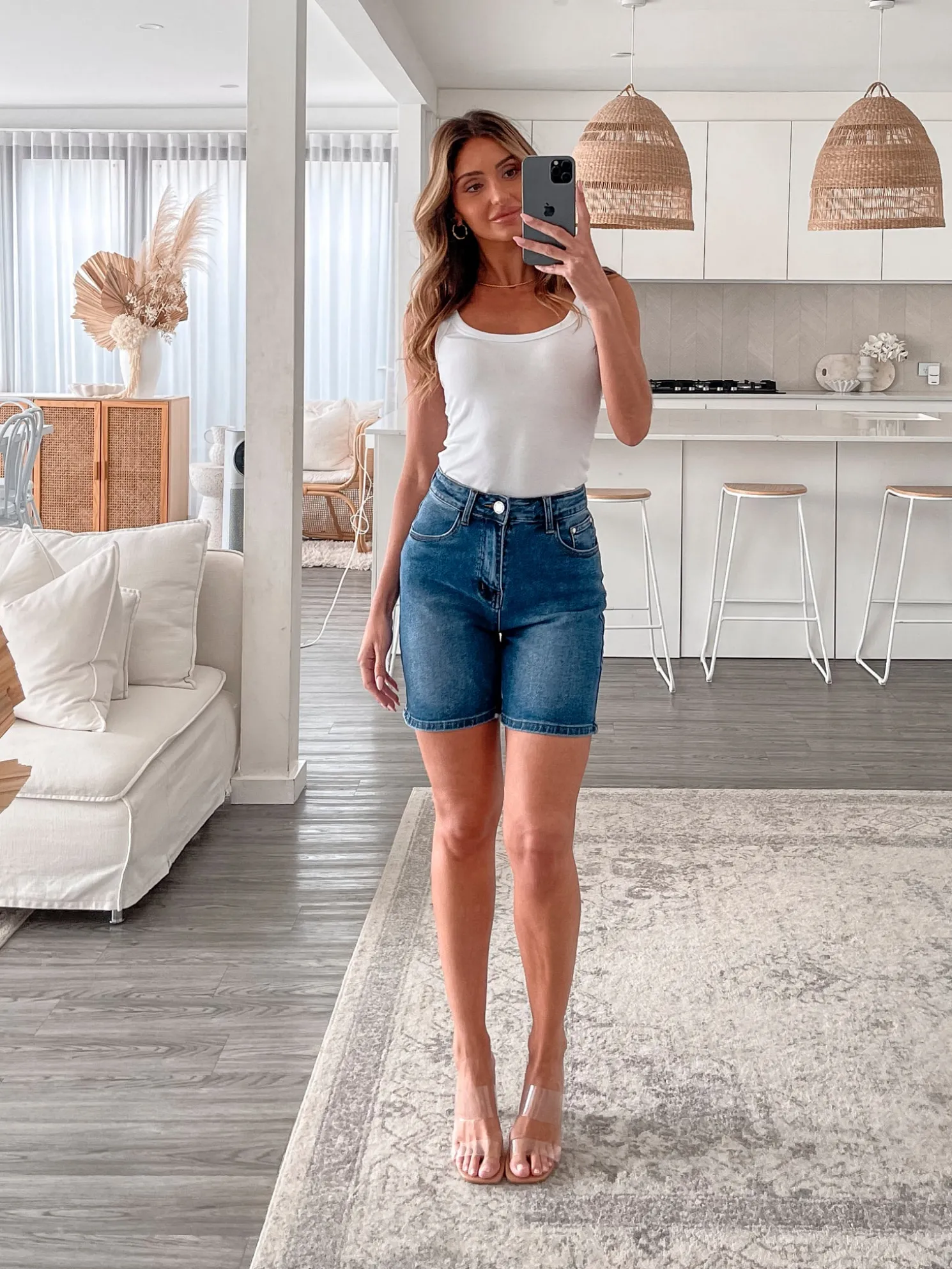 Our Alaiya Shorts come in a dark denim tone. Bringing that classic denim vibe with a modern edge, this piece is designed with a high waist fit, belt loops, button and quarter zip closure, side pockets and above the knee length hem. Pair it with a tee and sneakers!
