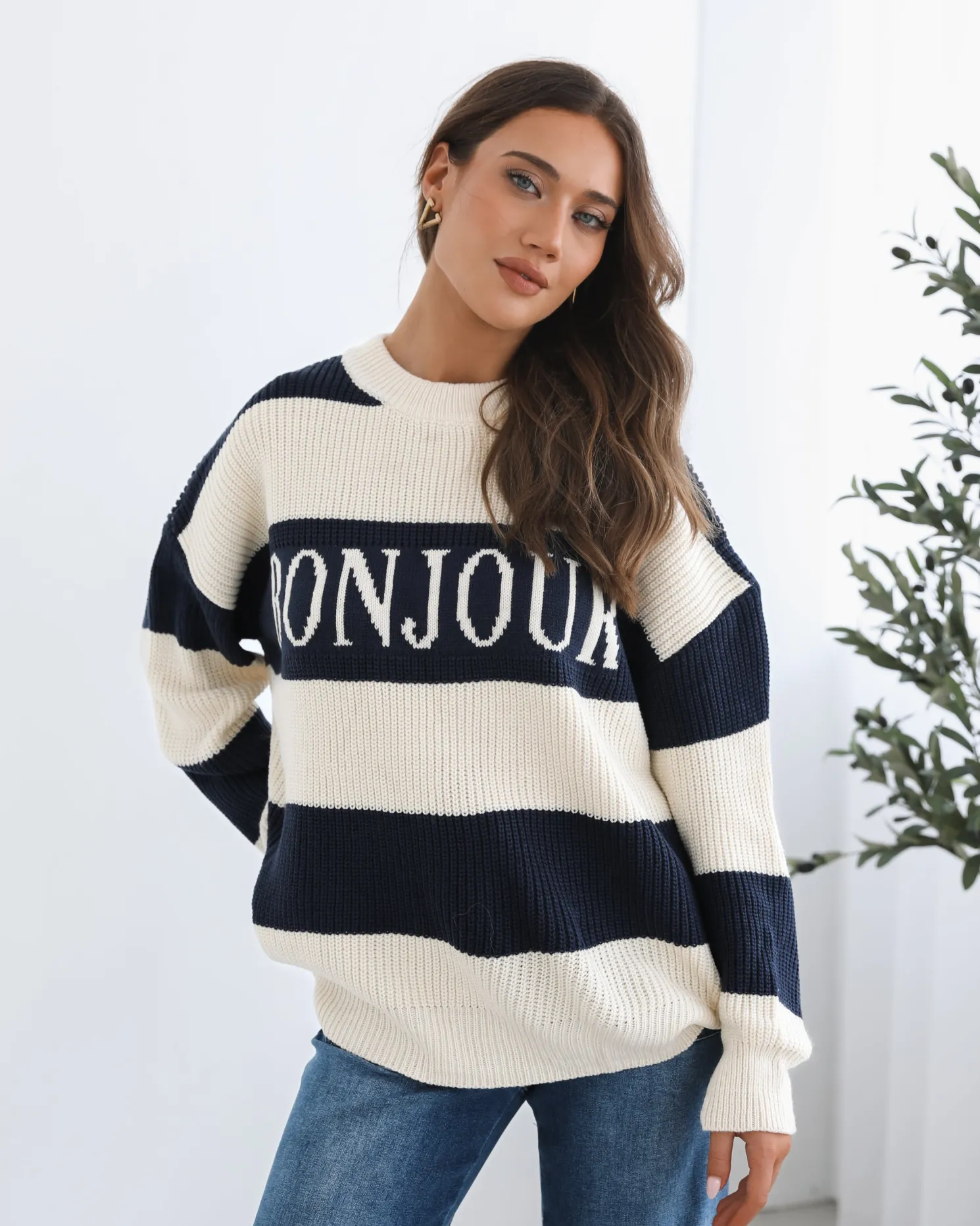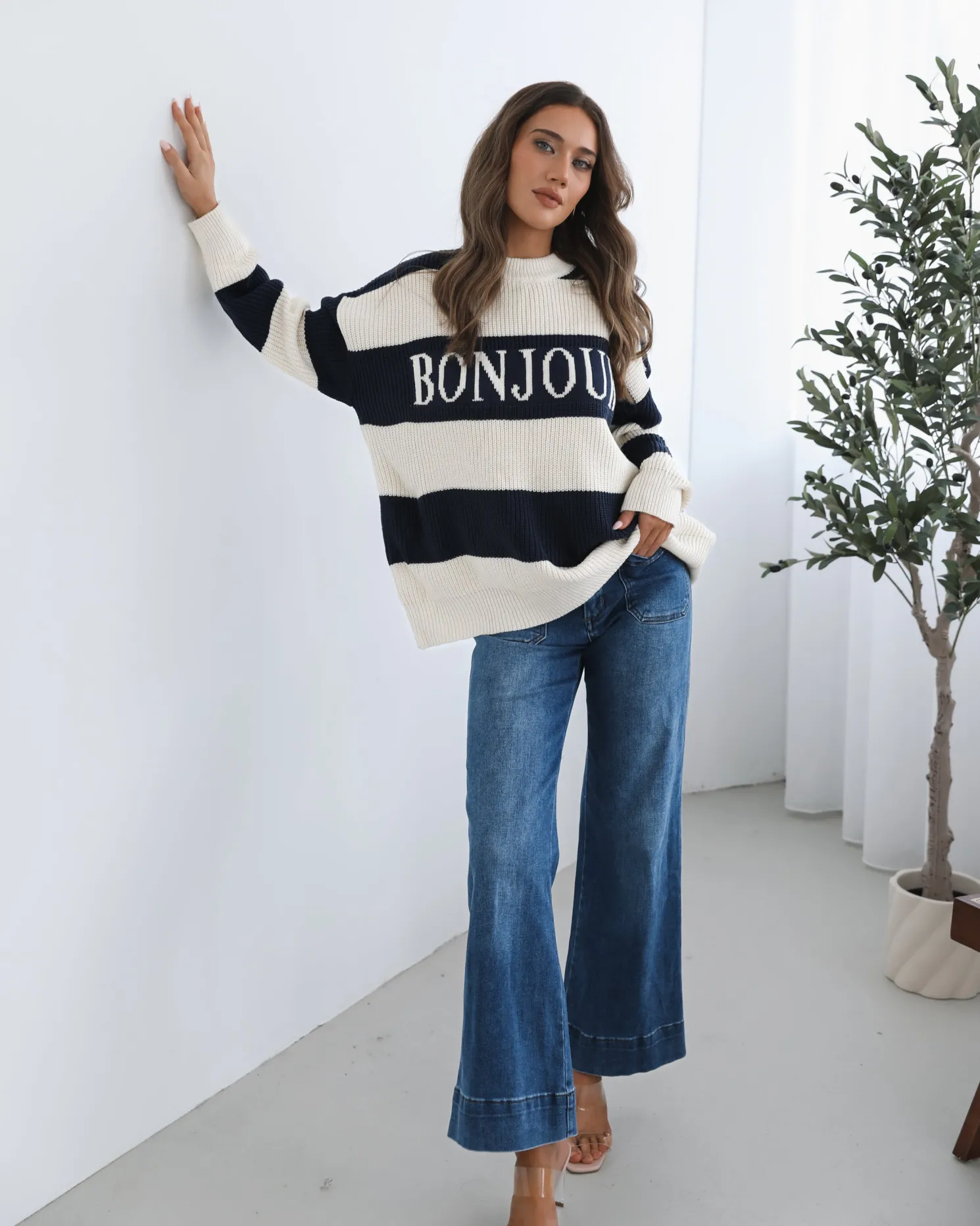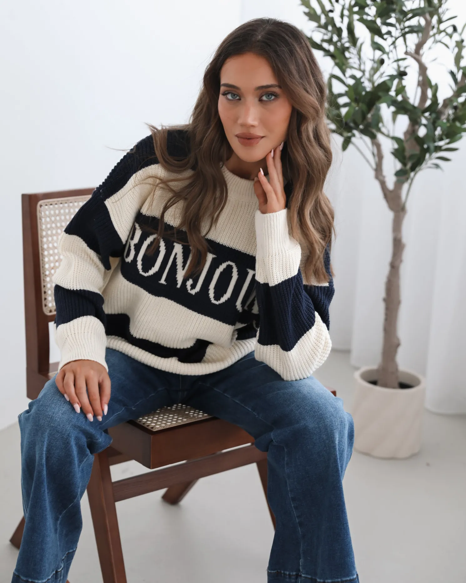 Our Alisson Knit comes in navy and cream tones. A masterful fusion of comfort, colour, and style, this top features a semi-high round neckline, long sleves, ‘bonjour’ print and relaxed fit. Wear it with dark jeans and ankle boots for a chic, casual look!