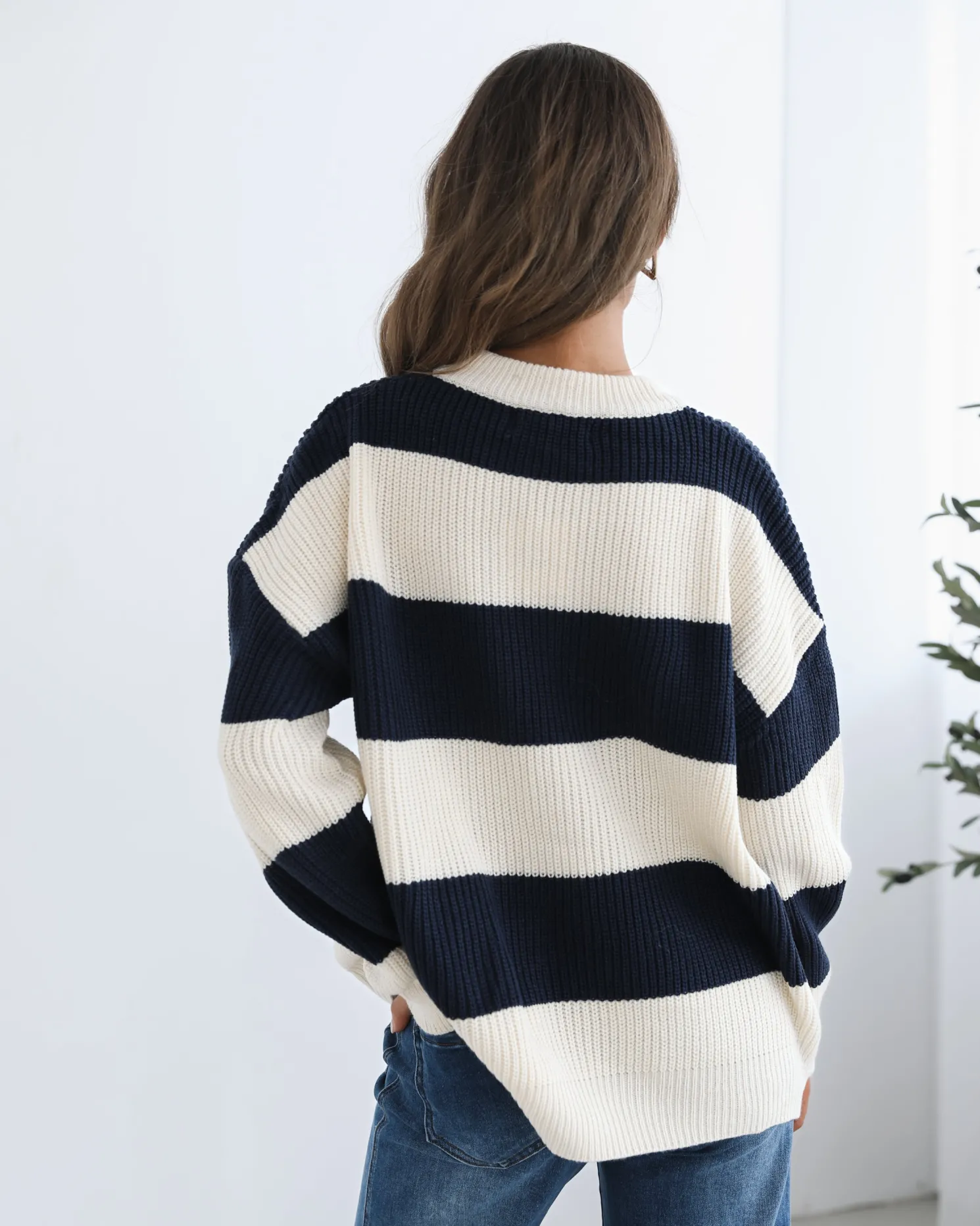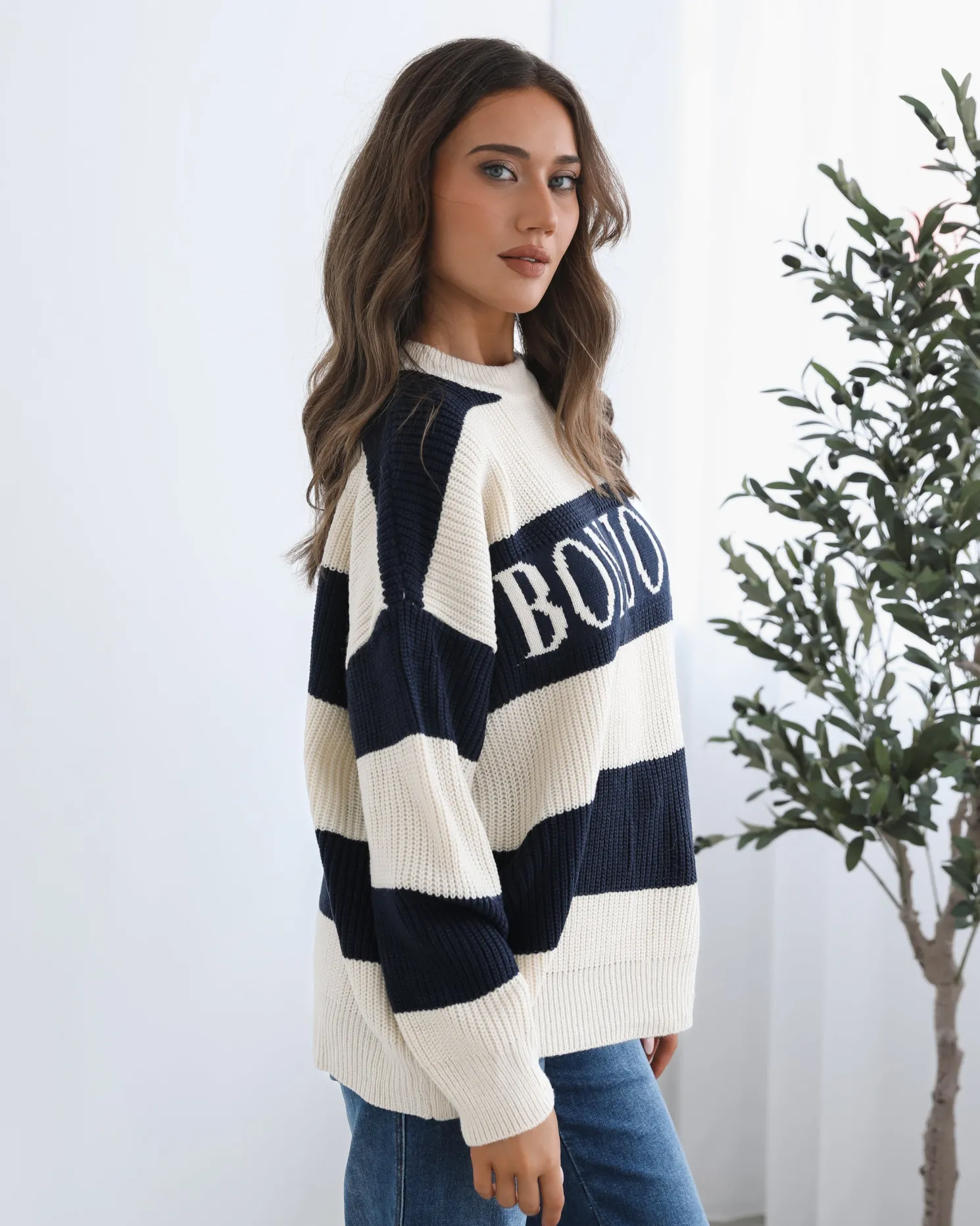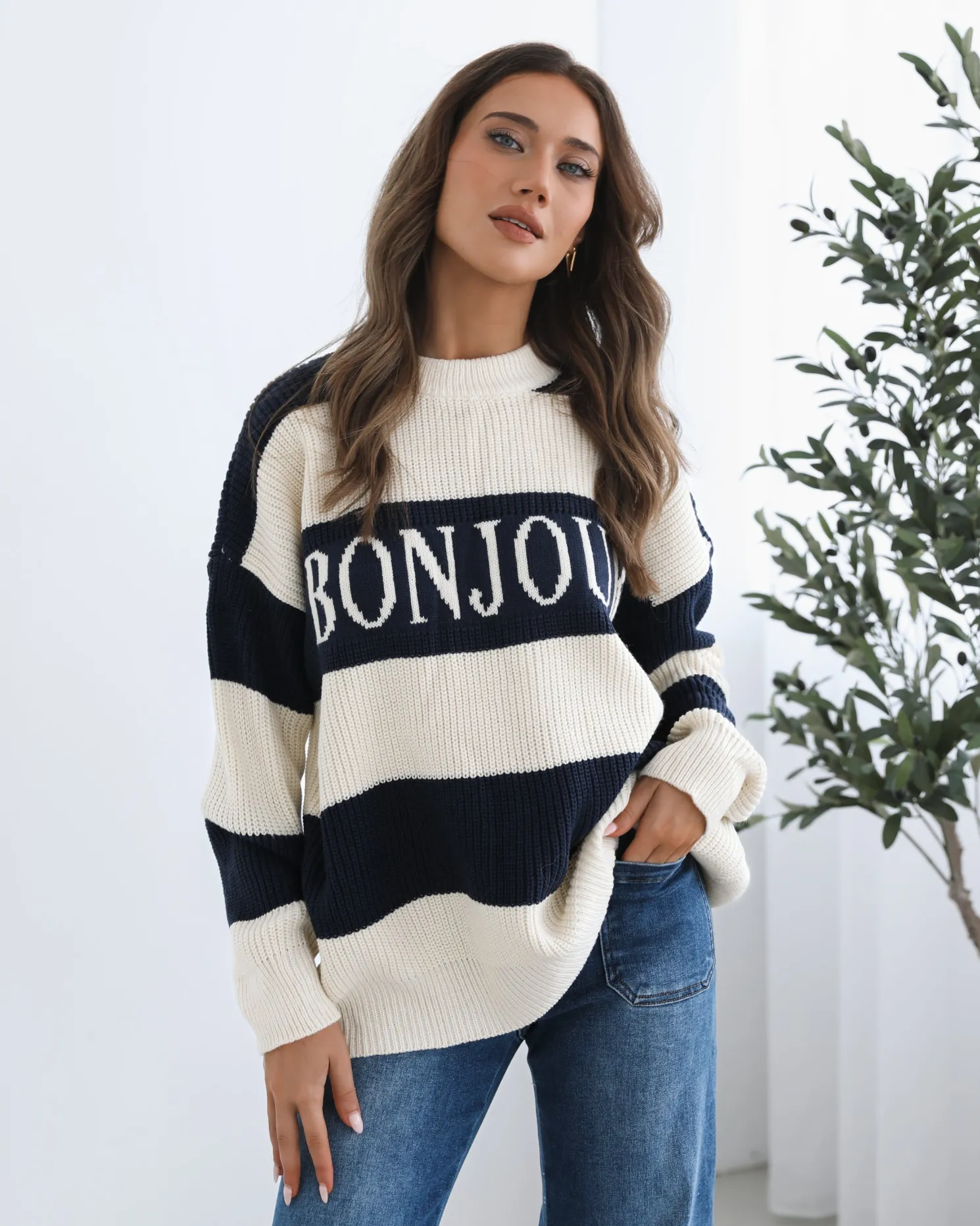 Our Alisson Knit comes in navy and cream tones. A masterful fusion of comfort, colour, and style, this top features a semi-high round neckline, long sleves, ‘bonjour’ print and relaxed fit. Wear it with dark jeans and ankle boots for a chic, casual look!