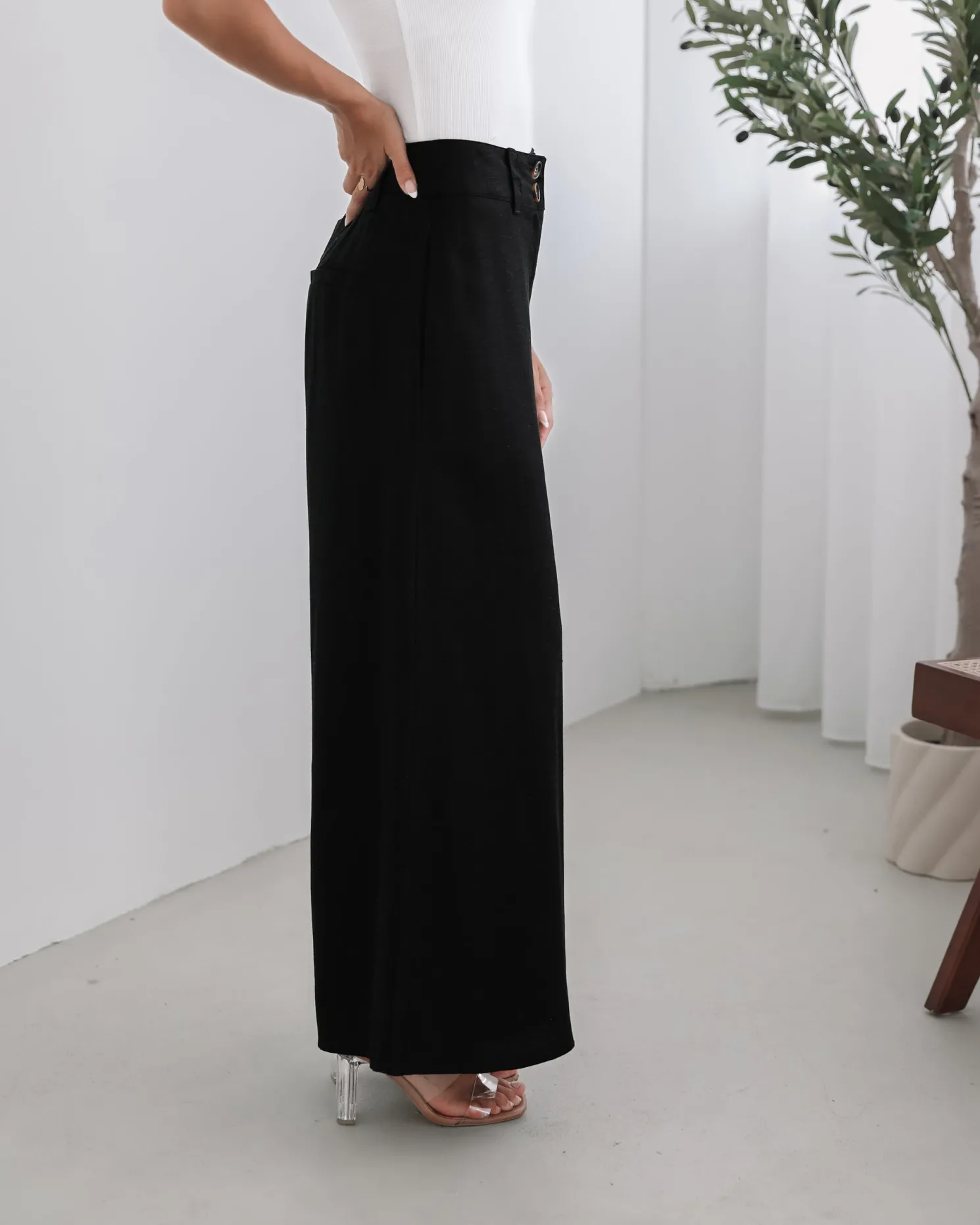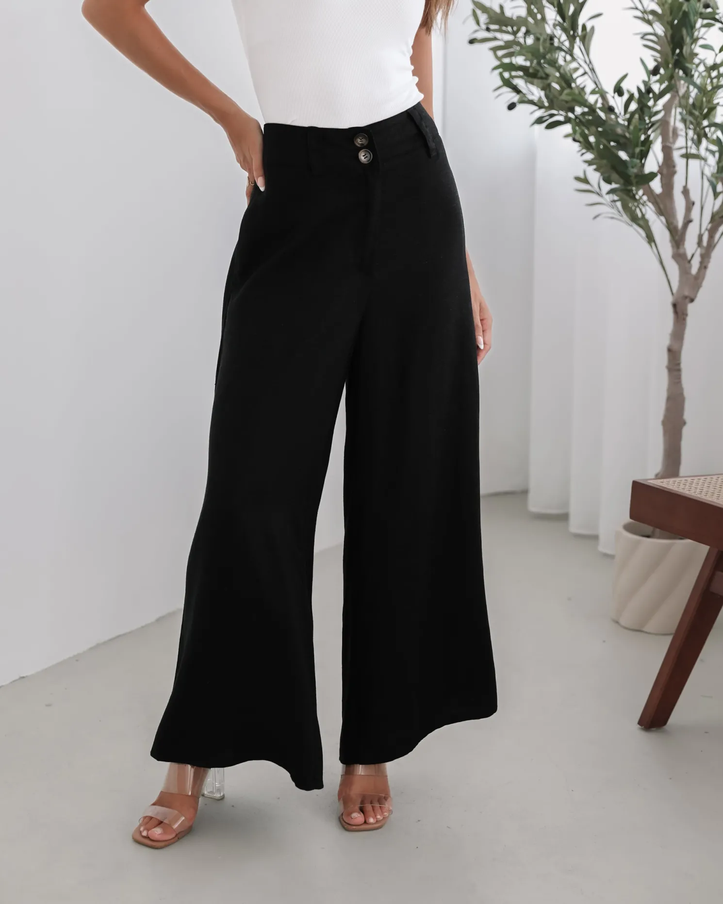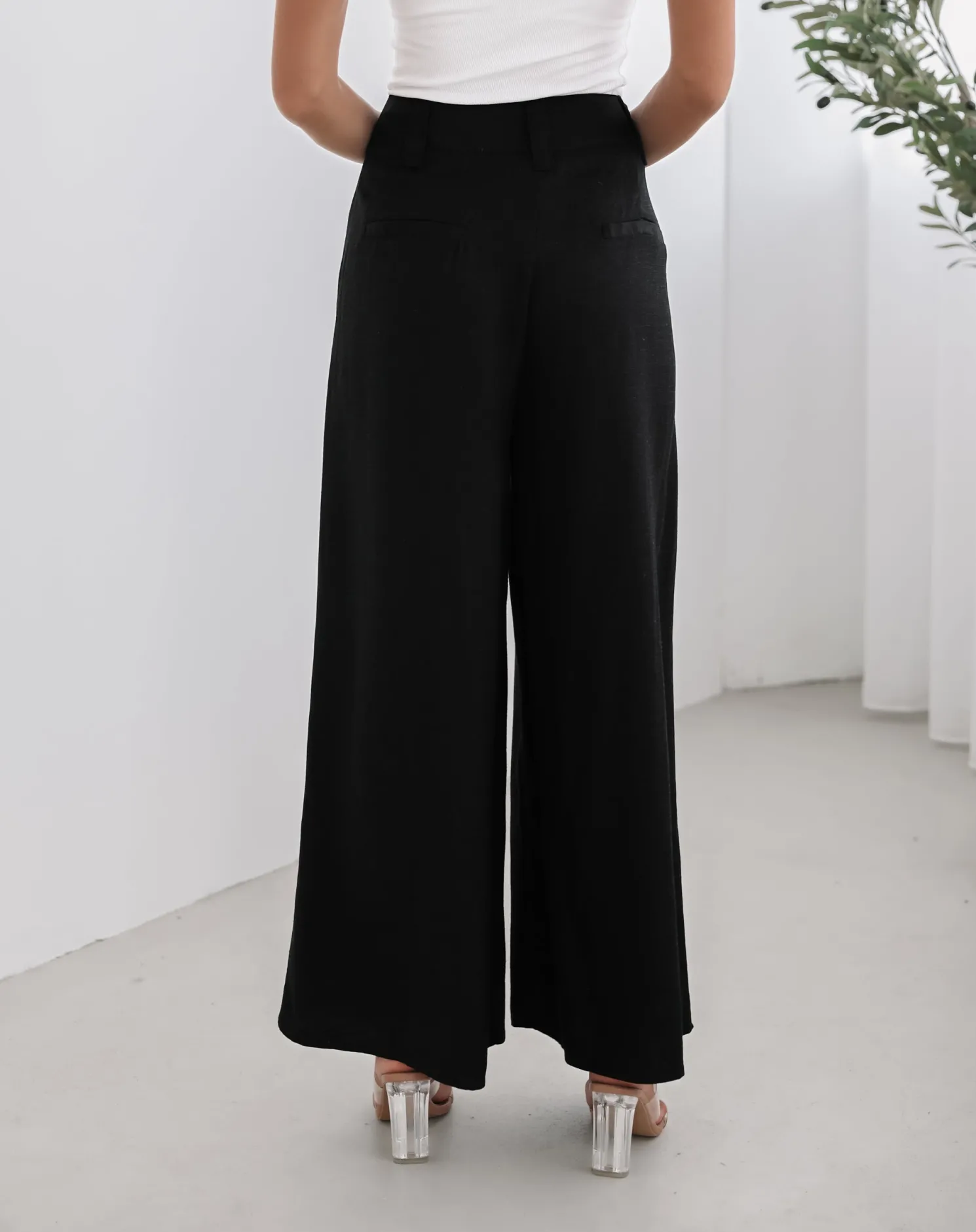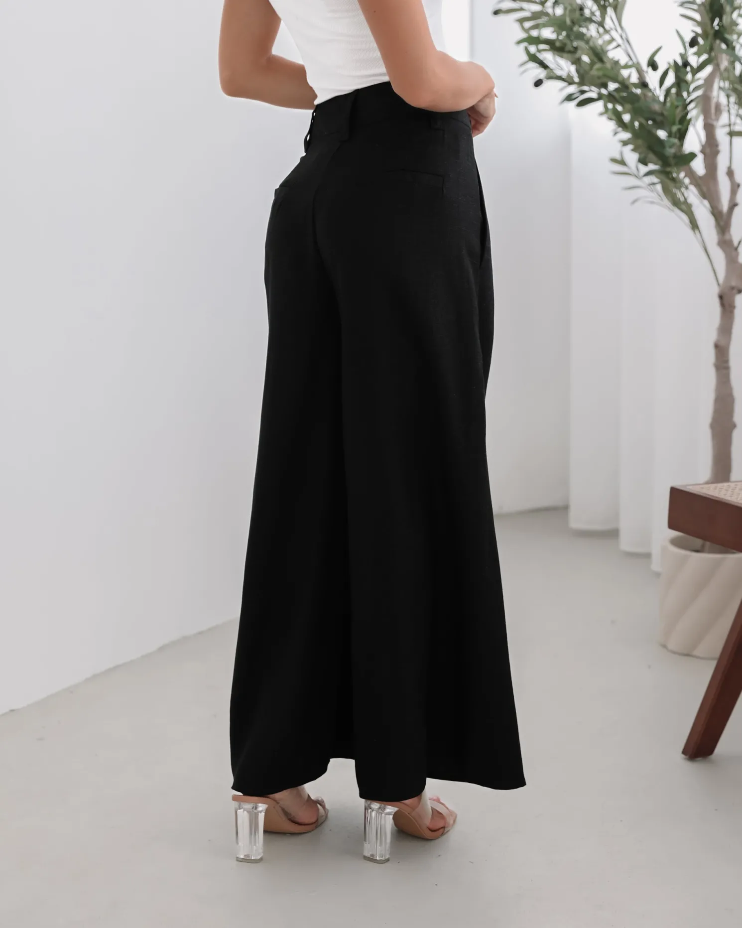 Our Alka Pants come in a black colour. A delicate look to make that subtle statement, this number is high waisted and features a button and zip closure, belt loops, side pockets, long length hem and wide leg fit. Style with a cami and flat sandals!