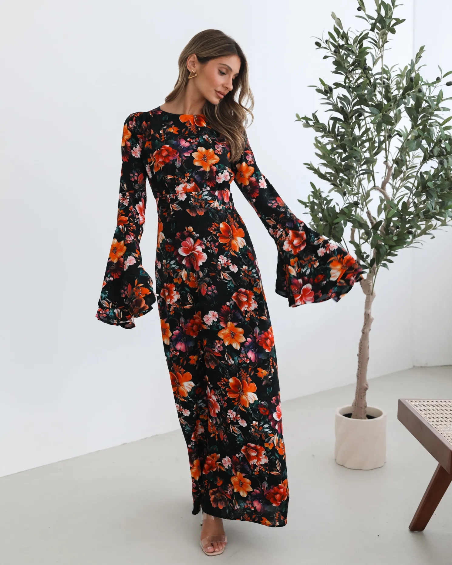 Our Amareya Dress comes in a black base with a multicoloured floral print. Making every moment feel a little more magical, this stunner is designed with a straight neckline, trumpet sleeves, flowy skirt and maxi length hem. Look classic chic with block-heel mules and a structured mini bag!