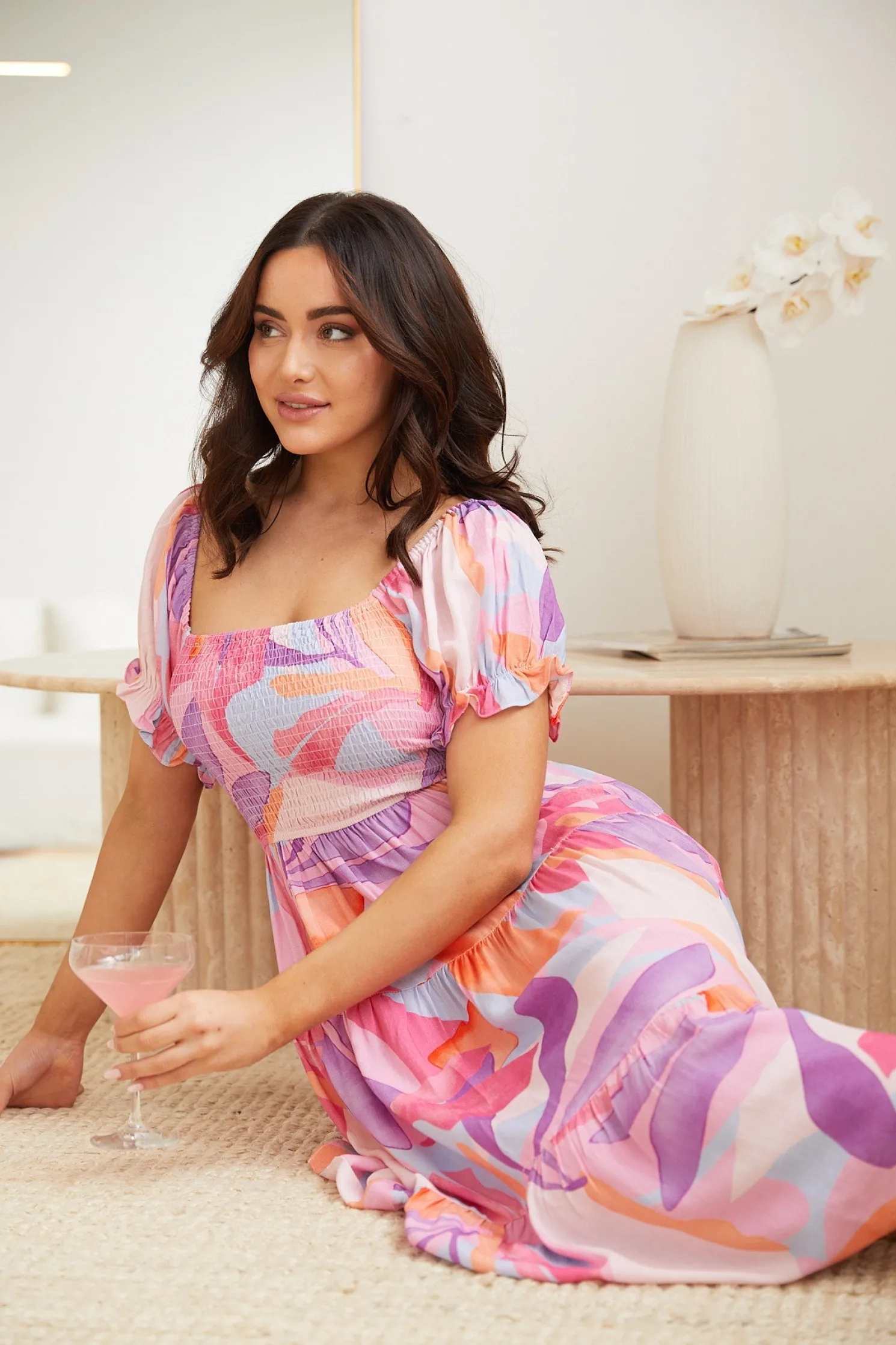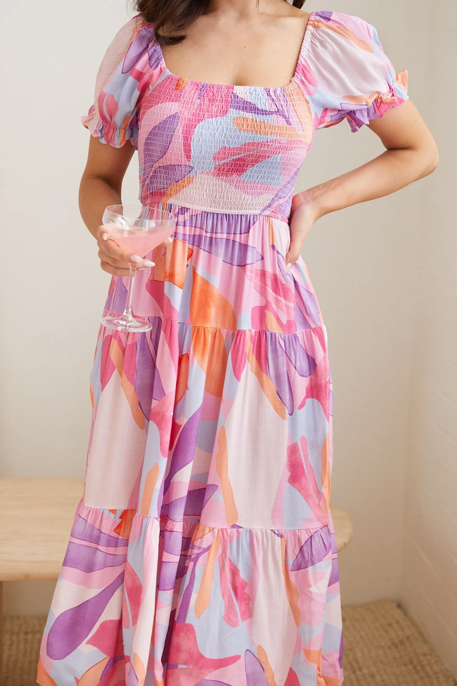 Our Apolline Dress comes in multicoloured prints. Show up in your best self with this midi that features a square neckline, smocked bodice, short frilled sleeves and flowy tiered skirt. Turn heads with a mini statement trapezoid bag and open toe heels!