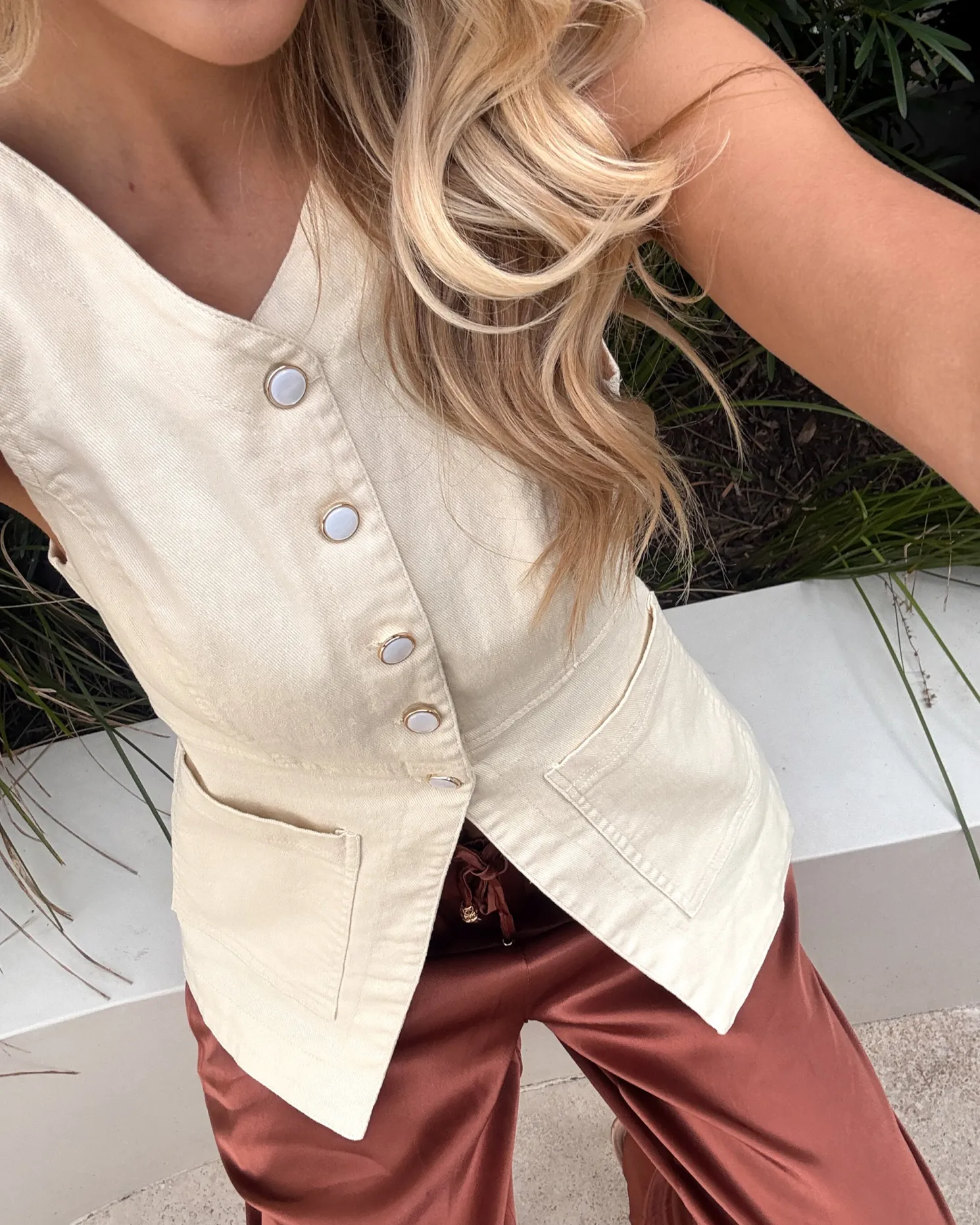 Our Avida Top comes in a beige colour. Your answer to understated sophistication, this piece is designed with a wide v-neckline, centre-front buttons and pockets. Pair it with tailored trousers, dainty gold jewelry, and a “got-this” attitude!